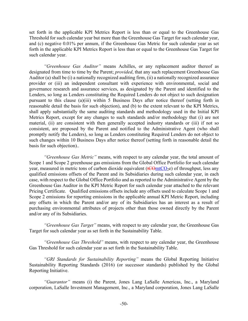-50- set forth in the applicable KPI Metrics Report is less than or equal to the Greenhouse Gas Threshold for such calendar year but more than the Greenhouse Gas Target for such calendar year, and (c) negative 0.01% per annum, if the Greenhouse Gas Metric for such calendar year as set forth in the applicable KPI Metrics Report is less than or equal to the Greenhouse Gas Target for such calendar year. “Greenhouse Gas Auditor” means Achilles, or any replacement auditor thereof as designated from time to time by the Parent; provided, that any such replacement Greenhouse Gas Auditor (a) shall be (i) a nationally recognized auditing firm, (ii) a nationally recognized assurance provider or (iii) an independent consultant with experience with environmental, social and governance research and assurance services, as designated by the Parent and identified to the Lenders, so long as Lenders constituting the Required Lenders do not object to such designation pursuant to this clause (a)(iii) within 5 Business Days after notice thereof (setting forth in reasonable detail the basis for such objection), and (b) to the extent relevant to the KPI Metrics, shall apply substantially the same auditing standards and methodology used in the Initial KPI Metrics Report, except for any changes to such standards and/or methodology that (i) are not material, (ii) are consistent with then generally accepted industry standards or (iii) if not so consistent, are proposed by the Parent and notified to the Administrative Agent (who shall promptly notify the Lenders), so long as Lenders constituting Required Lenders do not object to such changes within 10 Business Days after notice thereof (setting forth in reasonable detail the basis for such objection).. “Greenhouse Gas Metric” means, with respect to any calendar year, the total amount of Scope 1 and Scope 2 greenhouse gas emissions from the Global Office Portfolio for such calendar year, measured in metric tons of carbon dioxide equivalent (tCOmtCO2e) of throughput, less any qualified emissions offsets of the Parent and its Subsidiaries during such calendar year, in each case, with respect to the Global Office Portfolio and as reported to the Administrative Agent by the Greenhouse Gas Auditor in the KPI Metric Report for such calendar year attached to the relevant Pricing Certificate. Qualified emissions offsets include any offsets used to calculate Scope 1 and Scope 2 emissions for reporting emissions in the applicable annual KPI Metric Report, including any offsets in which the Parent and/or any of its Subsidiaries has an interest as a result of purchasing environmental attributes of projects other than those owned directly by the Parent and/or any of its Subsidiaries. “Greenhouse Gas Target” means, with respect to any calendar year, the Greenhouse Gas Target for such calendar year as set forth in the Sustainability Table. “Greenhouse Gas Threshold” means, with respect to any calendar year, the Greenhouse Gas Threshold for such calendar year as set forth in the Sustainability Table. “GRI Standards for Sustainability Reporting” means the Global Reporting Initiative Sustainability Reporting Standards (2016) (or successor standards) published by the Global Reporting Initiative. “Guarantor” means (i) the Parent, Jones Lang LaSalle Americas, Inc., a Maryland corporation, LaSalle Investment Management, Inc., a Maryland corporation, Jones Lang LaSalle