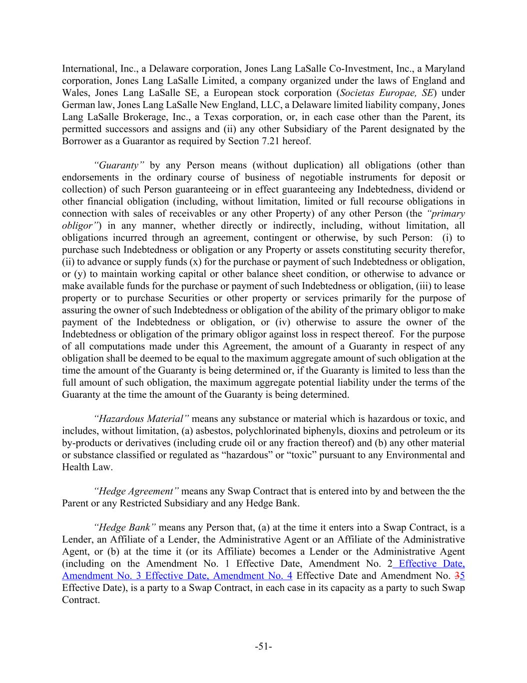 -51- International, Inc., a Delaware corporation, Jones Lang LaSalle Co-Investment, Inc., a Maryland corporation, Jones Lang LaSalle Limited, a company organized under the laws of England and Wales, Jones Lang LaSalle SE, a European stock corporation (Societas Europae, SE) under German law, Jones Lang LaSalle New England, LLC, a Delaware limited liability company, Jones Lang LaSalle Brokerage, Inc., a Texas corporation, or, in each case other than the Parent, its permitted successors and assigns and (ii) any other Subsidiary of the Parent designated by the Borrower as a Guarantor as required by Section 7.21 hereof. “Guaranty” by any Person means (without duplication) all obligations (other than endorsements in the ordinary course of business of negotiable instruments for deposit or collection) of such Person guaranteeing or in effect guaranteeing any Indebtedness, dividend or other financial obligation (including, without limitation, limited or full recourse obligations in connection with sales of receivables or any other Property) of any other Person (the “primary obligor”) in any manner, whether directly or indirectly, including, without limitation, all obligations incurred through an agreement, contingent or otherwise, by such Person: (i) to purchase such Indebtedness or obligation or any Property or assets constituting security therefor, (ii) to advance or supply funds (x) for the purchase or payment of such Indebtedness or obligation, or (y) to maintain working capital or other balance sheet condition, or otherwise to advance or make available funds for the purchase or payment of such Indebtedness or obligation, (iii) to lease property or to purchase Securities or other property or services primarily for the purpose of assuring the owner of such Indebtedness or obligation of the ability of the primary obligor to make payment of the Indebtedness or obligation, or (iv) otherwise to assure the owner of the Indebtedness or obligation of the primary obligor against loss in respect thereof. For the purpose of all computations made under this Agreement, the amount of a Guaranty in respect of any obligation shall be deemed to be equal to the maximum aggregate amount of such obligation at the time the amount of the Guaranty is being determined or, if the Guaranty is limited to less than the full amount of such obligation, the maximum aggregate potential liability under the terms of the Guaranty at the time the amount of the Guaranty is being determined. “Hazardous Material” means any substance or material which is hazardous or toxic, and includes, without limitation, (a) asbestos, polychlorinated biphenyls, dioxins and petroleum or its by-products or derivatives (including crude oil or any fraction thereof) and (b) any other material or substance classified or regulated as “hazardous” or “toxic” pursuant to any Environmental and Health Law. “Hedge Agreement” means any Swap Contract that is entered into by and between the the Parent or any Restricted Subsidiary and any Hedge Bank. “Hedge Bank” means any Person that, (a) at the time it enters into a Swap Contract, is a Lender, an Affiliate of a Lender, the Administrative Agent or an Affiliate of the Administrative Agent, or (b) at the time it (or its Affiliate) becomes a Lender or the Administrative Agent (including on the Amendment No. 1 Effective Date, Amendment No. 2 Effective Date, Amendment No. 3 Effective Date, Amendment No. 4 Effective Date and Amendment No. 35 Effective Date), is a party to a Swap Contract, in each case in its capacity as a party to such Swap Contract.