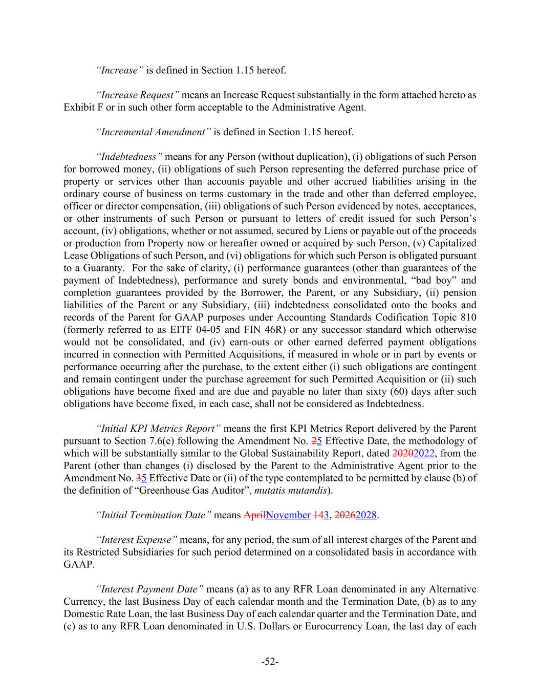 -52- “Increase” is defined in Section 1.15 hereof. “Increase Request” means an Increase Request substantially in the form attached hereto as Exhibit F or in such other form acceptable to the Administrative Agent. “Incremental Amendment” is defined in Section 1.15 hereof. “Indebtedness” means for any Person (without duplication), (i) obligations of such Person for borrowed money, (ii) obligations of such Person representing the deferred purchase price of property or services other than accounts payable and other accrued liabilities arising in the ordinary course of business on terms customary in the trade and other than deferred employee, officer or director compensation, (iii) obligations of such Person evidenced by notes, acceptances, or other instruments of such Person or pursuant to letters of credit issued for such Person’s account, (iv) obligations, whether or not assumed, secured by Liens or payable out of the proceeds or production from Property now or hereafter owned or acquired by such Person, (v) Capitalized Lease Obligations of such Person, and (vi) obligations for which such Person is obligated pursuant to a Guaranty. For the sake of clarity, (i) performance guarantees (other than guarantees of the payment of Indebtedness), performance and surety bonds and environmental, “bad boy” and completion guarantees provided by the Borrower, the Parent, or any Subsidiary, (ii) pension liabilities of the Parent or any Subsidiary, (iii) indebtedness consolidated onto the books and records of the Parent for GAAP purposes under Accounting Standards Codification Topic 810 (formerly referred to as EITF 04-05 and FIN 46R) or any successor standard which otherwise would not be consolidated, and (iv) earn-outs or other earned deferred payment obligations incurred in connection with Permitted Acquisitions, if measured in whole or in part by events or performance occurring after the purchase, to the extent either (i) such obligations are contingent and remain contingent under the purchase agreement for such Permitted Acquisition or (ii) such obligations have become fixed and are due and payable no later than sixty (60) days after such obligations have become fixed, in each case, shall not be considered as Indebtedness. “Initial KPI Metrics Report” means the first KPI Metrics Report delivered by the Parent pursuant to Section 7.6(e) following the Amendment No. 25 Effective Date, the methodology of which will be substantially similar to the Global Sustainability Report, dated 20202022, from the Parent (other than changes (i) disclosed by the Parent to the Administrative Agent prior to the Amendment No. 35 Effective Date or (ii) of the type contemplated to be permitted by clause (b) of the definition of “Greenhouse Gas Auditor”, mutatis mutandis). “Initial Termination Date” means AprilNovember 143, 20262028. “Interest Expense” means, for any period, the sum of all interest charges of the Parent and its Restricted Subsidiaries for such period determined on a consolidated basis in accordance with GAAP. “Interest Payment Date” means (a) as to any RFR Loan denominated in any Alternative Currency, the last Business Day of each calendar month and the Termination Date, (b) as to any Domestic Rate Loan, the last Business Day of each calendar quarter and the Termination Date, and (c) as to any RFR Loan denominated in U.S. Dollars or Eurocurrency Loan, the last day of each