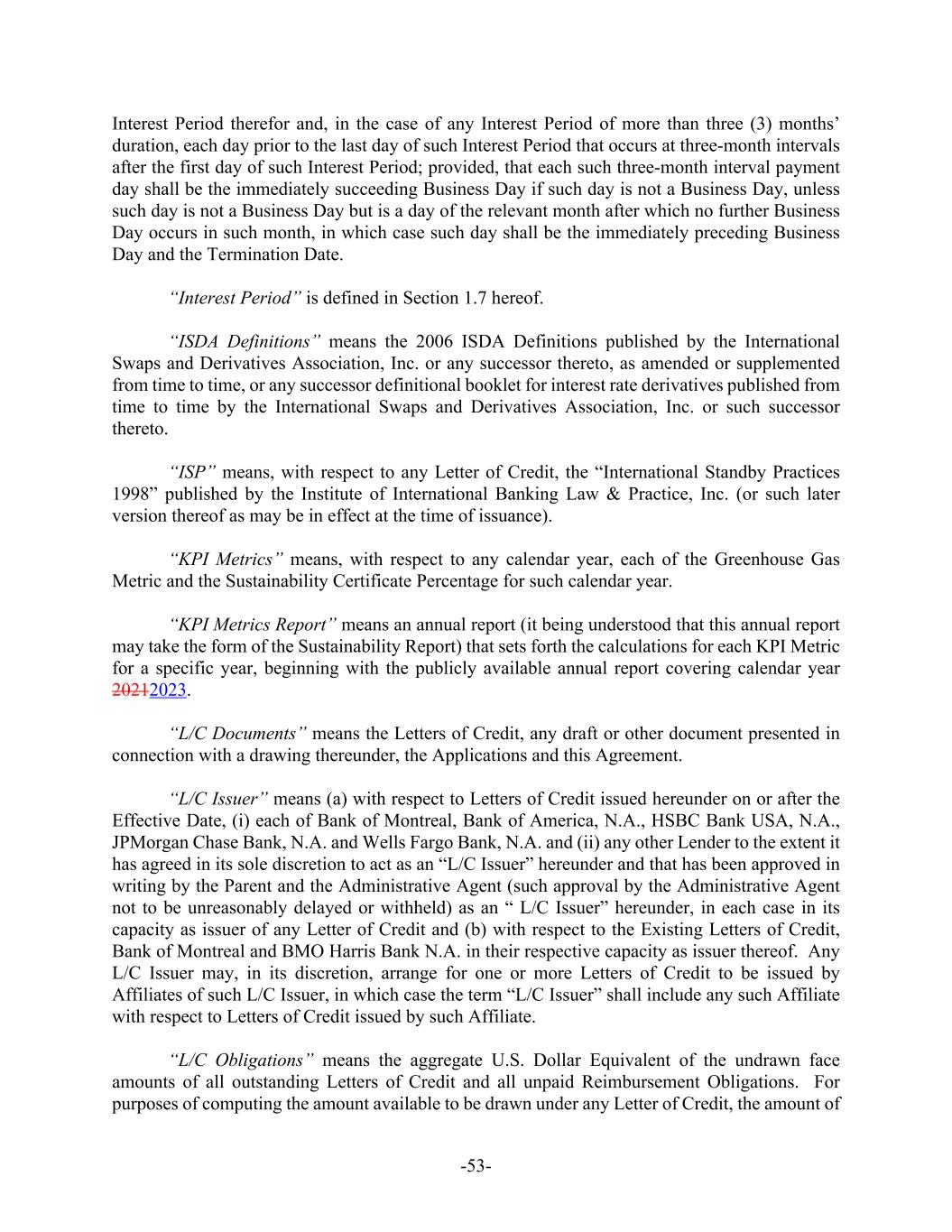 -53- Interest Period therefor and, in the case of any Interest Period of more than three (3) months’ duration, each day prior to the last day of such Interest Period that occurs at three-month intervals after the first day of such Interest Period; provided, that each such three-month interval payment day shall be the immediately succeeding Business Day if such day is not a Business Day, unless such day is not a Business Day but is a day of the relevant month after which no further Business Day occurs in such month, in which case such day shall be the immediately preceding Business Day and the Termination Date. “Interest Period” is defined in Section 1.7 hereof. “ISDA Definitions” means the 2006 ISDA Definitions published by the International Swaps and Derivatives Association, Inc. or any successor thereto, as amended or supplemented from time to time, or any successor definitional booklet for interest rate derivatives published from time to time by the International Swaps and Derivatives Association, Inc. or such successor thereto. “ISP” means, with respect to any Letter of Credit, the “International Standby Practices 1998” published by the Institute of International Banking Law & Practice, Inc. (or such later version thereof as may be in effect at the time of issuance). “KPI Metrics” means, with respect to any calendar year, each of the Greenhouse Gas Metric and the Sustainability Certificate Percentage for such calendar year. “KPI Metrics Report” means an annual report (it being understood that this annual report may take the form of the Sustainability Report) that sets forth the calculations for each KPI Metric for a specific year, beginning with the publicly available annual report covering calendar year 20212023. “L/C Documents” means the Letters of Credit, any draft or other document presented in connection with a drawing thereunder, the Applications and this Agreement. “L/C Issuer” means (a) with respect to Letters of Credit issued hereunder on or after the Effective Date, (i) each of Bank of Montreal, Bank of America, N.A., HSBC Bank USA, N.A., JPMorgan Chase Bank, N.A. and Wells Fargo Bank, N.A. and (ii) any other Lender to the extent it has agreed in its sole discretion to act as an “L/C Issuer” hereunder and that has been approved in writing by the Parent and the Administrative Agent (such approval by the Administrative Agent not to be unreasonably delayed or withheld) as an “ L/C Issuer” hereunder, in each case in its capacity as issuer of any Letter of Credit and (b) with respect to the Existing Letters of Credit, Bank of Montreal and BMO Harris Bank N.A. in their respective capacity as issuer thereof. Any L/C Issuer may, in its discretion, arrange for one or more Letters of Credit to be issued by Affiliates of such L/C Issuer, in which case the term “L/C Issuer” shall include any such Affiliate with respect to Letters of Credit issued by such Affiliate. “L/C Obligations” means the aggregate U.S. Dollar Equivalent of the undrawn face amounts of all outstanding Letters of Credit and all unpaid Reimbursement Obligations. For purposes of computing the amount available to be drawn under any Letter of Credit, the amount of