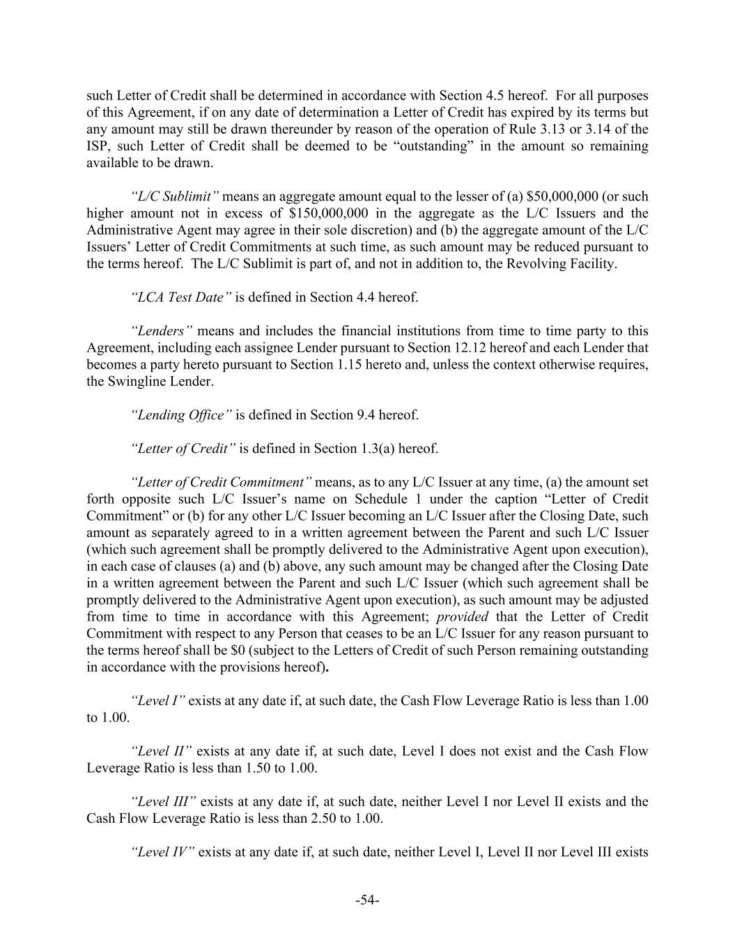 -54- such Letter of Credit shall be determined in accordance with Section 4.5 hereof. For all purposes of this Agreement, if on any date of determination a Letter of Credit has expired by its terms but any amount may still be drawn thereunder by reason of the operation of Rule 3.13 or 3.14 of the ISP, such Letter of Credit shall be deemed to be “outstanding” in the amount so remaining available to be drawn. “L/C Sublimit” means an aggregate amount equal to the lesser of (a) $50,000,000 (or such higher amount not in excess of $150,000,000 in the aggregate as the L/C Issuers and the Administrative Agent may agree in their sole discretion) and (b) the aggregate amount of the L/C Issuers’ Letter of Credit Commitments at such time, as such amount may be reduced pursuant to the terms hereof. The L/C Sublimit is part of, and not in addition to, the Revolving Facility. “LCA Test Date” is defined in Section 4.4 hereof. “Lenders” means and includes the financial institutions from time to time party to this Agreement, including each assignee Lender pursuant to Section 12.12 hereof and each Lender that becomes a party hereto pursuant to Section 1.15 hereto and, unless the context otherwise requires, the Swingline Lender. “Lending Office” is defined in Section 9.4 hereof. “Letter of Credit” is defined in Section 1.3(a) hereof. “Letter of Credit Commitment” means, as to any L/C Issuer at any time, (a) the amount set forth opposite such L/C Issuer’s name on Schedule 1 under the caption “Letter of Credit Commitment” or (b) for any other L/C Issuer becoming an L/C Issuer after the Closing Date, such amount as separately agreed to in a written agreement between the Parent and such L/C Issuer (which such agreement shall be promptly delivered to the Administrative Agent upon execution), in each case of clauses (a) and (b) above, any such amount may be changed after the Closing Date in a written agreement between the Parent and such L/C Issuer (which such agreement shall be promptly delivered to the Administrative Agent upon execution), as such amount may be adjusted from time to time in accordance with this Agreement; provided that the Letter of Credit Commitment with respect to any Person that ceases to be an L/C Issuer for any reason pursuant to the terms hereof shall be $0 (subject to the Letters of Credit of such Person remaining outstanding in accordance with the provisions hereof). “Level I” exists at any date if, at such date, the Cash Flow Leverage Ratio is less than 1.00 to 1.00. “Level II” exists at any date if, at such date, Level I does not exist and the Cash Flow Leverage Ratio is less than 1.50 to 1.00. “Level III” exists at any date if, at such date, neither Level I nor Level II exists and the Cash Flow Leverage Ratio is less than 2.50 to 1.00. “Level IV” exists at any date if, at such date, neither Level I, Level II nor Level III exists
