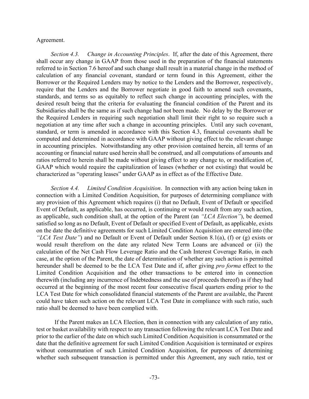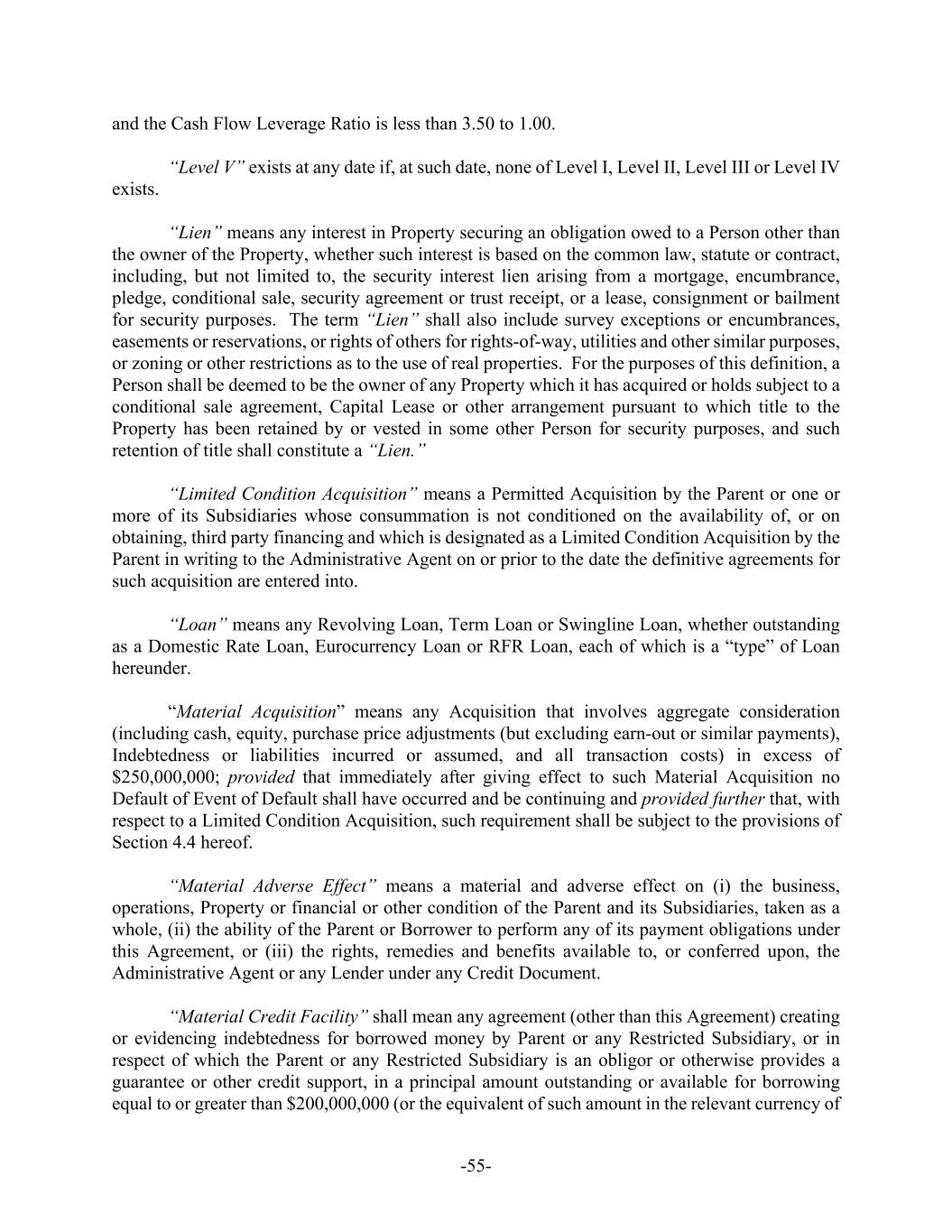 -55- and the Cash Flow Leverage Ratio is less than 3.50 to 1.00. “Level V” exists at any date if, at such date, none of Level I, Level II, Level III or Level IV exists. “Lien” means any interest in Property securing an obligation owed to a Person other than the owner of the Property, whether such interest is based on the common law, statute or contract, including, but not limited to, the security interest lien arising from a mortgage, encumbrance, pledge, conditional sale, security agreement or trust receipt, or a lease, consignment or bailment for security purposes. The term “Lien” shall also include survey exceptions or encumbrances, easements or reservations, or rights of others for rights-of-way, utilities and other similar purposes, or zoning or other restrictions as to the use of real properties. For the purposes of this definition, a Person shall be deemed to be the owner of any Property which it has acquired or holds subject to a conditional sale agreement, Capital Lease or other arrangement pursuant to which title to the Property has been retained by or vested in some other Person for security purposes, and such retention of title shall constitute a “Lien.” “Limited Condition Acquisition” means a Permitted Acquisition by the Parent or one or more of its Subsidiaries whose consummation is not conditioned on the availability of, or on obtaining, third party financing and which is designated as a Limited Condition Acquisition by the Parent in writing to the Administrative Agent on or prior to the date the definitive agreements for such acquisition are entered into. “Loan” means any Revolving Loan, Term Loan or Swingline Loan, whether outstanding as a Domestic Rate Loan, Eurocurrency Loan or RFR Loan, each of which is a “type” of Loan hereunder. “Material Acquisition” means any Acquisition that involves aggregate consideration (including cash, equity, purchase price adjustments (but excluding earn-out or similar payments), Indebtedness or liabilities incurred or assumed, and all transaction costs) in excess of $250,000,000; provided that immediately after giving effect to such Material Acquisition no Default of Event of Default shall have occurred and be continuing and provided further that, with respect to a Limited Condition Acquisition, such requirement shall be subject to the provisions of Section 4.4 hereof. “Material Adverse Effect” means a material and adverse effect on (i) the business, operations, Property or financial or other condition of the Parent and its Subsidiaries, taken as a whole, (ii) the ability of the Parent or Borrower to perform any of its payment obligations under this Agreement, or (iii) the rights, remedies and benefits available to, or conferred upon, the Administrative Agent or any Lender under any Credit Document. “Material Credit Facility” shall mean any agreement (other than this Agreement) creating or evidencing indebtedness for borrowed money by Parent or any Restricted Subsidiary, or in respect of which the Parent or any Restricted Subsidiary is an obligor or otherwise provides a guarantee or other credit support, in a principal amount outstanding or available for borrowing equal to or greater than $200,000,000 (or the equivalent of such amount in the relevant currency of