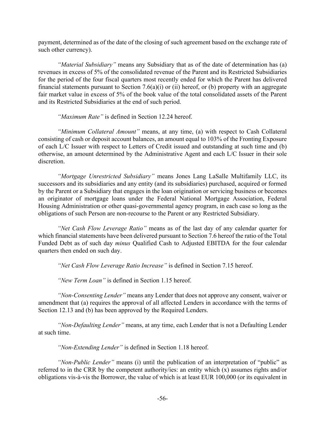 -56- payment, determined as of the date of the closing of such agreement based on the exchange rate of such other currency). “Material Subsidiary” means any Subsidiary that as of the date of determination has (a) revenues in excess of 5% of the consolidated revenue of the Parent and its Restricted Subsidiaries for the period of the four fiscal quarters most recently ended for which the Parent has delivered financial statements pursuant to Section 7.6(a)(i) or (ii) hereof, or (b) property with an aggregate fair market value in excess of 5% of the book value of the total consolidated assets of the Parent and its Restricted Subsidiaries at the end of such period. “Maximum Rate” is defined in Section 12.24 hereof. “Minimum Collateral Amount” means, at any time, (a) with respect to Cash Collateral consisting of cash or deposit account balances, an amount equal to 103% of the Fronting Exposure of each L/C Issuer with respect to Letters of Credit issued and outstanding at such time and (b) otherwise, an amount determined by the Administrative Agent and each L/C Issuer in their sole discretion. “Mortgage Unrestricted Subsidiary” means Jones Lang LaSalle Multifamily LLC, its successors and its subsidiaries and any entity (and its subsidiaries) purchased, acquired or formed by the Parent or a Subsidiary that engages in the loan origination or servicing business or becomes an originator of mortgage loans under the Federal National Mortgage Association, Federal Housing Administration or other quasi-governmental agency program, in each case so long as the obligations of such Person are non-recourse to the Parent or any Restricted Subsidiary. “Net Cash Flow Leverage Ratio” means as of the last day of any calendar quarter for which financial statements have been delivered pursuant to Section 7.6 hereof the ratio of the Total Funded Debt as of such day minus Qualified Cash to Adjusted EBITDA for the four calendar quarters then ended on such day. “Net Cash Flow Leverage Ratio Increase” is defined in Section 7.15 hereof. “New Term Loan” is defined in Section 1.15 hereof. “Non-Consenting Lender” means any Lender that does not approve any consent, waiver or amendment that (a) requires the approval of all affected Lenders in accordance with the terms of Section 12.13 and (b) has been approved by the Required Lenders. “Non-Defaulting Lender” means, at any time, each Lender that is not a Defaulting Lender at such time. “Non-Extending Lender” is defined in Section 1.18 hereof. “Non-Public Lender” means (i) until the publication of an interpretation of “public” as referred to in the CRR by the competent authority/ies: an entity which (x) assumes rights and/or obligations vis-à-vis the Borrower, the value of which is at least EUR 100,000 (or its equivalent in