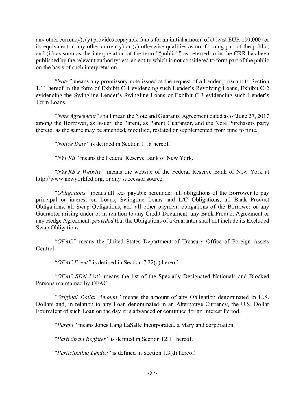 -57- any other currency), (y) provides repayable funds for an initial amount of at least EUR 100,000 (or its equivalent in any other currency) or (z) otherwise qualifies as not forming part of the public; and (ii) as soon as the interpretation of the term "“public"” as referred to in the CRR has been published by the relevant authority/ies: an entity which is not considered to form part of the public on the basis of such interpretation. “Note” means any promissory note issued at the request of a Lender pursuant to Section 1.11 hereof in the form of Exhibit C-1 evidencing such Lender’s Revolving Loans, Exhibit C-2 evidencing the Swingline Lender’s Swingline Loans or Exhibit C-3 evidencing such Lender’s Term Loans. “Note Agreement” shall mean the Note and Guaranty Agreement dated as of June 27, 2017 among the Borrower, as Issuer, the Parent, as Parent Guarantor, and the Note Purchasers party thereto, as the same may be amended, modified, restated or supplemented from time to time. “Notice Date” is defined in Section 1.18 hereof. “NYFRB” means the Federal Reserve Bank of New York. “NYFRB’s Website” means the website of the Federal Reserve Bank of New York at http://www.newyorkfed.org, or any successor source. “Obligations” means all fees payable hereunder, all obligations of the Borrower to pay principal or interest on Loans, Swingline Loans and L/C Obligations, all Bank Product Obligations, all Swap Obligations, and all other payment obligations of the Borrower or any Guarantor arising under or in relation to any Credit Document, any Bank Product Agreement or any Hedge Agreement, provided that the Obligations of a Guarantor shall not include its Excluded Swap Obligations. “OFAC” means the United States Department of Treasury Office of Foreign Assets Control. “OFAC Event” is defined in Section 7.22(c) hereof. “OFAC SDN List” means the list of the Specially Designated Nationals and Blocked Persons maintained by OFAC. “Original Dollar Amount” means the amount of any Obligation denominated in U.S. Dollars and, in relation to any Loan denominated in an Alternative Currency, the U.S. Dollar Equivalent of such Loan on the day it is advanced or continued for an Interest Period. “Parent” means Jones Lang LaSalle Incorporated, a Maryland corporation. “Participant Register” is defined in Section 12.11 hereof. “Participating Lender” is defined in Section 1.3(d) hereof.