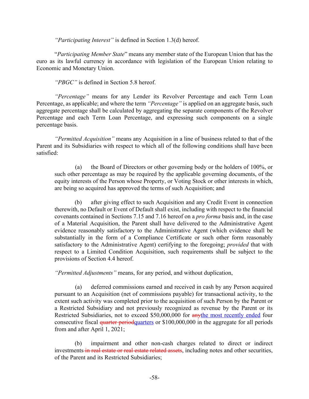 -58- “Participating Interest” is defined in Section 1.3(d) hereof. “Participating Member State” means any member state of the European Union that has the euro as its lawful currency in accordance with legislation of the European Union relating to Economic and Monetary Union. “PBGC” is defined in Section 5.8 hereof. “Percentage” means for any Lender its Revolver Percentage and each Term Loan Percentage, as applicable; and where the term “Percentage” is applied on an aggregate basis, such aggregate percentage shall be calculated by aggregating the separate components of the Revolver Percentage and each Term Loan Percentage, and expressing such components on a single percentage basis. “Permitted Acquisition” means any Acquisition in a line of business related to that of the Parent and its Subsidiaries with respect to which all of the following conditions shall have been satisfied: (a) the Board of Directors or other governing body or the holders of 100%, or such other percentage as may be required by the applicable governing documents, of the equity interests of the Person whose Property, or Voting Stock or other interests in which, are being so acquired has approved the terms of such Acquisition; and (b) after giving effect to such Acquisition and any Credit Event in connection therewith, no Default or Event of Default shall exist, including with respect to the financial covenants contained in Sections 7.15 and 7.16 hereof on a pro forma basis and, in the case of a Material Acquisition, the Parent shall have delivered to the Administrative Agent evidence reasonably satisfactory to the Administrative Agent (which evidence shall be substantially in the form of a Compliance Certificate or such other form reasonably satisfactory to the Administrative Agent) certifying to the foregoing; provided that with respect to a Limited Condition Acquisition, such requirements shall be subject to the provisions of Section 4.4 hereof. “Permitted Adjustments” means, for any period, and without duplication, (a) deferred commissions earned and received in cash by any Person acquired pursuant to an Acquisition (net of commissions payable) for transactional activity, to the extent such activity was completed prior to the acquisition of such Person by the Parent or a Restricted Subsidiary and not previously recognized as revenue by the Parent or its Restricted Subsidiaries, not to exceed $50,000,000 for anythe most recently ended four consecutive fiscal quarter periodquarters or $100,000,000 in the aggregate for all periods from and after April 1, 2021; (b) impairment and other non-cash charges related to direct or indirect investments in real estate or real estate related assets, including notes and other securities, of the Parent and its Restricted Subsidiaries;