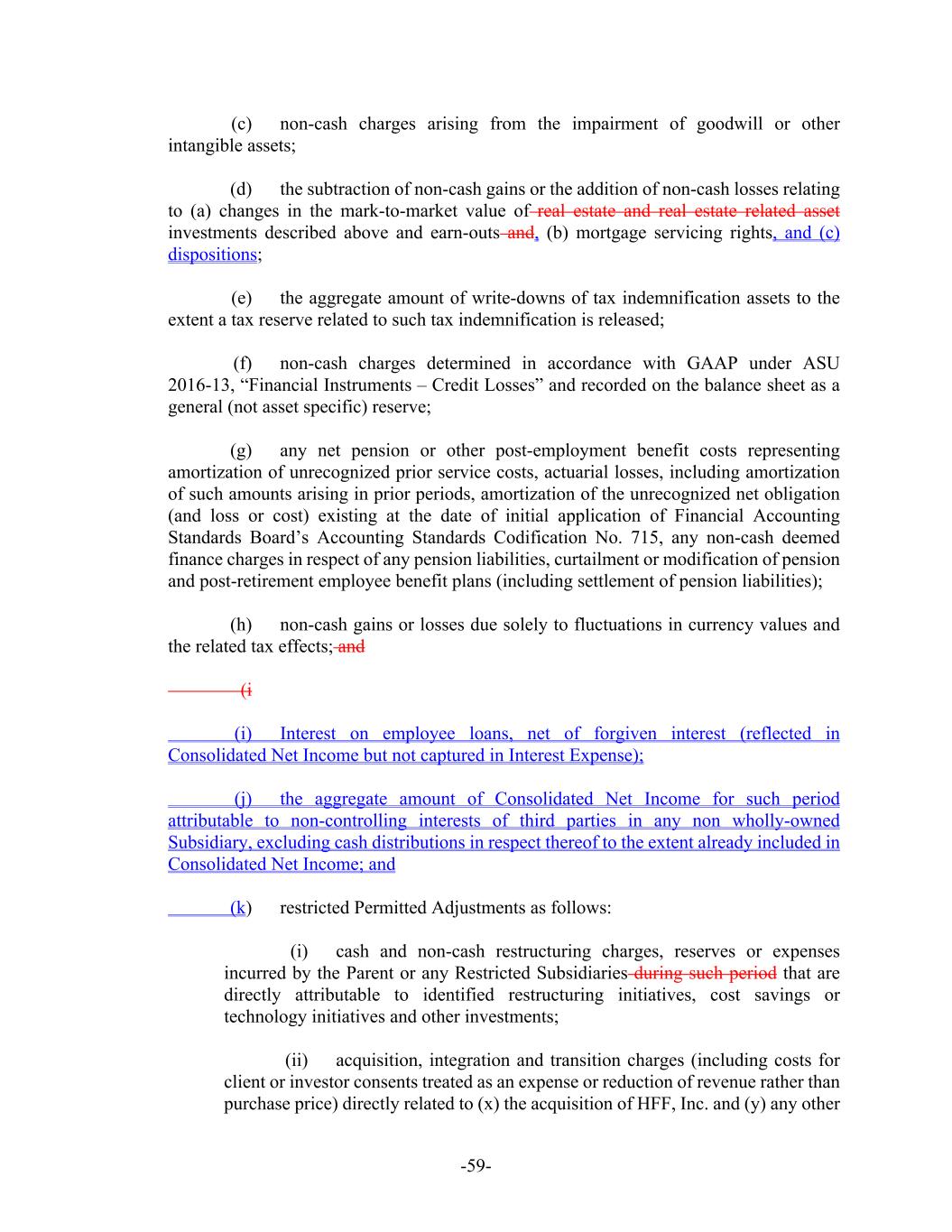 -59- (c) non-cash charges arising from the impairment of goodwill or other intangible assets; (d) the subtraction of non-cash gains or the addition of non-cash losses relating to (a) changes in the mark-to-market value of real estate and real estate related asset investments described above and earn-outs and, (b) mortgage servicing rights, and (c) dispositions; (e) the aggregate amount of write-downs of tax indemnification assets to the extent a tax reserve related to such tax indemnification is released; (f) non-cash charges determined in accordance with GAAP under ASU 2016-13, “Financial Instruments – Credit Losses” and recorded on the balance sheet as a general (not asset specific) reserve; (g) any net pension or other post-employment benefit costs representing amortization of unrecognized prior service costs, actuarial losses, including amortization of such amounts arising in prior periods, amortization of the unrecognized net obligation (and loss or cost) existing at the date of initial application of Financial Accounting Standards Board’s Accounting Standards Codification No. 715, any non-cash deemed finance charges in respect of any pension liabilities, curtailment or modification of pension and post-retirement employee benefit plans (including settlement of pension liabilities); (h) non-cash gains or losses due solely to fluctuations in currency values and the related tax effects; and (i (i) Interest on employee loans, net of forgiven interest (reflected in Consolidated Net Income but not captured in Interest Expense); (j) the aggregate amount of Consolidated Net Income for such period attributable to non-controlling interests of third parties in any non wholly-owned Subsidiary, excluding cash distributions in respect thereof to the extent already included in Consolidated Net Income; and (k) restricted Permitted Adjustments as follows: (i) cash and non-cash restructuring charges, reserves or expenses incurred by the Parent or any Restricted Subsidiaries during such period that are directly attributable to identified restructuring initiatives, cost savings or technology initiatives and other investments; (ii) acquisition, integration and transition charges (including costs for client or investor consents treated as an expense or reduction of revenue rather than purchase price) directly related to (x) the acquisition of HFF, Inc. and (y) any other