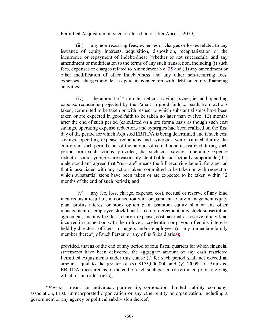 -60- Permitted Acquisition pursued or closed on or after April 1, 2020; (iii) any non-recurring fees, expenses or charges or losses related to any issuance of equity interests, acquisition, disposition, recapitalization or the incurrence or repayment of Indebtedness (whether or not successful), and any amendment or modification to the terms of any such transaction, including (i) such fees, expenses or charges related to Amendment No. 35 and (ii) any amendment or other modification of other Indebtedness and any other non-recurring fees, expenses, charges and losses paid in connection with debt or equity financing activities; (iv) the amount of “run rate” net cost savings, synergies and operating expense reductions projected by the Parent in good faith to result from actions taken, committed to be taken or with respect to which substantial steps have been taken or are expected in good faith to be taken no later than twelve (12) months after the end of such period (calculated on a pro forma basis as though such cost savings, operating expense reductions and synergies had been realized on the first day of the period for which Adjusted EBITDA is being determined and if such cost savings, operating expense reductions and synergies were realized during the entirety of such period), net of the amount of actual benefits realized during such period from such actions; provided, that such cost savings, operating expense reductions and synergies are reasonably identifiable and factually supportable (it is understood and agreed that “run-rate” means the full recurring benefit for a period that is associated with any action taken, committed to be taken or with respect to which substantial steps have been taken or are expected to be taken within 12 months of the end of such period); and (v) any fee, loss, charge, expense, cost, accrual or reserve of any kind incurred as a result of, in connection with or pursuant to any management equity plan, profits interest or stock option plan, phantom equity plan or any other management or employee stock benefit plan or agreement, any stock subscription agreement, and any fee, loss, charge, expense, cost, accrual or reserve of any kind incurred in connection with the rollover, acceleration or payout of equity interests held by directors, officers, managers and/or employees (or any immediate family member thereof) of such Person or any of its Subsidiaries); provided, that as of the end of any period of four fiscal quarters for which financial statements have been delivered, the aggregate amount of any cash restricted Permitted Adjustments under this clause (i) for such period shall not exceed an amount equal to the greater of (x) $175,000,000 and (y) 20.0% of Adjusted EBITDA, measured as of the end of each such period (determined prior to giving effect to such add-backs). “Person” means an individual, partnership, corporation, limited liability company, association, trust, unincorporated organization or any other entity or organization, including a government or any agency or political subdivision thereof.