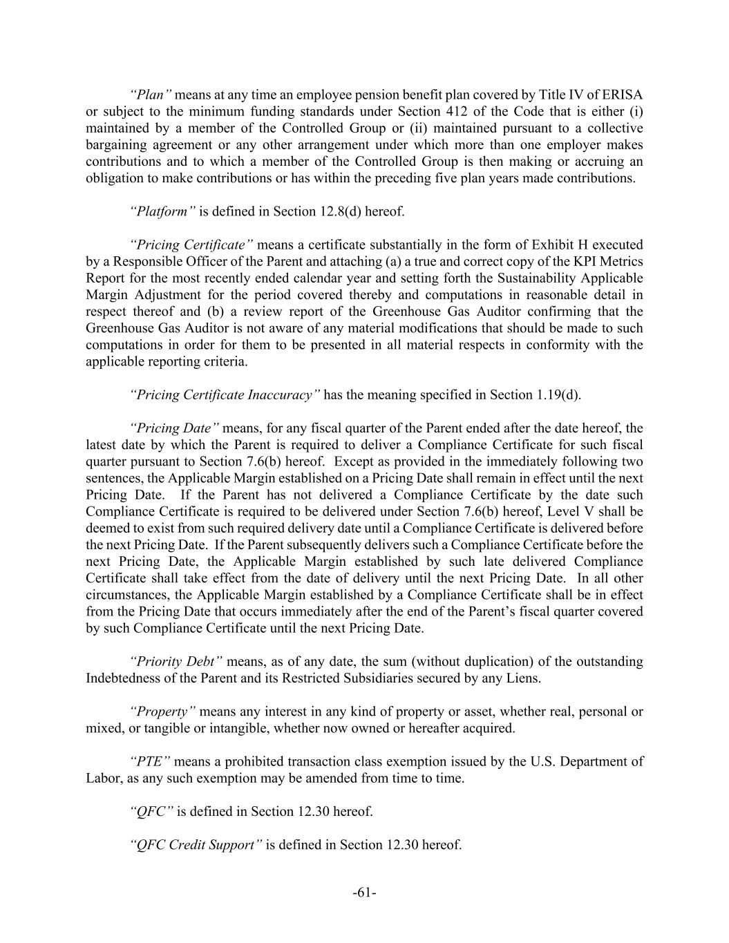 -61- “Plan” means at any time an employee pension benefit plan covered by Title IV of ERISA or subject to the minimum funding standards under Section 412 of the Code that is either (i) maintained by a member of the Controlled Group or (ii) maintained pursuant to a collective bargaining agreement or any other arrangement under which more than one employer makes contributions and to which a member of the Controlled Group is then making or accruing an obligation to make contributions or has within the preceding five plan years made contributions. “Platform” is defined in Section 12.8(d) hereof. “Pricing Certificate” means a certificate substantially in the form of Exhibit H executed by a Responsible Officer of the Parent and attaching (a) a true and correct copy of the KPI Metrics Report for the most recently ended calendar year and setting forth the Sustainability Applicable Margin Adjustment for the period covered thereby and computations in reasonable detail in respect thereof and (b) a review report of the Greenhouse Gas Auditor confirming that the Greenhouse Gas Auditor is not aware of any material modifications that should be made to such computations in order for them to be presented in all material respects in conformity with the applicable reporting criteria. “Pricing Certificate Inaccuracy” has the meaning specified in Section 1.19(d). “Pricing Date” means, for any fiscal quarter of the Parent ended after the date hereof, the latest date by which the Parent is required to deliver a Compliance Certificate for such fiscal quarter pursuant to Section 7.6(b) hereof. Except as provided in the immediately following two sentences, the Applicable Margin established on a Pricing Date shall remain in effect until the next Pricing Date. If the Parent has not delivered a Compliance Certificate by the date such Compliance Certificate is required to be delivered under Section 7.6(b) hereof, Level V shall be deemed to exist from such required delivery date until a Compliance Certificate is delivered before the next Pricing Date. If the Parent subsequently delivers such a Compliance Certificate before the next Pricing Date, the Applicable Margin established by such late delivered Compliance Certificate shall take effect from the date of delivery until the next Pricing Date. In all other circumstances, the Applicable Margin established by a Compliance Certificate shall be in effect from the Pricing Date that occurs immediately after the end of the Parent’s fiscal quarter covered by such Compliance Certificate until the next Pricing Date. “Priority Debt” means, as of any date, the sum (without duplication) of the outstanding Indebtedness of the Parent and its Restricted Subsidiaries secured by any Liens. “Property” means any interest in any kind of property or asset, whether real, personal or mixed, or tangible or intangible, whether now owned or hereafter acquired. “PTE” means a prohibited transaction class exemption issued by the U.S. Department of Labor, as any such exemption may be amended from time to time. “QFC” is defined in Section 12.30 hereof. “QFC Credit Support” is defined in Section 12.30 hereof.