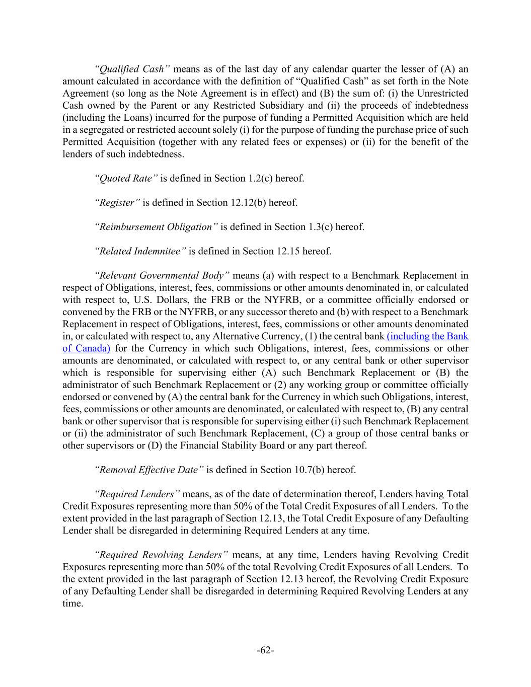 -62- “Qualified Cash” means as of the last day of any calendar quarter the lesser of (A) an amount calculated in accordance with the definition of “Qualified Cash” as set forth in the Note Agreement (so long as the Note Agreement is in effect) and (B) the sum of: (i) the Unrestricted Cash owned by the Parent or any Restricted Subsidiary and (ii) the proceeds of indebtedness (including the Loans) incurred for the purpose of funding a Permitted Acquisition which are held in a segregated or restricted account solely (i) for the purpose of funding the purchase price of such Permitted Acquisition (together with any related fees or expenses) or (ii) for the benefit of the lenders of such indebtedness. “Quoted Rate” is defined in Section 1.2(c) hereof. “Register” is defined in Section 12.12(b) hereof. “Reimbursement Obligation” is defined in Section 1.3(c) hereof. “Related Indemnitee” is defined in Section 12.15 hereof. “Relevant Governmental Body” means (a) with respect to a Benchmark Replacement in respect of Obligations, interest, fees, commissions or other amounts denominated in, or calculated with respect to, U.S. Dollars, the FRB or the NYFRB, or a committee officially endorsed or convened by the FRB or the NYFRB, or any successor thereto and (b) with respect to a Benchmark Replacement in respect of Obligations, interest, fees, commissions or other amounts denominated in, or calculated with respect to, any Alternative Currency, (1) the central bank (including the Bank of Canada) for the Currency in which such Obligations, interest, fees, commissions or other amounts are denominated, or calculated with respect to, or any central bank or other supervisor which is responsible for supervising either (A) such Benchmark Replacement or (B) the administrator of such Benchmark Replacement or (2) any working group or committee officially endorsed or convened by (A) the central bank for the Currency in which such Obligations, interest, fees, commissions or other amounts are denominated, or calculated with respect to, (B) any central bank or other supervisor that is responsible for supervising either (i) such Benchmark Replacement or (ii) the administrator of such Benchmark Replacement, (C) a group of those central banks or other supervisors or (D) the Financial Stability Board or any part thereof. “Removal Effective Date” is defined in Section 10.7(b) hereof. “Required Lenders” means, as of the date of determination thereof, Lenders having Total Credit Exposures representing more than 50% of the Total Credit Exposures of all Lenders. To the extent provided in the last paragraph of Section 12.13, the Total Credit Exposure of any Defaulting Lender shall be disregarded in determining Required Lenders at any time. “Required Revolving Lenders” means, at any time, Lenders having Revolving Credit Exposures representing more than 50% of the total Revolving Credit Exposures of all Lenders. To the extent provided in the last paragraph of Section 12.13 hereof, the Revolving Credit Exposure of any Defaulting Lender shall be disregarded in determining Required Revolving Lenders at any time.