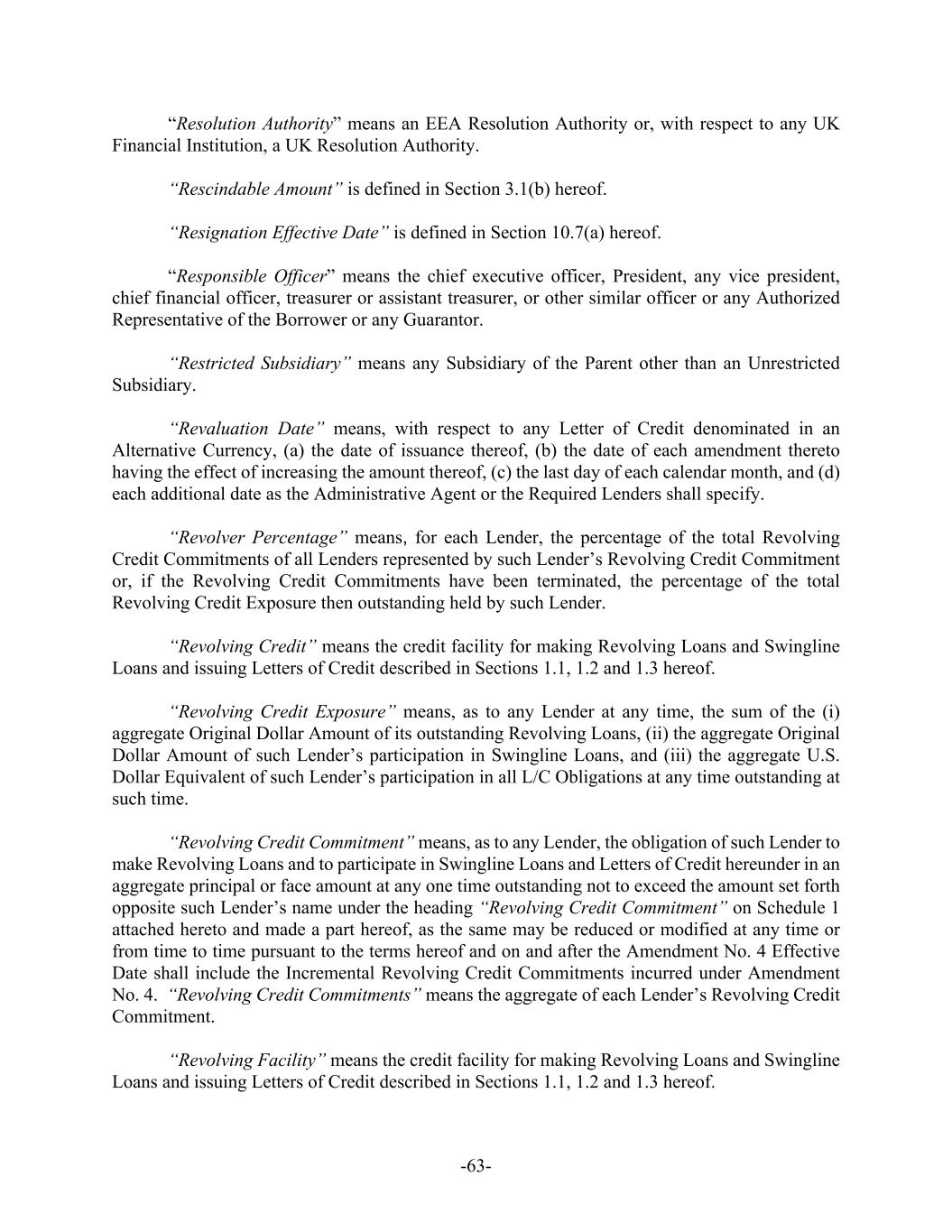 -63- “Resolution Authority” means an EEA Resolution Authority or, with respect to any UK Financial Institution, a UK Resolution Authority. “Rescindable Amount” is defined in Section 3.1(b) hereof. “Resignation Effective Date” is defined in Section 10.7(a) hereof. “Responsible Officer” means the chief executive officer, President, any vice president, chief financial officer, treasurer or assistant treasurer, or other similar officer or any Authorized Representative of the Borrower or any Guarantor. “Restricted Subsidiary” means any Subsidiary of the Parent other than an Unrestricted Subsidiary. “Revaluation Date” means, with respect to any Letter of Credit denominated in an Alternative Currency, (a) the date of issuance thereof, (b) the date of each amendment thereto having the effect of increasing the amount thereof, (c) the last day of each calendar month, and (d) each additional date as the Administrative Agent or the Required Lenders shall specify. “Revolver Percentage” means, for each Lender, the percentage of the total Revolving Credit Commitments of all Lenders represented by such Lender’s Revolving Credit Commitment or, if the Revolving Credit Commitments have been terminated, the percentage of the total Revolving Credit Exposure then outstanding held by such Lender. “Revolving Credit” means the credit facility for making Revolving Loans and Swingline Loans and issuing Letters of Credit described in Sections 1.1, 1.2 and 1.3 hereof. “Revolving Credit Exposure” means, as to any Lender at any time, the sum of the (i) aggregate Original Dollar Amount of its outstanding Revolving Loans, (ii) the aggregate Original Dollar Amount of such Lender’s participation in Swingline Loans, and (iii) the aggregate U.S. Dollar Equivalent of such Lender’s participation in all L/C Obligations at any time outstanding at such time. “Revolving Credit Commitment” means, as to any Lender, the obligation of such Lender to make Revolving Loans and to participate in Swingline Loans and Letters of Credit hereunder in an aggregate principal or face amount at any one time outstanding not to exceed the amount set forth opposite such Lender’s name under the heading “Revolving Credit Commitment” on Schedule 1 attached hereto and made a part hereof, as the same may be reduced or modified at any time or from time to time pursuant to the terms hereof and on and after the Amendment No. 4 Effective Date shall include the Incremental Revolving Credit Commitments incurred under Amendment No. 4. “Revolving Credit Commitments” means the aggregate of each Lender’s Revolving Credit Commitment. “Revolving Facility” means the credit facility for making Revolving Loans and Swingline Loans and issuing Letters of Credit described in Sections 1.1, 1.2 and 1.3 hereof.