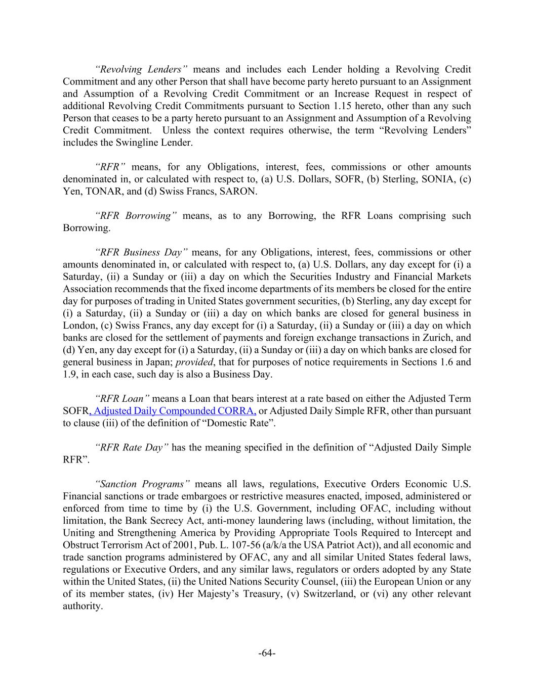 -64- “Revolving Lenders” means and includes each Lender holding a Revolving Credit Commitment and any other Person that shall have become party hereto pursuant to an Assignment and Assumption of a Revolving Credit Commitment or an Increase Request in respect of additional Revolving Credit Commitments pursuant to Section 1.15 hereto, other than any such Person that ceases to be a party hereto pursuant to an Assignment and Assumption of a Revolving Credit Commitment. Unless the context requires otherwise, the term “Revolving Lenders” includes the Swingline Lender. “RFR” means, for any Obligations, interest, fees, commissions or other amounts denominated in, or calculated with respect to, (a) U.S. Dollars, SOFR, (b) Sterling, SONIA, (c) Yen, TONAR, and (d) Swiss Francs, SARON. “RFR Borrowing” means, as to any Borrowing, the RFR Loans comprising such Borrowing. “RFR Business Day” means, for any Obligations, interest, fees, commissions or other amounts denominated in, or calculated with respect to, (a) U.S. Dollars, any day except for (i) a Saturday, (ii) a Sunday or (iii) a day on which the Securities Industry and Financial Markets Association recommends that the fixed income departments of its members be closed for the entire day for purposes of trading in United States government securities, (b) Sterling, any day except for (i) a Saturday, (ii) a Sunday or (iii) a day on which banks are closed for general business in London, (c) Swiss Francs, any day except for (i) a Saturday, (ii) a Sunday or (iii) a day on which banks are closed for the settlement of payments and foreign exchange transactions in Zurich, and (d) Yen, any day except for (i) a Saturday, (ii) a Sunday or (iii) a day on which banks are closed for general business in Japan; provided, that for purposes of notice requirements in Sections 1.6 and 1.9, in each case, such day is also a Business Day. “RFR Loan” means a Loan that bears interest at a rate based on either the Adjusted Term SOFR, Adjusted Daily Compounded CORRA, or Adjusted Daily Simple RFR, other than pursuant to clause (iii) of the definition of “Domestic Rate”. “RFR Rate Day” has the meaning specified in the definition of “Adjusted Daily Simple RFR”. “Sanction Programs” means all laws, regulations, Executive Orders Economic U.S. Financial sanctions or trade embargoes or restrictive measures enacted, imposed, administered or enforced from time to time by (i) the U.S. Government, including OFAC, including without limitation, the Bank Secrecy Act, anti-money laundering laws (including, without limitation, the Uniting and Strengthening America by Providing Appropriate Tools Required to Intercept and Obstruct Terrorism Act of 2001, Pub. L. 107-56 (a/k/a the USA Patriot Act)), and all economic and trade sanction programs administered by OFAC, any and all similar United States federal laws, regulations or Executive Orders, and any similar laws, regulators or orders adopted by any State within the United States, (ii) the United Nations Security Counsel, (iii) the European Union or any of its member states, (iv) Her Majesty’s Treasury, (v) Switzerland, or (vi) any other relevant authority.