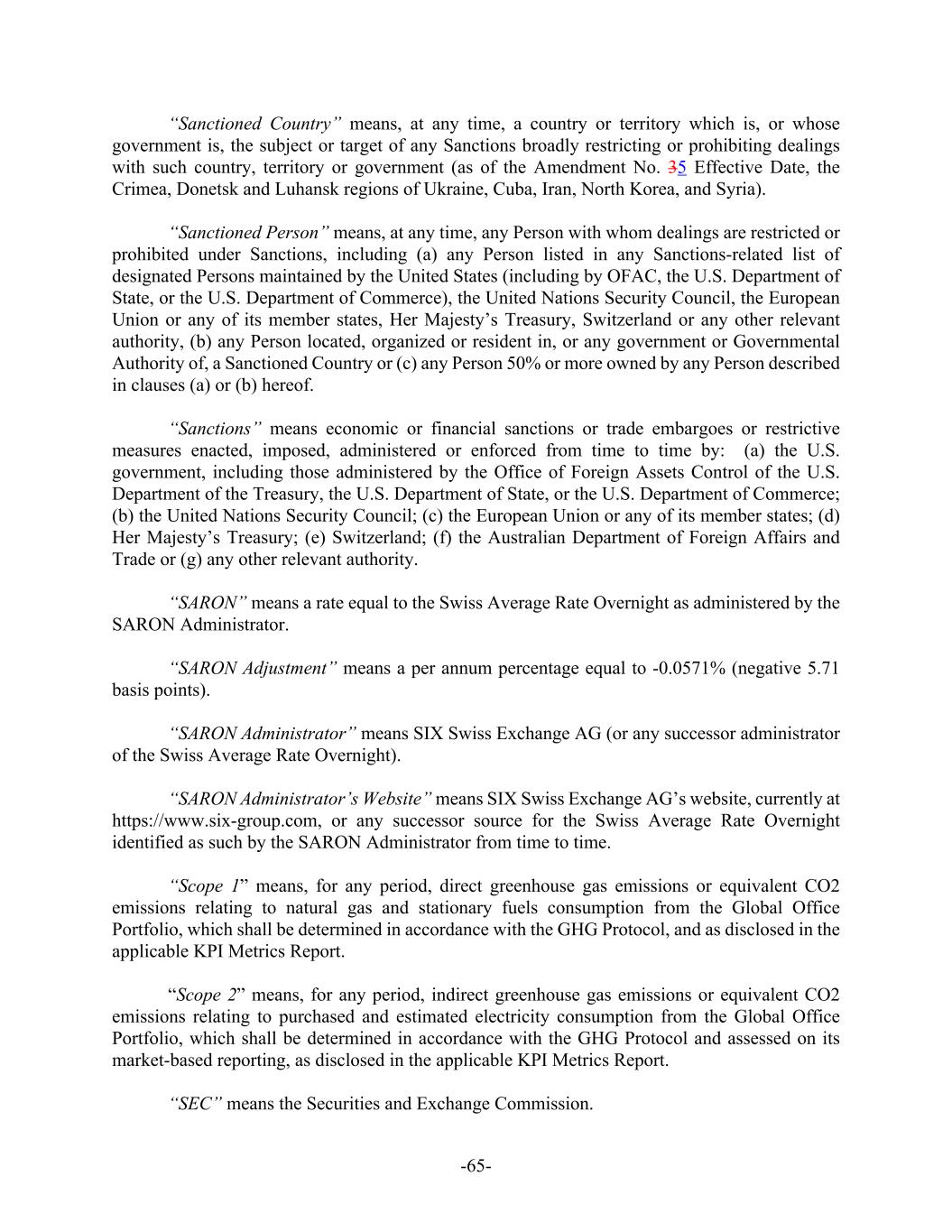 -65- “Sanctioned Country” means, at any time, a country or territory which is, or whose government is, the subject or target of any Sanctions broadly restricting or prohibiting dealings with such country, territory or government (as of the Amendment No. 35 Effective Date, the Crimea, Donetsk and Luhansk regions of Ukraine, Cuba, Iran, North Korea, and Syria). “Sanctioned Person” means, at any time, any Person with whom dealings are restricted or prohibited under Sanctions, including (a) any Person listed in any Sanctions-related list of designated Persons maintained by the United States (including by OFAC, the U.S. Department of State, or the U.S. Department of Commerce), the United Nations Security Council, the European Union or any of its member states, Her Majesty’s Treasury, Switzerland or any other relevant authority, (b) any Person located, organized or resident in, or any government or Governmental Authority of, a Sanctioned Country or (c) any Person 50% or more owned by any Person described in clauses (a) or (b) hereof. “Sanctions” means economic or financial sanctions or trade embargoes or restrictive measures enacted, imposed, administered or enforced from time to time by: (a) the U.S. government, including those administered by the Office of Foreign Assets Control of the U.S. Department of the Treasury, the U.S. Department of State, or the U.S. Department of Commerce; (b) the United Nations Security Council; (c) the European Union or any of its member states; (d) Her Majesty’s Treasury; (e) Switzerland; (f) the Australian Department of Foreign Affairs and Trade or (g) any other relevant authority. “SARON” means a rate equal to the Swiss Average Rate Overnight as administered by the SARON Administrator. “SARON Adjustment” means a per annum percentage equal to -0.0571% (negative 5.71 basis points). “SARON Administrator” means SIX Swiss Exchange AG (or any successor administrator of the Swiss Average Rate Overnight). “SARON Administrator’s Website” means SIX Swiss Exchange AG’s website, currently at https://www.six-group.com, or any successor source for the Swiss Average Rate Overnight identified as such by the SARON Administrator from time to time. “Scope 1” means, for any period, direct greenhouse gas emissions or equivalent CO2 emissions relating to natural gas and stationary fuels consumption from the Global Office Portfolio, which shall be determined in accordance with the GHG Protocol, and as disclosed in the applicable KPI Metrics Report. “Scope 2” means, for any period, indirect greenhouse gas emissions or equivalent CO2 emissions relating to purchased and estimated electricity consumption from the Global Office Portfolio, which shall be determined in accordance with the GHG Protocol and assessed on its market-based reporting, as disclosed in the applicable KPI Metrics Report. “SEC” means the Securities and Exchange Commission.