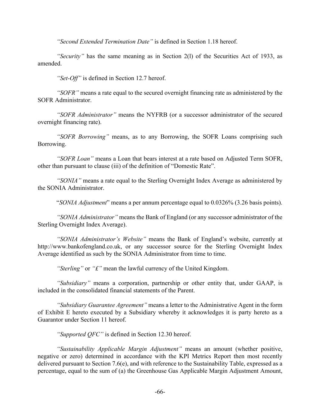 -66- “Second Extended Termination Date” is defined in Section 1.18 hereof. “Security” has the same meaning as in Section 2(l) of the Securities Act of 1933, as amended. “Set-Off” is defined in Section 12.7 hereof. “SOFR” means a rate equal to the secured overnight financing rate as administered by the SOFR Administrator. “SOFR Administrator” means the NYFRB (or a successor administrator of the secured overnight financing rate). “SOFR Borrowing” means, as to any Borrowing, the SOFR Loans comprising such Borrowing. “SOFR Loan” means a Loan that bears interest at a rate based on Adjusted Term SOFR, other than pursuant to clause (iii) of the definition of “Domestic Rate”. “SONIA” means a rate equal to the Sterling Overnight Index Average as administered by the SONIA Administrator. “SONIA Adjustment” means a per annum percentage equal to 0.0326% (3.26 basis points). “SONIA Administrator” means the Bank of England (or any successor administrator of the Sterling Overnight Index Average). “SONIA Administrator’s Website” means the Bank of England’s website, currently at http://www.bankofengland.co.uk, or any successor source for the Sterling Overnight Index Average identified as such by the SONIA Administrator from time to time. “Sterling” or “£” mean the lawful currency of the United Kingdom. “Subsidiary” means a corporation, partnership or other entity that, under GAAP, is included in the consolidated financial statements of the Parent. “Subsidiary Guarantee Agreement” means a letter to the Administrative Agent in the form of Exhibit E hereto executed by a Subsidiary whereby it acknowledges it is party hereto as a Guarantor under Section 11 hereof. “Supported QFC” is defined in Section 12.30 hereof. “Sustainability Applicable Margin Adjustment” means an amount (whether positive, negative or zero) determined in accordance with the KPI Metrics Report then most recently delivered pursuant to Section 7.6(e), and with reference to the Sustainability Table, expressed as a percentage, equal to the sum of (a) the Greenhouse Gas Applicable Margin Adjustment Amount,