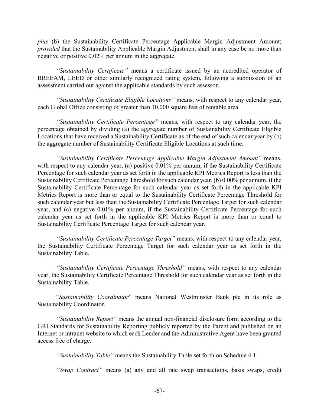 -67- plus (b) the Sustainability Certificate Percentage Applicable Margin Adjustment Amount; provided that the Sustainability Applicable Margin Adjustment shall in any case be no more than negative or positive 0.02% per annum in the aggregate. “Sustainability Certificate” means a certificate issued by an accredited operator of BREEAM, LEED or other similarly recognized rating system, following a submission of an assessment carried out against the applicable standards by such assessor. “Sustainability Certificate Eligible Locations” means, with respect to any calendar year, each Global Office consisting of greater than 10,000 square feet of rentable area. “Sustainability Certificate Percentage” means, with respect to any calendar year, the percentage obtained by dividing (a) the aggregate number of Sustainability Certificate Eligible Locations that have received a Sustainability Certificate as of the end of such calendar year by (b) the aggregate number of Sustainability Certificate Eligible Locations at such time. “Sustainability Certificate Percentage Applicable Margin Adjustment Amount” means, with respect to any calendar year, (a) positive 0.01% per annum, if the Sustainability Certificate Percentage for such calendar year as set forth in the applicable KPI Metrics Report is less than the Sustainability Certificate Percentage Threshold for such calendar year, (b) 0.00% per annum, if the Sustainability Certificate Percentage for such calendar year as set forth in the applicable KPI Metrics Report is more than or equal to the Sustainability Certificate Percentage Threshold for such calendar year but less than the Sustainability Certificate Percentage Target for such calendar year, and (c) negative 0.01% per annum, if the Sustainability Certificate Percentage for such calendar year as set forth in the applicable KPI Metrics Report is more than or equal to Sustainability Certificate Percentage Target for such calendar year. “Sustainability Certificate Percentage Target” means, with respect to any calendar year, the Sustainability Certificate Percentage Target for such calendar year as set forth in the Sustainability Table. “Sustainability Certificate Percentage Threshold” means, with respect to any calendar year, the Sustainability Certificate Percentage Threshold for such calendar year as set forth in the Sustainability Table. “Sustainability Coordinator” means National Westminster Bank plc in its role as Sustainability Coordinator. “Sustainability Report” means the annual non-financial disclosure form according to the GRI Standards for Sustainability Reporting publicly reported by the Parent and published on an Internet or intranet website to which each Lender and the Administrative Agent have been granted access free of charge. “Sustainability Table” means the Sustainability Table set forth on Schedule 4.1. “Swap Contract” means (a) any and all rate swap transactions, basis swaps, credit
