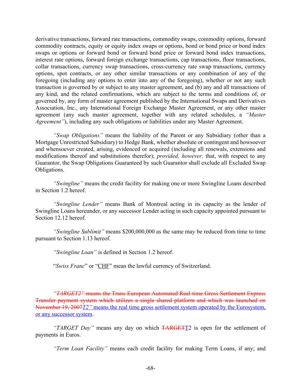 -68- derivative transactions, forward rate transactions, commodity swaps, commodity options, forward commodity contracts, equity or equity index swaps or options, bond or bond price or bond index swaps or options or forward bond or forward bond price or forward bond index transactions, interest rate options, forward foreign exchange transactions, cap transactions, floor transactions, collar transactions, currency swap transactions, cross-currency rate swap transactions, currency options, spot contracts, or any other similar transactions or any combination of any of the foregoing (including any options to enter into any of the foregoing), whether or not any such transaction is governed by or subject to any master agreement, and (b) any and all transactions of any kind, and the related confirmations, which are subject to the terms and conditions of, or governed by, any form of master agreement published by the International Swaps and Derivatives Association, Inc., any International Foreign Exchange Master Agreement, or any other master agreement (any such master agreement, together with any related schedules, a “Master Agreement”), including any such obligations or liabilities under any Master Agreement. “Swap Obligations” means the liability of the Parent or any Subsidiary (other than a Mortgage Unrestricted Subsidiary) to Hedge Bank, whether absolute or contingent and howsoever and whensoever created, arising, evidenced or acquired (including all renewals, extensions and modifications thereof and substitutions therefor); provided, however, that, with respect to any Guarantor, the Swap Obligations Guaranteed by such Guarantor shall exclude all Excluded Swap Obligations. “Swingline” means the credit facility for making one or more Swingline Loans described in Section 1.2 hereof. “Swingline Lender” means Bank of Montreal acting in its capacity as the lender of Swingline Loans hereunder, or any successor Lender acting in such capacity appointed pursuant to Section 12.12 hereof. “Swingline Sublimit” means $200,000,000 as the same may be reduced from time to time pursuant to Section 1.13 hereof. “Swingline Loan” is defined in Section 1.2 hereof. “Swiss Franc” or “CHF” mean the lawful currency of Switzerland. “TARGET2” means the Trans-European Automated Real-time Gross Settlement Express Transfer payment system which utilizes a single shared platform and which was launched on November 19, 2007T2” means the real time gross settlement system operated by the Eurosystem, or any successor system. “TARGET Day” means any day on which TARGETT2 is open for the settlement of payments in Euros. “Term Loan Facility” means each credit facility for making Term Loans, if any; and