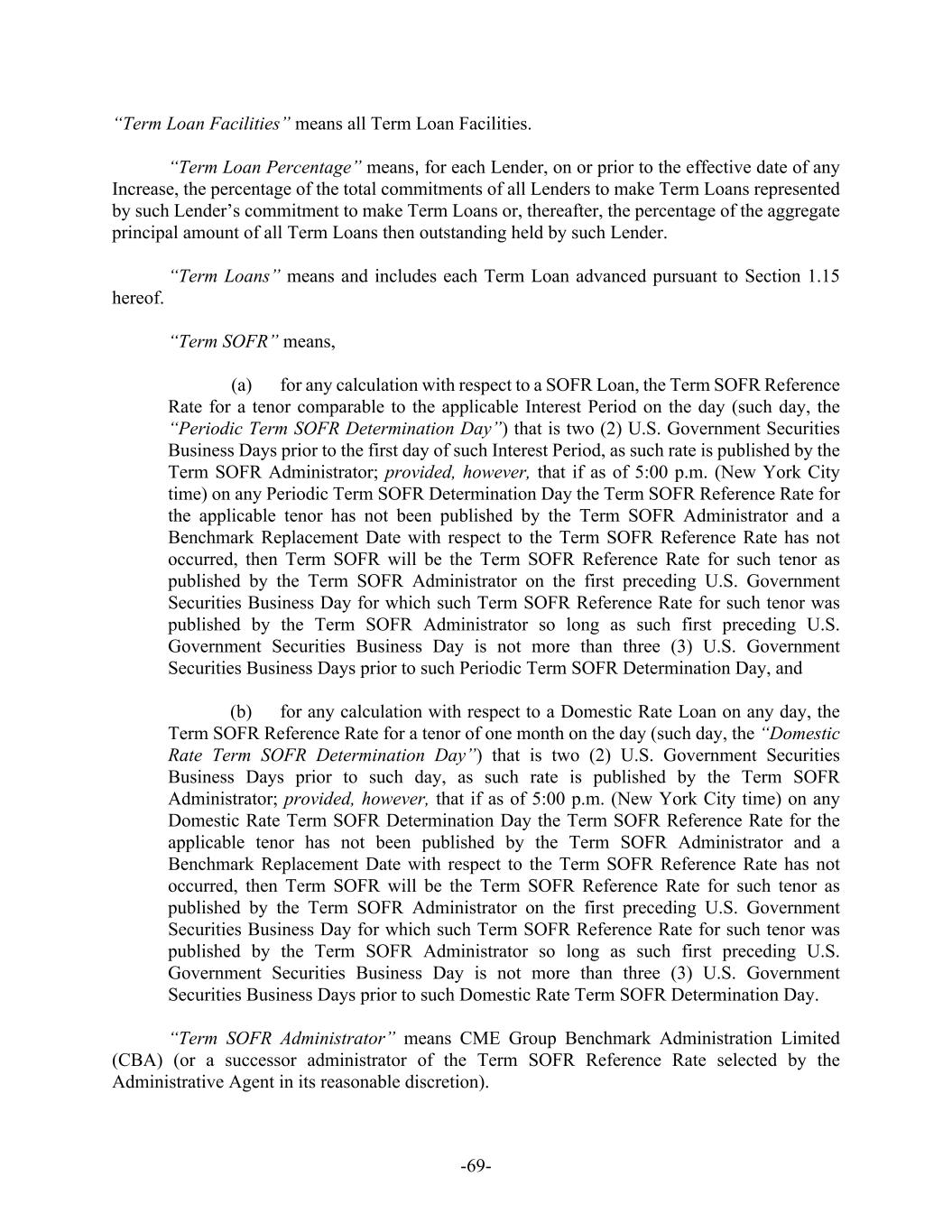 -69- “Term Loan Facilities” means all Term Loan Facilities. “Term Loan Percentage” means, for each Lender, on or prior to the effective date of any Increase, the percentage of the total commitments of all Lenders to make Term Loans represented by such Lender’s commitment to make Term Loans or, thereafter, the percentage of the aggregate principal amount of all Term Loans then outstanding held by such Lender. “Term Loans” means and includes each Term Loan advanced pursuant to Section 1.15 hereof. “Term SOFR” means, (a) for any calculation with respect to a SOFR Loan, the Term SOFR Reference Rate for a tenor comparable to the applicable Interest Period on the day (such day, the “Periodic Term SOFR Determination Day”) that is two (2) U.S. Government Securities Business Days prior to the first day of such Interest Period, as such rate is published by the Term SOFR Administrator; provided, however, that if as of 5:00 p.m. (New York City time) on any Periodic Term SOFR Determination Day the Term SOFR Reference Rate for the applicable tenor has not been published by the Term SOFR Administrator and a Benchmark Replacement Date with respect to the Term SOFR Reference Rate has not occurred, then Term SOFR will be the Term SOFR Reference Rate for such tenor as published by the Term SOFR Administrator on the first preceding U.S. Government Securities Business Day for which such Term SOFR Reference Rate for such tenor was published by the Term SOFR Administrator so long as such first preceding U.S. Government Securities Business Day is not more than three (3) U.S. Government Securities Business Days prior to such Periodic Term SOFR Determination Day, and (b) for any calculation with respect to a Domestic Rate Loan on any day, the Term SOFR Reference Rate for a tenor of one month on the day (such day, the “Domestic Rate Term SOFR Determination Day”) that is two (2) U.S. Government Securities Business Days prior to such day, as such rate is published by the Term SOFR Administrator; provided, however, that if as of 5:00 p.m. (New York City time) on any Domestic Rate Term SOFR Determination Day the Term SOFR Reference Rate for the applicable tenor has not been published by the Term SOFR Administrator and a Benchmark Replacement Date with respect to the Term SOFR Reference Rate has not occurred, then Term SOFR will be the Term SOFR Reference Rate for such tenor as published by the Term SOFR Administrator on the first preceding U.S. Government Securities Business Day for which such Term SOFR Reference Rate for such tenor was published by the Term SOFR Administrator so long as such first preceding U.S. Government Securities Business Day is not more than three (3) U.S. Government Securities Business Days prior to such Domestic Rate Term SOFR Determination Day. “Term SOFR Administrator” means CME Group Benchmark Administration Limited (CBA) (or a successor administrator of the Term SOFR Reference Rate selected by the Administrative Agent in its reasonable discretion).