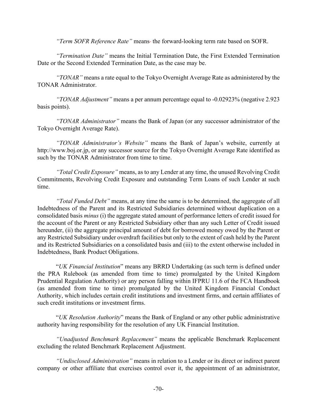 -70- “Term SOFR Reference Rate” means the forward-looking term rate based on SOFR. “Termination Date” means the Initial Termination Date, the First Extended Termination Date or the Second Extended Termination Date, as the case may be. “TONAR” means a rate equal to the Tokyo Overnight Average Rate as administered by the TONAR Administrator. “TONAR Adjustment” means a per annum percentage equal to -0.02923% (negative 2.923 basis points). “TONAR Administrator” means the Bank of Japan (or any successor administrator of the Tokyo Overnight Average Rate). “TONAR Administrator’s Website” means the Bank of Japan’s website, currently at http://www.boj.or.jp, or any successor source for the Tokyo Overnight Average Rate identified as such by the TONAR Administrator from time to time. “Total Credit Exposure” means, as to any Lender at any time, the unused Revolving Credit Commitments, Revolving Credit Exposure and outstanding Term Loans of such Lender at such time. “Total Funded Debt” means, at any time the same is to be determined, the aggregate of all Indebtedness of the Parent and its Restricted Subsidiaries determined without duplication on a consolidated basis minus (i) the aggregate stated amount of performance letters of credit issued for the account of the Parent or any Restricted Subsidiary other than any such Letter of Credit issued hereunder, (ii) the aggregate principal amount of debt for borrowed money owed by the Parent or any Restricted Subsidiary under overdraft facilities but only to the extent of cash held by the Parent and its Restricted Subsidiaries on a consolidated basis and (iii) to the extent otherwise included in Indebtedness, Bank Product Obligations. “UK Financial Institution” means any BRRD Undertaking (as such term is defined under the PRA Rulebook (as amended from time to time) promulgated by the United Kingdom Prudential Regulation Authority) or any person falling within IFPRU 11.6 of the FCA Handbook (as amended from time to time) promulgated by the United Kingdom Financial Conduct Authority, which includes certain credit institutions and investment firms, and certain affiliates of such credit institutions or investment firms. “UK Resolution Authority” means the Bank of England or any other public administrative authority having responsibility for the resolution of any UK Financial Institution. “Unadjusted Benchmark Replacement” means the applicable Benchmark Replacement excluding the related Benchmark Replacement Adjustment. “Undisclosed Administration” means in relation to a Lender or its direct or indirect parent company or other affiliate that exercises control over it, the appointment of an administrator,