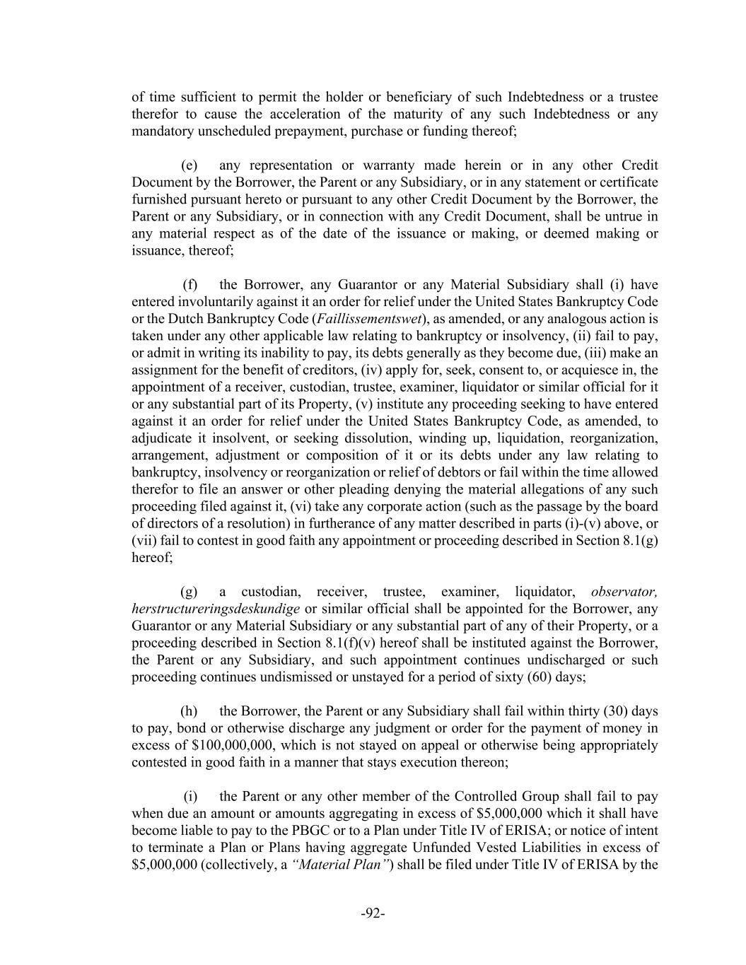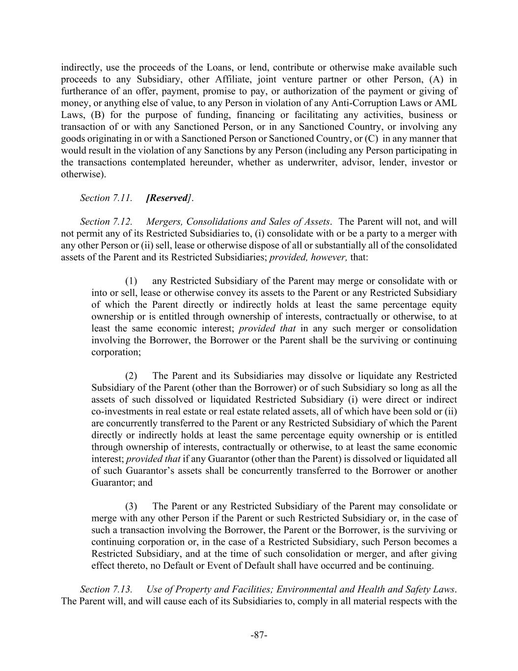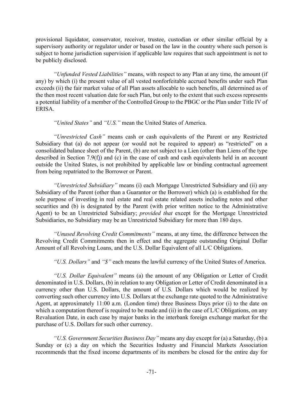 -71- provisional liquidator, conservator, receiver, trustee, custodian or other similar official by a supervisory authority or regulator under or based on the law in the country where such person is subject to home jurisdiction supervision if applicable law requires that such appointment is not to be publicly disclosed. “Unfunded Vested Liabilities” means, with respect to any Plan at any time, the amount (if any) by which (i) the present value of all vested nonforfeitable accrued benefits under such Plan exceeds (ii) the fair market value of all Plan assets allocable to such benefits, all determined as of the then most recent valuation date for such Plan, but only to the extent that such excess represents a potential liability of a member of the Controlled Group to the PBGC or the Plan under Title IV of ERISA. “United States” and “U.S.” mean the United States of America. “Unrestricted Cash” means cash or cash equivalents of the Parent or any Restricted Subsidiary that (a) do not appear (or would not be required to appear) as “restricted” on a consolidated balance sheet of the Parent, (b) are not subject to a Lien (other than Liens of the type described in Section 7.9(f)) and (c) in the case of cash and cash equivalents held in an account outside the United States, is not prohibited by applicable law or binding contractual agreement from being repatriated to the Borrower or Parent. “Unrestricted Subsidiary” means (i) each Mortgage Unrestricted Subsidiary and (ii) any Subsidiary of the Parent (other than a Guarantor or the Borrower) which (a) is established for the sole purpose of investing in real estate and real estate related assets including notes and other securities and (b) is designated by the Parent (with prior written notice to the Administrative Agent) to be an Unrestricted Subsidiary; provided that except for the Mortgage Unrestricted Subsidiaries, no Subsidiary may be an Unrestricted Subsidiary for more than 180 days. “Unused Revolving Credit Commitments” means, at any time, the difference between the Revolving Credit Commitments then in effect and the aggregate outstanding Original Dollar Amount of all Revolving Loans, and the U.S. Dollar Equivalent of all L/C Obligations. “U.S. Dollars” and “$” each means the lawful currency of the United States of America. “U.S. Dollar Equivalent” means (a) the amount of any Obligation or Letter of Credit denominated in U.S. Dollars, (b) in relation to any Obligation or Letter of Credit denominated in a currency other than U.S. Dollars, the amount of U.S. Dollars which would be realized by converting such other currency into U.S. Dollars at the exchange rate quoted to the Administrative Agent, at approximately 11:00 a.m. (London time) three Business Days prior (i) to the date on which a computation thereof is required to be made and (ii) in the case of L/C Obligations, on any Revaluation Date, in each case by major banks in the interbank foreign exchange market for the purchase of U.S. Dollars for such other currency. “U.S. Government Securities Business Day” means any day except for (a) a Saturday, (b) a Sunday or (c) a day on which the Securities Industry and Financial Markets Association recommends that the fixed income departments of its members be closed for the entire day for