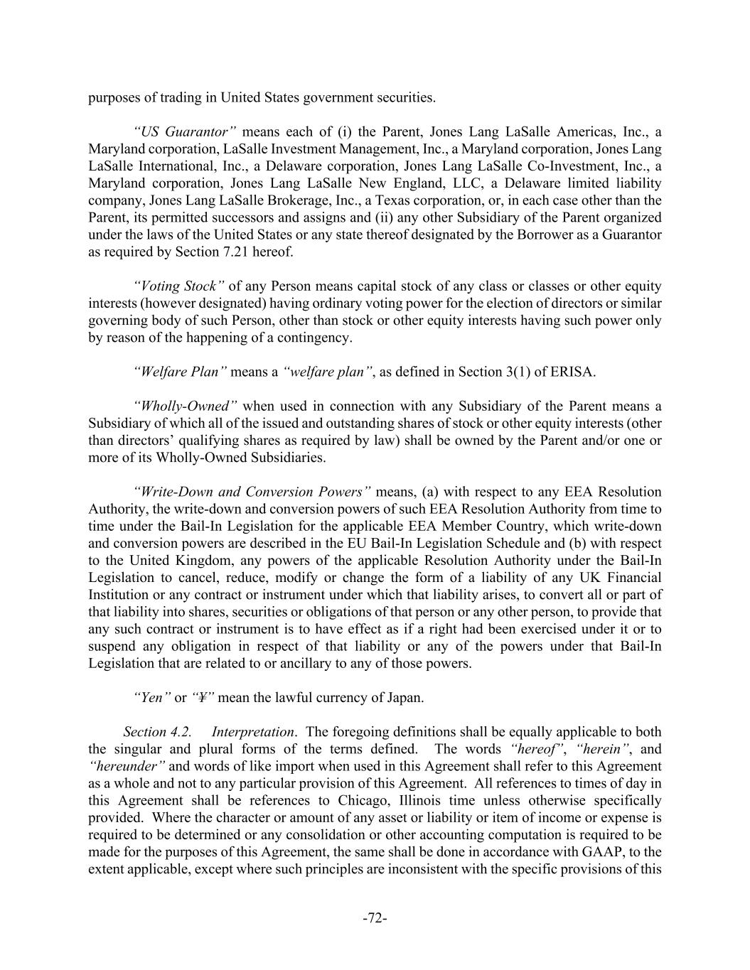 -72- purposes of trading in United States government securities. “US Guarantor” means each of (i) the Parent, Jones Lang LaSalle Americas, Inc., a Maryland corporation, LaSalle Investment Management, Inc., a Maryland corporation, Jones Lang LaSalle International, Inc., a Delaware corporation, Jones Lang LaSalle Co-Investment, Inc., a Maryland corporation, Jones Lang LaSalle New England, LLC, a Delaware limited liability company, Jones Lang LaSalle Brokerage, Inc., a Texas corporation, or, in each case other than the Parent, its permitted successors and assigns and (ii) any other Subsidiary of the Parent organized under the laws of the United States or any state thereof designated by the Borrower as a Guarantor as required by Section 7.21 hereof. “Voting Stock” of any Person means capital stock of any class or classes or other equity interests (however designated) having ordinary voting power for the election of directors or similar governing body of such Person, other than stock or other equity interests having such power only by reason of the happening of a contingency. “Welfare Plan” means a “welfare plan”, as defined in Section 3(1) of ERISA. “Wholly-Owned” when used in connection with any Subsidiary of the Parent means a Subsidiary of which all of the issued and outstanding shares of stock or other equity interests (other than directors’ qualifying shares as required by law) shall be owned by the Parent and/or one or more of its Wholly-Owned Subsidiaries. “Write-Down and Conversion Powers” means, (a) with respect to any EEA Resolution Authority, the write-down and conversion powers of such EEA Resolution Authority from time to time under the Bail-In Legislation for the applicable EEA Member Country, which write-down and conversion powers are described in the EU Bail-In Legislation Schedule and (b) with respect to the United Kingdom, any powers of the applicable Resolution Authority under the Bail-In Legislation to cancel, reduce, modify or change the form of a liability of any UK Financial Institution or any contract or instrument under which that liability arises, to convert all or part of that liability into shares, securities or obligations of that person or any other person, to provide that any such contract or instrument is to have effect as if a right had been exercised under it or to suspend any obligation in respect of that liability or any of the powers under that Bail-In Legislation that are related to or ancillary to any of those powers. “Yen” or “¥” mean the lawful currency of Japan. Section 4.2. Interpretation. The foregoing definitions shall be equally applicable to both the singular and plural forms of the terms defined. The words “hereof”, “herein”, and “hereunder” and words of like import when used in this Agreement shall refer to this Agreement as a whole and not to any particular provision of this Agreement. All references to times of day in this Agreement shall be references to Chicago, Illinois time unless otherwise specifically provided. Where the character or amount of any asset or liability or item of income or expense is required to be determined or any consolidation or other accounting computation is required to be made for the purposes of this Agreement, the same shall be done in accordance with GAAP, to the extent applicable, except where such principles are inconsistent with the specific provisions of this
