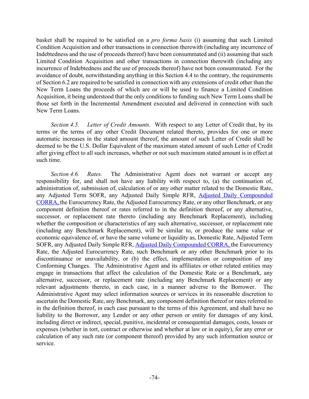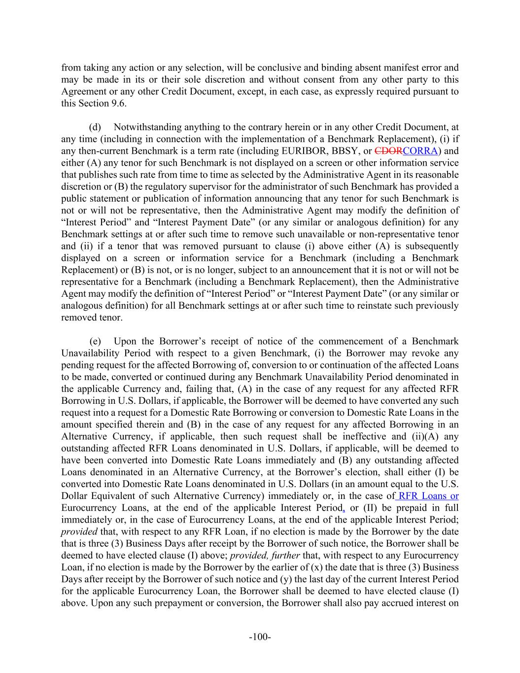 -100- from taking any action or any selection, will be conclusive and binding absent manifest error and may be made in its or their sole discretion and without consent from any other party to this Agreement or any other Credit Document, except, in each case, as expressly required pursuant to this Section 9.6. (d) Notwithstanding anything to the contrary herein or in any other Credit Document, at any time (including in connection with the implementation of a Benchmark Replacement), (i) if any then-current Benchmark is a term rate (including EURIBOR, BBSY, or CDORCORRA) and either (A) any tenor for such Benchmark is not displayed on a screen or other information service that publishes such rate from time to time as selected by the Administrative Agent in its reasonable discretion or (B) the regulatory supervisor for the administrator of such Benchmark has provided a public statement or publication of information announcing that any tenor for such Benchmark is not or will not be representative, then the Administrative Agent may modify the definition of “Interest Period” and “Interest Payment Date” (or any similar or analogous definition) for any Benchmark settings at or after such time to remove such unavailable or non-representative tenor and (ii) if a tenor that was removed pursuant to clause (i) above either (A) is subsequently displayed on a screen or information service for a Benchmark (including a Benchmark Replacement) or (B) is not, or is no longer, subject to an announcement that it is not or will not be representative for a Benchmark (including a Benchmark Replacement), then the Administrative Agent may modify the definition of “Interest Period” or “Interest Payment Date” (or any similar or analogous definition) for all Benchmark settings at or after such time to reinstate such previously removed tenor. (e) Upon the Borrower’s receipt of notice of the commencement of a Benchmark Unavailability Period with respect to a given Benchmark, (i) the Borrower may revoke any pending request for the affected Borrowing of, conversion to or continuation of the affected Loans to be made, converted or continued during any Benchmark Unavailability Period denominated in the applicable Currency and, failing that, (A) in the case of any request for any affected RFR Borrowing in U.S. Dollars, if applicable, the Borrower will be deemed to have converted any such request into a request for a Domestic Rate Borrowing or conversion to Domestic Rate Loans in the amount specified therein and (B) in the case of any request for any affected Borrowing in an Alternative Currency, if applicable, then such request shall be ineffective and (ii)(A) any outstanding affected RFR Loans denominated in U.S. Dollars, if applicable, will be deemed to have been converted into Domestic Rate Loans immediately and (B) any outstanding affected Loans denominated in an Alternative Currency, at the Borrower’s election, shall either (I) be converted into Domestic Rate Loans denominated in U.S. Dollars (in an amount equal to the U.S. Dollar Equivalent of such Alternative Currency) immediately or, in the case of RFR Loans or Eurocurrency Loans, at the end of the applicable Interest Period, or (II) be prepaid in full immediately or, in the case of Eurocurrency Loans, at the end of the applicable Interest Period; provided that, with respect to any RFR Loan, if no election is made by the Borrower by the date that is three (3) Business Days after receipt by the Borrower of such notice, the Borrower shall be deemed to have elected clause (I) above; provided, further that, with respect to any Eurocurrency Loan, if no election is made by the Borrower by the earlier of (x) the date that is three (3) Business Days after receipt by the Borrower of such notice and (y) the last day of the current Interest Period for the applicable Eurocurrency Loan, the Borrower shall be deemed to have elected clause (I) above. Upon any such prepayment or conversion, the Borrower shall also pay accrued interest on