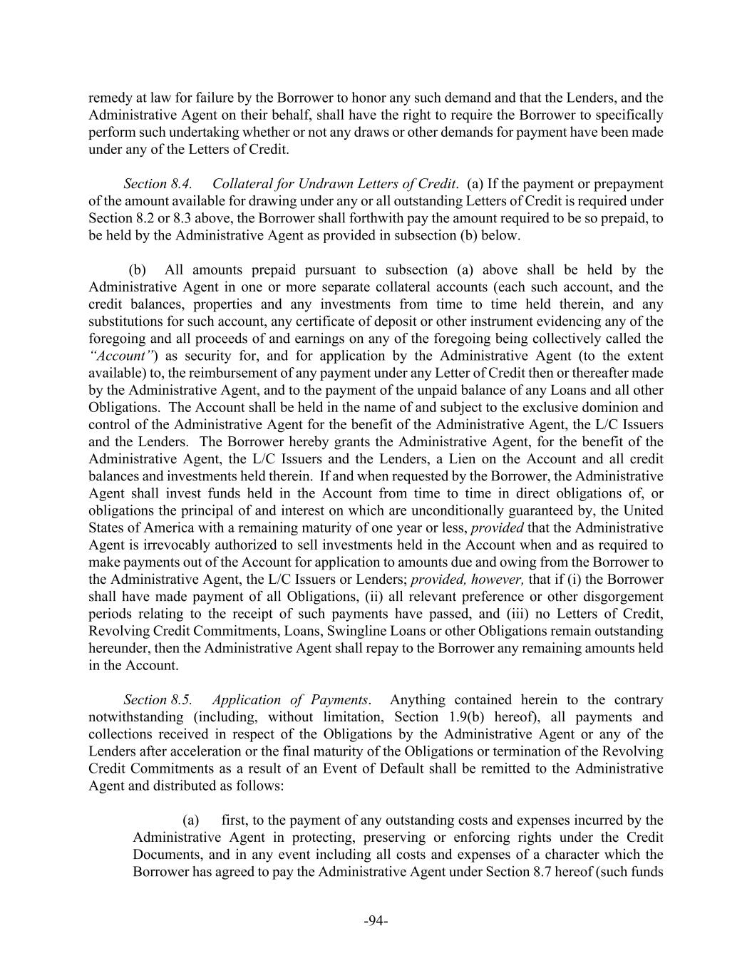 -24- and unfunded participations in Letters of Credit and Swingline Loans to be held pro rata by the Lenders in accordance with their respective Percentages (without giving effect to Section 1.16(a)(iv) hereof), whereupon such Lender will cease to be a Defaulting Lender; provided that no adjustments will be made retroactively with respect to fees accrued or payments made by or on behalf of the Borrower while that Lender was a Defaulting Lender; and provided, further, that except to the extent otherwise expressly agreed by the affected parties, no change hereunder from Defaulting Lender to Lender will constitute a waiver or release of any claim of any party hereunder arising from that Lender’s having been a Defaulting Lender. (c) New Letters of Credit. So long as any Lender is a Defaulting Lender, no L/C Issuer shall be required to issue, extend, renew or increase any Letter of Credit unless it is satisfied that it will have no Fronting Exposure after giving effect thereto. Section 1.17. Cash Collateral for Fronting Exposure At any time that there shall exist a Defaulting Lender, within one (1) Business Day following the written request of the Administrative Agent or any L/C Issuer (with a copy to the Administrative Agent), the Borrower shall Cash Collateralize each L/C Issuer’s Fronting Exposure with respect to such Defaulting Lender (determined after giving effect to Section 1.16(a)(iv) hereof and any Cash Collateral provided by such Defaulting Lender) in an amount not less than the Minimum Collateral Amount. (a) Grant of Security Interest. Each of the Borrower, and to the extent provided by any Defaulting Lender, such Defaulting Lender, hereby grants to the Administrative Agent, for the benefit of the applicable L/C Issuer, and agrees to maintain, a first priority security interest in all such Cash Collateral as security for such Defaulting Lender’s obligation to fund participations in respect of L/C Obligations, to be applied pursuant to clause (b) below. If at any time the Administrative Agent determines that Cash Collateral is subject to any right or claim of any Person other than the Administrative Agent and the applicable L/C Issuer as herein provided, or that the total amount of such Cash Collateral is less than the Minimum Collateral Amount, the Borrower shall, promptly upon demand by the Administrative Agent, pay or provide to the Administrative Agent additional Cash Collateral in an amount sufficient to eliminate such deficiency (after giving effect to any Cash Collateral provided by such Defaulting Lender). (b) Application. Notwithstanding anything to the contrary contained in this Agreement, Cash Collateral provided under this Section 1.17 or Section 1.16 hereof in respect of Letters of Credit shall be applied to the satisfaction of such Defaulting Lender’s obligation to fund participations in respect of L/C Obligations (including, as to Cash Collateral provided by a Defaulting Lender, any interest accrued on such obligation) for which the Cash Collateral was so provided, prior to any other application of such property as may otherwise be provided for herein. (c) Termination of Requirement. Cash Collateral (or the appropriate portion thereof) provided to reduce an L/C Issuer’s Fronting Exposure shall no longer be required to be held as Cash Collateral pursuant to this Section 1.17 following (A) the elimination of the applicable Fronting Exposure (including by the termination of Defaulting Lender status of the applicable Lender), or (B) the determination by the Administrative Agent and the applicable L/C Issuer that there exists excess Cash Collateral; provided that the Person providing Cash Collateral and the applicable L/C Issuer may agree that Cash Collateral shall be held to support future anticipated