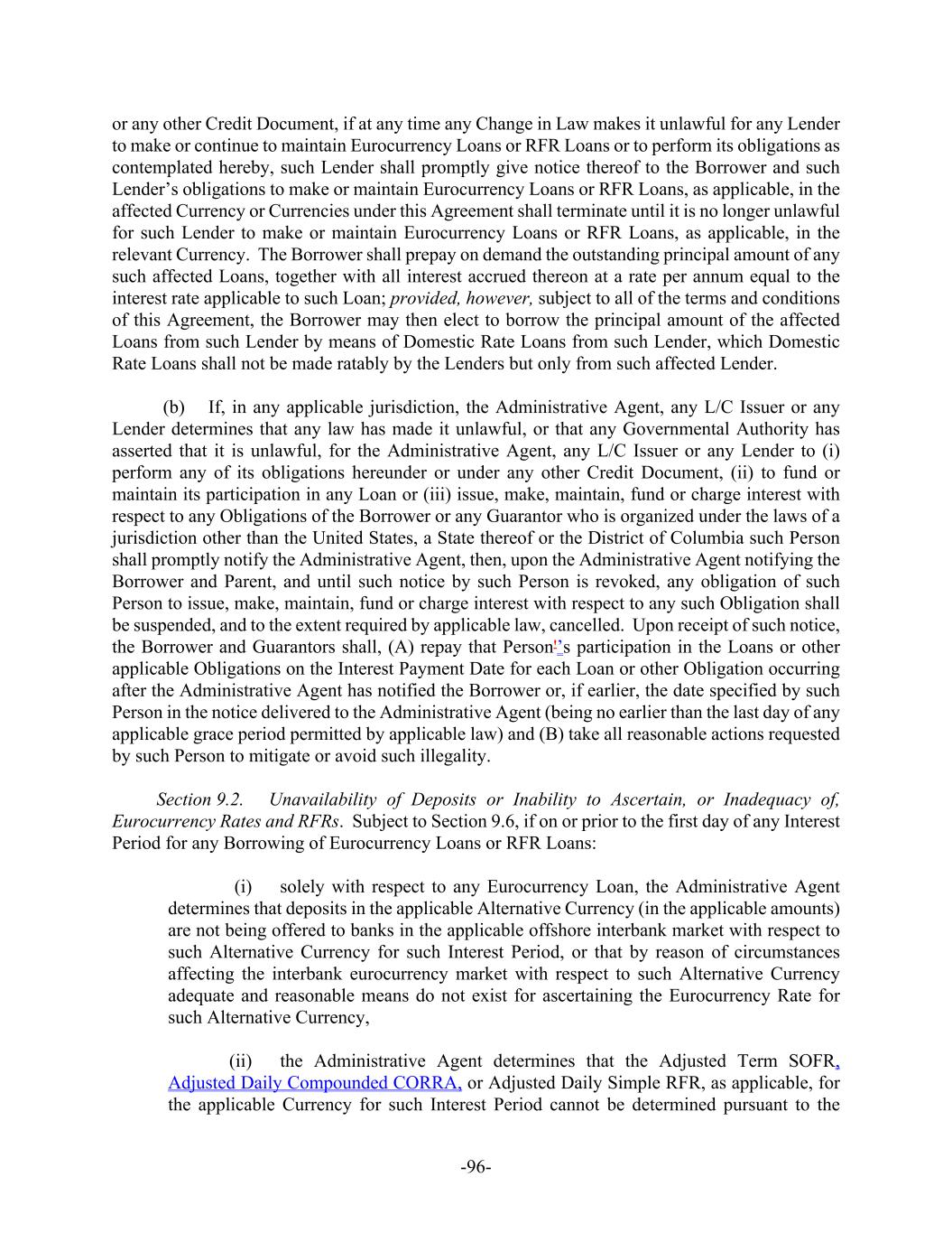 -96- or any other Credit Document, if at any time any Change in Law makes it unlawful for any Lender to make or continue to maintain Eurocurrency Loans or RFR Loans or to perform its obligations as contemplated hereby, such Lender shall promptly give notice thereof to the Borrower and such Lender’s obligations to make or maintain Eurocurrency Loans or RFR Loans, as applicable, in the affected Currency or Currencies under this Agreement shall terminate until it is no longer unlawful for such Lender to make or maintain Eurocurrency Loans or RFR Loans, as applicable, in the relevant Currency. The Borrower shall prepay on demand the outstanding principal amount of any such affected Loans, together with all interest accrued thereon at a rate per annum equal to the interest rate applicable to such Loan; provided, however, subject to all of the terms and conditions of this Agreement, the Borrower may then elect to borrow the principal amount of the affected Loans from such Lender by means of Domestic Rate Loans from such Lender, which Domestic Rate Loans shall not be made ratably by the Lenders but only from such affected Lender. (b) If, in any applicable jurisdiction, the Administrative Agent, any L/C Issuer or any Lender determines that any law has made it unlawful, or that any Governmental Authority has asserted that it is unlawful, for the Administrative Agent, any L/C Issuer or any Lender to (i) perform any of its obligations hereunder or under any other Credit Document, (ii) to fund or maintain its participation in any Loan or (iii) issue, make, maintain, fund or charge interest with respect to any Obligations of the Borrower or any Guarantor who is organized under the laws of a jurisdiction other than the United States, a State thereof or the District of Columbia such Person shall promptly notify the Administrative Agent, then, upon the Administrative Agent notifying the Borrower and Parent, and until such notice by such Person is revoked, any obligation of such Person to issue, make, maintain, fund or charge interest with respect to any such Obligation shall be suspended, and to the extent required by applicable law, cancelled. Upon receipt of such notice, the Borrower and Guarantors shall, (A) repay that Person'’s participation in the Loans or other applicable Obligations on the Interest Payment Date for each Loan or other Obligation occurring after the Administrative Agent has notified the Borrower or, if earlier, the date specified by such Person in the notice delivered to the Administrative Agent (being no earlier than the last day of any applicable grace period permitted by applicable law) and (B) take all reasonable actions requested by such Person to mitigate or avoid such illegality. Section 9.2. Unavailability of Deposits or Inability to Ascertain, or Inadequacy of, Eurocurrency Rates and RFRs. Subject to Section 9.6, if on or prior to the first day of any Interest Period for any Borrowing of Eurocurrency Loans or RFR Loans: (i) solely with respect to any Eurocurrency Loan, the Administrative Agent determines that deposits in the applicable Alternative Currency (in the applicable amounts) are not being offered to banks in the applicable offshore interbank market with respect to such Alternative Currency for such Interest Period, or that by reason of circumstances affecting the interbank eurocurrency market with respect to such Alternative Currency adequate and reasonable means do not exist for ascertaining the Eurocurrency Rate for such Alternative Currency, (ii) the Administrative Agent determines that the Adjusted Term SOFR, Adjusted Daily Compounded CORRA, or Adjusted Daily Simple RFR, as applicable, for the applicable Currency for such Interest Period cannot be determined pursuant to the