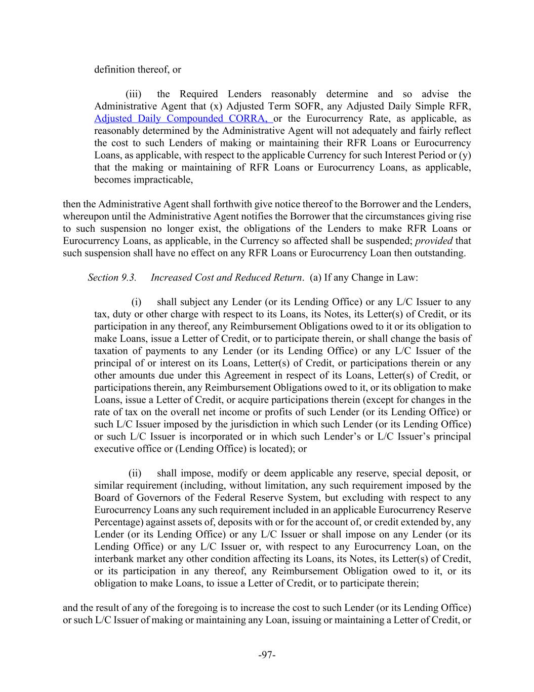 -97- definition thereof, or (iii) the Required Lenders reasonably determine and so advise the Administrative Agent that (x) Adjusted Term SOFR, any Adjusted Daily Simple RFR, Adjusted Daily Compounded CORRA, or the Eurocurrency Rate, as applicable, as reasonably determined by the Administrative Agent will not adequately and fairly reflect the cost to such Lenders of making or maintaining their RFR Loans or Eurocurrency Loans, as applicable, with respect to the applicable Currency for such Interest Period or (y) that the making or maintaining of RFR Loans or Eurocurrency Loans, as applicable, becomes impracticable, then the Administrative Agent shall forthwith give notice thereof to the Borrower and the Lenders, whereupon until the Administrative Agent notifies the Borrower that the circumstances giving rise to such suspension no longer exist, the obligations of the Lenders to make RFR Loans or Eurocurrency Loans, as applicable, in the Currency so affected shall be suspended; provided that such suspension shall have no effect on any RFR Loans or Eurocurrency Loan then outstanding. Section 9.3. Increased Cost and Reduced Return. (a) If any Change in Law: (i) shall subject any Lender (or its Lending Office) or any L/C Issuer to any tax, duty or other charge with respect to its Loans, its Notes, its Letter(s) of Credit, or its participation in any thereof, any Reimbursement Obligations owed to it or its obligation to make Loans, issue a Letter of Credit, or to participate therein, or shall change the basis of taxation of payments to any Lender (or its Lending Office) or any L/C Issuer of the principal of or interest on its Loans, Letter(s) of Credit, or participations therein or any other amounts due under this Agreement in respect of its Loans, Letter(s) of Credit, or participations therein, any Reimbursement Obligations owed to it, or its obligation to make Loans, issue a Letter of Credit, or acquire participations therein (except for changes in the rate of tax on the overall net income or profits of such Lender (or its Lending Office) or such L/C Issuer imposed by the jurisdiction in which such Lender (or its Lending Office) or such L/C Issuer is incorporated or in which such Lender’s or L/C Issuer’s principal executive office or (Lending Office) is located); or (ii) shall impose, modify or deem applicable any reserve, special deposit, or similar requirement (including, without limitation, any such requirement imposed by the Board of Governors of the Federal Reserve System, but excluding with respect to any Eurocurrency Loans any such requirement included in an applicable Eurocurrency Reserve Percentage) against assets of, deposits with or for the account of, or credit extended by, any Lender (or its Lending Office) or any L/C Issuer or shall impose on any Lender (or its Lending Office) or any L/C Issuer or, with respect to any Eurocurrency Loan, on the interbank market any other condition affecting its Loans, its Notes, its Letter(s) of Credit, or its participation in any thereof, any Reimbursement Obligation owed to it, or its obligation to make Loans, to issue a Letter of Credit, or to participate therein; and the result of any of the foregoing is to increase the cost to such Lender (or its Lending Office) or such L/C Issuer of making or maintaining any Loan, issuing or maintaining a Letter of Credit, or