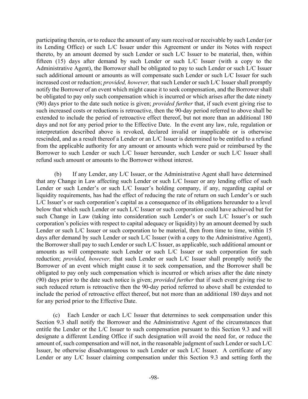 -98- participating therein, or to reduce the amount of any sum received or receivable by such Lender (or its Lending Office) or such L/C Issuer under this Agreement or under its Notes with respect thereto, by an amount deemed by such Lender or such L/C Issuer to be material, then, within fifteen (15) days after demand by such Lender or such L/C Issuer (with a copy to the Administrative Agent), the Borrower shall be obligated to pay to such Lender or such L/C Issuer such additional amount or amounts as will compensate such Lender or such L/C Issuer for such increased cost or reduction; provided, however, that such Lender or such L/C Issuer shall promptly notify the Borrower of an event which might cause it to seek compensation, and the Borrower shall be obligated to pay only such compensation which is incurred or which arises after the date ninety (90) days prior to the date such notice is given; provided further that, if such event giving rise to such increased costs or reductions is retroactive, then the 90-day period referred to above shall be extended to include the period of retroactive effect thereof, but not more than an additional 180 days and not for any period prior to the Effective Date. In the event any law, rule, regulation or interpretation described above is revoked, declared invalid or inapplicable or is otherwise rescinded, and as a result thereof a Lender or an L/C Issuer is determined to be entitled to a refund from the applicable authority for any amount or amounts which were paid or reimbursed by the Borrower to such Lender or such L/C Issuer hereunder, such Lender or such L/C Issuer shall refund such amount or amounts to the Borrower without interest. (b) If any Lender, any L/C Issuer, or the Administrative Agent shall have determined that any Change in Law affecting such Lender or such L/C Issuer or any lending office of such Lender or such Lender’s or such L/C Issuer’s holding company, if any, regarding capital or liquidity requirements, has had the effect of reducing the rate of return on such Lender’s or such L/C Issuer’s or such corporation’s capital as a consequence of its obligations hereunder to a level below that which such Lender or such L/C Issuer or such corporation could have achieved but for such Change in Law (taking into consideration such Lender’s or such L/C Issuer’s or such corporation’s policies with respect to capital adequacy or liquidity) by an amount deemed by such Lender or such L/C Issuer or such corporation to be material, then from time to time, within 15 days after demand by such Lender or such L/C Issuer (with a copy to the Administrative Agent), the Borrower shall pay to such Lender or such L/C Issuer, as applicable, such additional amount or amounts as will compensate such Lender or such L/C Issuer or such corporation for such reduction; provided, however, that such Lender or such L/C Issuer shall promptly notify the Borrower of an event which might cause it to seek compensation, and the Borrower shall be obligated to pay only such compensation which is incurred or which arises after the date ninety (90) days prior to the date such notice is given; provided further that if such event giving rise to such reduced return is retroactive then the 90-day period referred to above shall be extended to include the period of retroactive effect thereof, but not more than an additional 180 days and not for any period prior to the Effective Date. (c) Each Lender or each L/C Issuer that determines to seek compensation under this Section 9.3 shall notify the Borrower and the Administrative Agent of the circumstances that entitle the Lender or the L/C Issuer to such compensation pursuant to this Section 9.3 and will designate a different Lending Office if such designation will avoid the need for, or reduce the amount of, such compensation and will not, in the reasonable judgment of such Lender or such L/C Issuer, be otherwise disadvantageous to such Lender or such L/C Issuer. A certificate of any Lender or any L/C Issuer claiming compensation under this Section 9.3 and setting forth the