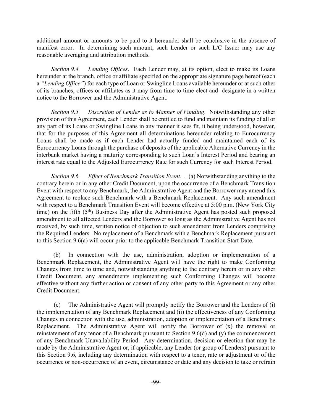 -99- additional amount or amounts to be paid to it hereunder shall be conclusive in the absence of manifest error. In determining such amount, such Lender or such L/C Issuer may use any reasonable averaging and attribution methods. Section 9.4. Lending Offices. Each Lender may, at its option, elect to make its Loans hereunder at the branch, office or affiliate specified on the appropriate signature page hereof (each a “Lending Office”) for each type of Loan or Swingline Loans available hereunder or at such other of its branches, offices or affiliates as it may from time to time elect and designate in a written notice to the Borrower and the Administrative Agent. Section 9.5. Discretion of Lender as to Manner of Funding. Notwithstanding any other provision of this Agreement, each Lender shall be entitled to fund and maintain its funding of all or any part of its Loans or Swingline Loans in any manner it sees fit, it being understood, however, that for the purposes of this Agreement all determinations hereunder relating to Eurocurrency Loans shall be made as if each Lender had actually funded and maintained each of its Eurocurrency Loans through the purchase of deposits of the applicable Alternative Currency in the interbank market having a maturity corresponding to such Loan’s Interest Period and bearing an interest rate equal to the Adjusted Eurocurrency Rate for such Currency for such Interest Period. Section 9.6. Effect of Benchmark Transition Event. . (a) Notwithstanding anything to the contrary herein or in any other Credit Document, upon the occurrence of a Benchmark Transition Event with respect to any Benchmark, the Administrative Agent and the Borrower may amend this Agreement to replace such Benchmark with a Benchmark Replacement. Any such amendment with respect to a Benchmark Transition Event will become effective at 5:00 p.m. (New York City time) on the fifth (5th) Business Day after the Administrative Agent has posted such proposed amendment to all affected Lenders and the Borrower so long as the Administrative Agent has not received, by such time, written notice of objection to such amendment from Lenders comprising the Required Lenders. No replacement of a Benchmark with a Benchmark Replacement pursuant to this Section 9.6(a) will occur prior to the applicable Benchmark Transition Start Date. (b) In connection with the use, administration, adoption or implementation of a Benchmark Replacement, the Administrative Agent will have the right to make Conforming Changes from time to time and, notwithstanding anything to the contrary herein or in any other Credit Document, any amendments implementing such Conforming Changes will become effective without any further action or consent of any other party to this Agreement or any other Credit Document. (c) The Administrative Agent will promptly notify the Borrower and the Lenders of (i) the implementation of any Benchmark Replacement and (ii) the effectiveness of any Conforming Changes in connection with the use, administration, adoption or implementation of a Benchmark Replacement. The Administrative Agent will notify the Borrower of (x) the removal or reinstatement of any tenor of a Benchmark pursuant to Section 9.6(d) and (y) the commencement of any Benchmark Unavailability Period. Any determination, decision or election that may be made by the Administrative Agent or, if applicable, any Lender (or group of Lenders) pursuant to this Section 9.6, including any determination with respect to a tenor, rate or adjustment or of the occurrence or non-occurrence of an event, circumstance or date and any decision to take or refrain