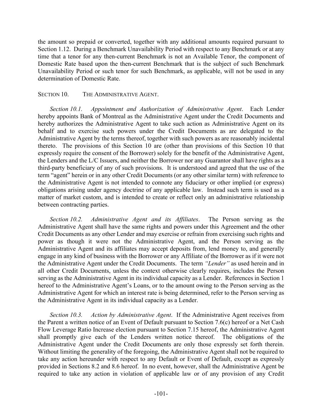 -101- the amount so prepaid or converted, together with any additional amounts required pursuant to Section 1.12. During a Benchmark Unavailability Period with respect to any Benchmark or at any time that a tenor for any then-current Benchmark is not an Available Tenor, the component of Domestic Rate based upon the then-current Benchmark that is the subject of such Benchmark Unavailability Period or such tenor for such Benchmark, as applicable, will not be used in any determination of Domestic Rate. SECTION 10. THE ADMINISTRATIVE AGENT. Section 10.1. Appointment and Authorization of Administrative Agent. Each Lender hereby appoints Bank of Montreal as the Administrative Agent under the Credit Documents and hereby authorizes the Administrative Agent to take such action as Administrative Agent on its behalf and to exercise such powers under the Credit Documents as are delegated to the Administrative Agent by the terms thereof, together with such powers as are reasonably incidental thereto. The provisions of this Section 10 are (other than provisions of this Section 10 that expressly require the consent of the Borrower) solely for the benefit of the Administrative Agent, the Lenders and the L/C Issuers, and neither the Borrower nor any Guarantor shall have rights as a third-party beneficiary of any of such provisions. It is understood and agreed that the use of the term “agent” herein or in any other Credit Documents (or any other similar term) with reference to the Administrative Agent is not intended to connote any fiduciary or other implied (or express) obligations arising under agency doctrine of any applicable law. Instead such term is used as a matter of market custom, and is intended to create or reflect only an administrative relationship between contracting parties. Section 10.2. Administrative Agent and its Affiliates. The Person serving as the Administrative Agent shall have the same rights and powers under this Agreement and the other Credit Documents as any other Lender and may exercise or refrain from exercising such rights and power as though it were not the Administrative Agent, and the Person serving as the Administrative Agent and its affiliates may accept deposits from, lend money to, and generally engage in any kind of business with the Borrower or any Affiliate of the Borrower as if it were not the Administrative Agent under the Credit Documents. The term “Lender” as used herein and in all other Credit Documents, unless the context otherwise clearly requires, includes the Person serving as the Administrative Agent in its individual capacity as a Lender. References in Section 1 hereof to the Administrative Agent’s Loans, or to the amount owing to the Person serving as the Administrative Agent for which an interest rate is being determined, refer to the Person serving as the Administrative Agent in its individual capacity as a Lender. Section 10.3. Action by Administrative Agent. If the Administrative Agent receives from the Parent a written notice of an Event of Default pursuant to Section 7.6(c) hereof or a Net Cash Flow Leverage Ratio Increase election pursuant to Section 7.15 hereof, the Administrative Agent shall promptly give each of the Lenders written notice thereof. The obligations of the Administrative Agent under the Credit Documents are only those expressly set forth therein. Without limiting the generality of the foregoing, the Administrative Agent shall not be required to take any action hereunder with respect to any Default or Event of Default, except as expressly provided in Sections 8.2 and 8.6 hereof. In no event, however, shall the Administrative Agent be required to take any action in violation of applicable law or of any provision of any Credit