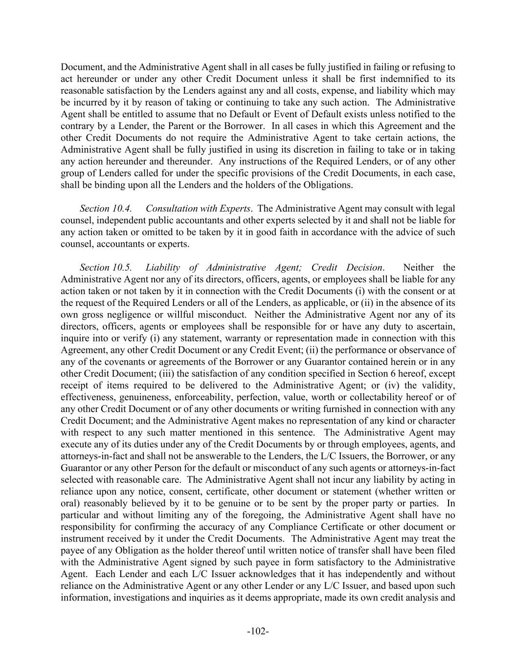 -102- Document, and the Administrative Agent shall in all cases be fully justified in failing or refusing to act hereunder or under any other Credit Document unless it shall be first indemnified to its reasonable satisfaction by the Lenders against any and all costs, expense, and liability which may be incurred by it by reason of taking or continuing to take any such action. The Administrative Agent shall be entitled to assume that no Default or Event of Default exists unless notified to the contrary by a Lender, the Parent or the Borrower. In all cases in which this Agreement and the other Credit Documents do not require the Administrative Agent to take certain actions, the Administrative Agent shall be fully justified in using its discretion in failing to take or in taking any action hereunder and thereunder. Any instructions of the Required Lenders, or of any other group of Lenders called for under the specific provisions of the Credit Documents, in each case, shall be binding upon all the Lenders and the holders of the Obligations. Section 10.4. Consultation with Experts. The Administrative Agent may consult with legal counsel, independent public accountants and other experts selected by it and shall not be liable for any action taken or omitted to be taken by it in good faith in accordance with the advice of such counsel, accountants or experts. Section 10.5. Liability of Administrative Agent; Credit Decision. Neither the Administrative Agent nor any of its directors, officers, agents, or employees shall be liable for any action taken or not taken by it in connection with the Credit Documents (i) with the consent or at the request of the Required Lenders or all of the Lenders, as applicable, or (ii) in the absence of its own gross negligence or willful misconduct. Neither the Administrative Agent nor any of its directors, officers, agents or employees shall be responsible for or have any duty to ascertain, inquire into or verify (i) any statement, warranty or representation made in connection with this Agreement, any other Credit Document or any Credit Event; (ii) the performance or observance of any of the covenants or agreements of the Borrower or any Guarantor contained herein or in any other Credit Document; (iii) the satisfaction of any condition specified in Section 6 hereof, except receipt of items required to be delivered to the Administrative Agent; or (iv) the validity, effectiveness, genuineness, enforceability, perfection, value, worth or collectability hereof or of any other Credit Document or of any other documents or writing furnished in connection with any Credit Document; and the Administrative Agent makes no representation of any kind or character with respect to any such matter mentioned in this sentence. The Administrative Agent may execute any of its duties under any of the Credit Documents by or through employees, agents, and attorneys-in-fact and shall not be answerable to the Lenders, the L/C Issuers, the Borrower, or any Guarantor or any other Person for the default or misconduct of any such agents or attorneys-in-fact selected with reasonable care. The Administrative Agent shall not incur any liability by acting in reliance upon any notice, consent, certificate, other document or statement (whether written or oral) reasonably believed by it to be genuine or to be sent by the proper party or parties. In particular and without limiting any of the foregoing, the Administrative Agent shall have no responsibility for confirming the accuracy of any Compliance Certificate or other document or instrument received by it under the Credit Documents. The Administrative Agent may treat the payee of any Obligation as the holder thereof until written notice of transfer shall have been filed with the Administrative Agent signed by such payee in form satisfactory to the Administrative Agent. Each Lender and each L/C Issuer acknowledges that it has independently and without reliance on the Administrative Agent or any other Lender or any L/C Issuer, and based upon such information, investigations and inquiries as it deems appropriate, made its own credit analysis and