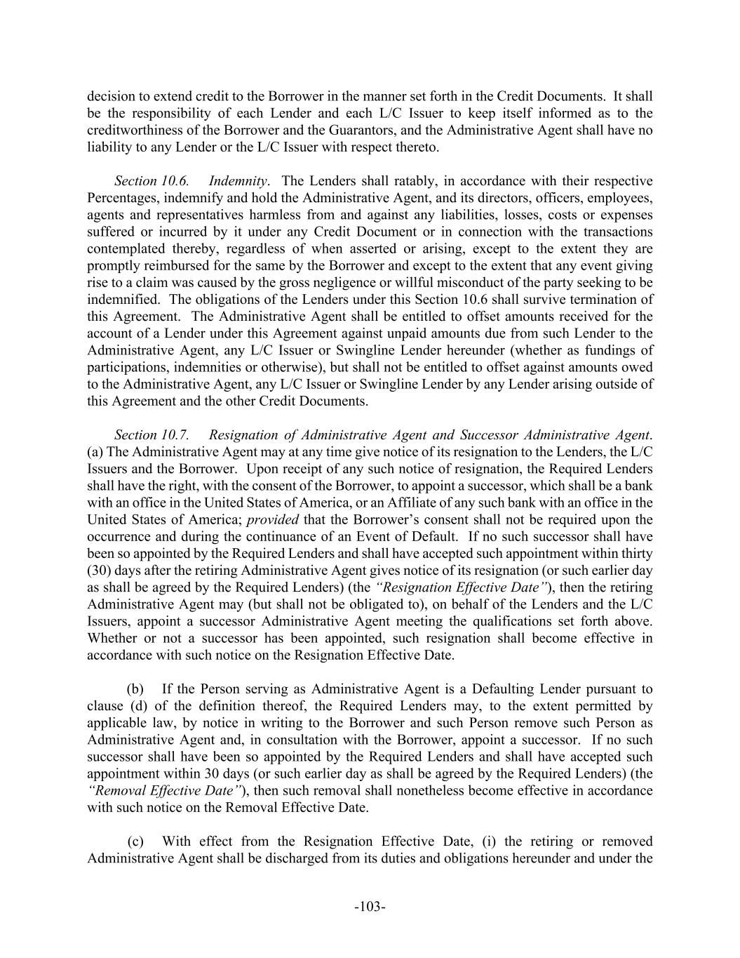 -103- decision to extend credit to the Borrower in the manner set forth in the Credit Documents. It shall be the responsibility of each Lender and each L/C Issuer to keep itself informed as to the creditworthiness of the Borrower and the Guarantors, and the Administrative Agent shall have no liability to any Lender or the L/C Issuer with respect thereto. Section 10.6. Indemnity. The Lenders shall ratably, in accordance with their respective Percentages, indemnify and hold the Administrative Agent, and its directors, officers, employees, agents and representatives harmless from and against any liabilities, losses, costs or expenses suffered or incurred by it under any Credit Document or in connection with the transactions contemplated thereby, regardless of when asserted or arising, except to the extent they are promptly reimbursed for the same by the Borrower and except to the extent that any event giving rise to a claim was caused by the gross negligence or willful misconduct of the party seeking to be indemnified. The obligations of the Lenders under this Section 10.6 shall survive termination of this Agreement. The Administrative Agent shall be entitled to offset amounts received for the account of a Lender under this Agreement against unpaid amounts due from such Lender to the Administrative Agent, any L/C Issuer or Swingline Lender hereunder (whether as fundings of participations, indemnities or otherwise), but shall not be entitled to offset against amounts owed to the Administrative Agent, any L/C Issuer or Swingline Lender by any Lender arising outside of this Agreement and the other Credit Documents. Section 10.7. Resignation of Administrative Agent and Successor Administrative Agent. (a) The Administrative Agent may at any time give notice of its resignation to the Lenders, the L/C Issuers and the Borrower. Upon receipt of any such notice of resignation, the Required Lenders shall have the right, with the consent of the Borrower, to appoint a successor, which shall be a bank with an office in the United States of America, or an Affiliate of any such bank with an office in the United States of America; provided that the Borrower’s consent shall not be required upon the occurrence and during the continuance of an Event of Default. If no such successor shall have been so appointed by the Required Lenders and shall have accepted such appointment within thirty (30) days after the retiring Administrative Agent gives notice of its resignation (or such earlier day as shall be agreed by the Required Lenders) (the “Resignation Effective Date”), then the retiring Administrative Agent may (but shall not be obligated to), on behalf of the Lenders and the L/C Issuers, appoint a successor Administrative Agent meeting the qualifications set forth above. Whether or not a successor has been appointed, such resignation shall become effective in accordance with such notice on the Resignation Effective Date. (b) If the Person serving as Administrative Agent is a Defaulting Lender pursuant to clause (d) of the definition thereof, the Required Lenders may, to the extent permitted by applicable law, by notice in writing to the Borrower and such Person remove such Person as Administrative Agent and, in consultation with the Borrower, appoint a successor. If no such successor shall have been so appointed by the Required Lenders and shall have accepted such appointment within 30 days (or such earlier day as shall be agreed by the Required Lenders) (the “Removal Effective Date”), then such removal shall nonetheless become effective in accordance with such notice on the Removal Effective Date. (c) With effect from the Resignation Effective Date, (i) the retiring or removed Administrative Agent shall be discharged from its duties and obligations hereunder and under the