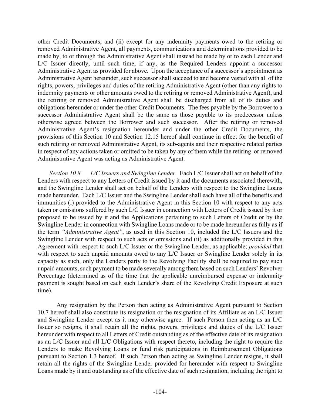 -104- other Credit Documents, and (ii) except for any indemnity payments owed to the retiring or removed Administrative Agent, all payments, communications and determinations provided to be made by, to or through the Administrative Agent shall instead be made by or to each Lender and L/C Issuer directly, until such time, if any, as the Required Lenders appoint a successor Administrative Agent as provided for above. Upon the acceptance of a successor’s appointment as Administrative Agent hereunder, such successor shall succeed to and become vested with all of the rights, powers, privileges and duties of the retiring Administrative Agent (other than any rights to indemnity payments or other amounts owed to the retiring or removed Administrative Agent), and the retiring or removed Administrative Agent shall be discharged from all of its duties and obligations hereunder or under the other Credit Documents. The fees payable by the Borrower to a successor Administrative Agent shall be the same as those payable to its predecessor unless otherwise agreed between the Borrower and such successor. After the retiring or removed Administrative Agent’s resignation hereunder and under the other Credit Documents, the provisions of this Section 10 and Section 12.15 hereof shall continue in effect for the benefit of such retiring or removed Administrative Agent, its sub-agents and their respective related parties in respect of any actions taken or omitted to be taken by any of them while the retiring or removed Administrative Agent was acting as Administrative Agent. Section 10.8. L/C Issuers and Swingline Lender. Each L/C Issuer shall act on behalf of the Lenders with respect to any Letters of Credit issued by it and the documents associated therewith, and the Swingline Lender shall act on behalf of the Lenders with respect to the Swingline Loans made hereunder. Each L/C Issuer and the Swingline Lender shall each have all of the benefits and immunities (i) provided to the Administrative Agent in this Section 10 with respect to any acts taken or omissions suffered by such L/C Issuer in connection with Letters of Credit issued by it or proposed to be issued by it and the Applications pertaining to such Letters of Credit or by the Swingline Lender in connection with Swingline Loans made or to be made hereunder as fully as if the term “Administrative Agent”, as used in this Section 10, included the L/C Issuers and the Swingline Lender with respect to such acts or omissions and (ii) as additionally provided in this Agreement with respect to such L/C Issuer or the Swingline Lender, as applicable; provided that with respect to such unpaid amounts owed to any L/C Issuer or Swingline Lender solely in its capacity as such, only the Lenders party to the Revolving Facility shall be required to pay such unpaid amounts, such payment to be made severally among them based on such Lenders’ Revolver Percentage (determined as of the time that the applicable unreimbursed expense or indemnity payment is sought based on each such Lender’s share of the Revolving Credit Exposure at such time). Any resignation by the Person then acting as Administrative Agent pursuant to Section 10.7 hereof shall also constitute its resignation or the resignation of its Affiliate as an L/C Issuer and Swingline Lender except as it may otherwise agree. If such Person then acting as an L/C Issuer so resigns, it shall retain all the rights, powers, privileges and duties of the L/C Issuer hereunder with respect to all Letters of Credit outstanding as of the effective date of its resignation as an L/C Issuer and all L/C Obligations with respect thereto, including the right to require the Lenders to make Revolving Loans or fund risk participations in Reimbursement Obligations pursuant to Section 1.3 hereof. If such Person then acting as Swingline Lender resigns, it shall retain all the rights of the Swingline Lender provided for hereunder with respect to Swingline Loans made by it and outstanding as of the effective date of such resignation, including the right to