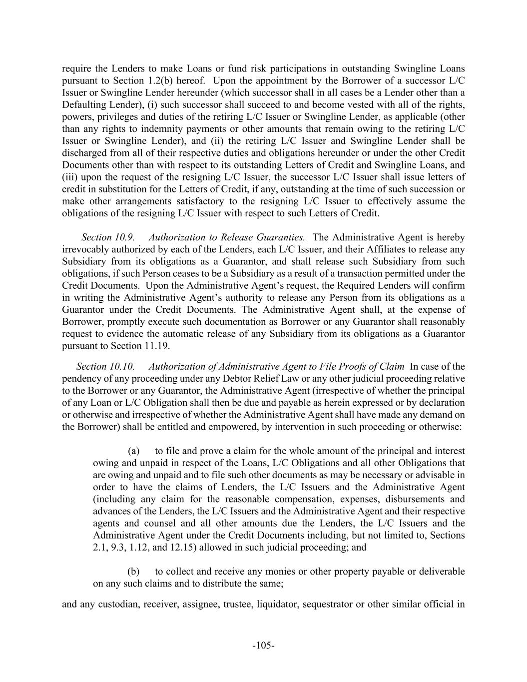 -105- require the Lenders to make Loans or fund risk participations in outstanding Swingline Loans pursuant to Section 1.2(b) hereof. Upon the appointment by the Borrower of a successor L/C Issuer or Swingline Lender hereunder (which successor shall in all cases be a Lender other than a Defaulting Lender), (i) such successor shall succeed to and become vested with all of the rights, powers, privileges and duties of the retiring L/C Issuer or Swingline Lender, as applicable (other than any rights to indemnity payments or other amounts that remain owing to the retiring L/C Issuer or Swingline Lender), and (ii) the retiring L/C Issuer and Swingline Lender shall be discharged from all of their respective duties and obligations hereunder or under the other Credit Documents other than with respect to its outstanding Letters of Credit and Swingline Loans, and (iii) upon the request of the resigning L/C Issuer, the successor L/C Issuer shall issue letters of credit in substitution for the Letters of Credit, if any, outstanding at the time of such succession or make other arrangements satisfactory to the resigning L/C Issuer to effectively assume the obligations of the resigning L/C Issuer with respect to such Letters of Credit. Section 10.9. Authorization to Release Guaranties. The Administrative Agent is hereby irrevocably authorized by each of the Lenders, each L/C Issuer, and their Affiliates to release any Subsidiary from its obligations as a Guarantor, and shall release such Subsidiary from such obligations, if such Person ceases to be a Subsidiary as a result of a transaction permitted under the Credit Documents. Upon the Administrative Agent’s request, the Required Lenders will confirm in writing the Administrative Agent’s authority to release any Person from its obligations as a Guarantor under the Credit Documents. The Administrative Agent shall, at the expense of Borrower, promptly execute such documentation as Borrower or any Guarantor shall reasonably request to evidence the automatic release of any Subsidiary from its obligations as a Guarantor pursuant to Section 11.19. Section 10.10. Authorization of Administrative Agent to File Proofs of Claim In case of the pendency of any proceeding under any Debtor Relief Law or any other judicial proceeding relative to the Borrower or any Guarantor, the Administrative Agent (irrespective of whether the principal of any Loan or L/C Obligation shall then be due and payable as herein expressed or by declaration or otherwise and irrespective of whether the Administrative Agent shall have made any demand on the Borrower) shall be entitled and empowered, by intervention in such proceeding or otherwise: (a) to file and prove a claim for the whole amount of the principal and interest owing and unpaid in respect of the Loans, L/C Obligations and all other Obligations that are owing and unpaid and to file such other documents as may be necessary or advisable in order to have the claims of Lenders, the L/C Issuers and the Administrative Agent (including any claim for the reasonable compensation, expenses, disbursements and advances of the Lenders, the L/C Issuers and the Administrative Agent and their respective agents and counsel and all other amounts due the Lenders, the L/C Issuers and the Administrative Agent under the Credit Documents including, but not limited to, Sections 2.1, 9.3, 1.12, and 12.15) allowed in such judicial proceeding; and (b) to collect and receive any monies or other property payable or deliverable on any such claims and to distribute the same; and any custodian, receiver, assignee, trustee, liquidator, sequestrator or other similar official in