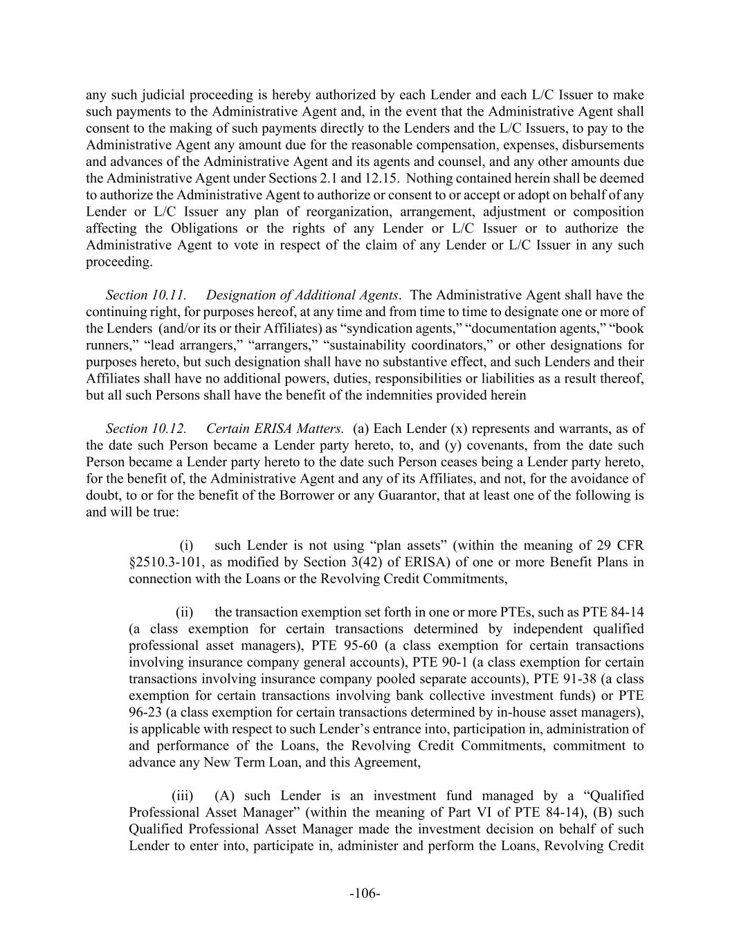 -106- any such judicial proceeding is hereby authorized by each Lender and each L/C Issuer to make such payments to the Administrative Agent and, in the event that the Administrative Agent shall consent to the making of such payments directly to the Lenders and the L/C Issuers, to pay to the Administrative Agent any amount due for the reasonable compensation, expenses, disbursements and advances of the Administrative Agent and its agents and counsel, and any other amounts due the Administrative Agent under Sections 2.1 and 12.15. Nothing contained herein shall be deemed to authorize the Administrative Agent to authorize or consent to or accept or adopt on behalf of any Lender or L/C Issuer any plan of reorganization, arrangement, adjustment or composition affecting the Obligations or the rights of any Lender or L/C Issuer or to authorize the Administrative Agent to vote in respect of the claim of any Lender or L/C Issuer in any such proceeding. Section 10.11. Designation of Additional Agents. The Administrative Agent shall have the continuing right, for purposes hereof, at any time and from time to time to designate one or more of the Lenders (and/or its or their Affiliates) as “syndication agents,” “documentation agents,” “book runners,” “lead arrangers,” “arrangers,” “sustainability coordinators,” or other designations for purposes hereto, but such designation shall have no substantive effect, and such Lenders and their Affiliates shall have no additional powers, duties, responsibilities or liabilities as a result thereof, but all such Persons shall have the benefit of the indemnities provided herein Section 10.12. Certain ERISA Matters. (a) Each Lender (x) represents and warrants, as of the date such Person became a Lender party hereto, to, and (y) covenants, from the date such Person became a Lender party hereto to the date such Person ceases being a Lender party hereto, for the benefit of, the Administrative Agent and any of its Affiliates, and not, for the avoidance of doubt, to or for the benefit of the Borrower or any Guarantor, that at least one of the following is and will be true: (i) such Lender is not using “plan assets” (within the meaning of 29 CFR §2510.3-101, as modified by Section 3(42) of ERISA) of one or more Benefit Plans in connection with the Loans or the Revolving Credit Commitments, (ii) the transaction exemption set forth in one or more PTEs, such as PTE 84-14 (a class exemption for certain transactions determined by independent qualified professional asset managers), PTE 95-60 (a class exemption for certain transactions involving insurance company general accounts), PTE 90-1 (a class exemption for certain transactions involving insurance company pooled separate accounts), PTE 91-38 (a class exemption for certain transactions involving bank collective investment funds) or PTE 96-23 (a class exemption for certain transactions determined by in-house asset managers), is applicable with respect to such Lender’s entrance into, participation in, administration of and performance of the Loans, the Revolving Credit Commitments, commitment to advance any New Term Loan, and this Agreement, (iii) (A) such Lender is an investment fund managed by a “Qualified Professional Asset Manager” (within the meaning of Part VI of PTE 84-14), (B) such Qualified Professional Asset Manager made the investment decision on behalf of such Lender to enter into, participate in, administer and perform the Loans, Revolving Credit