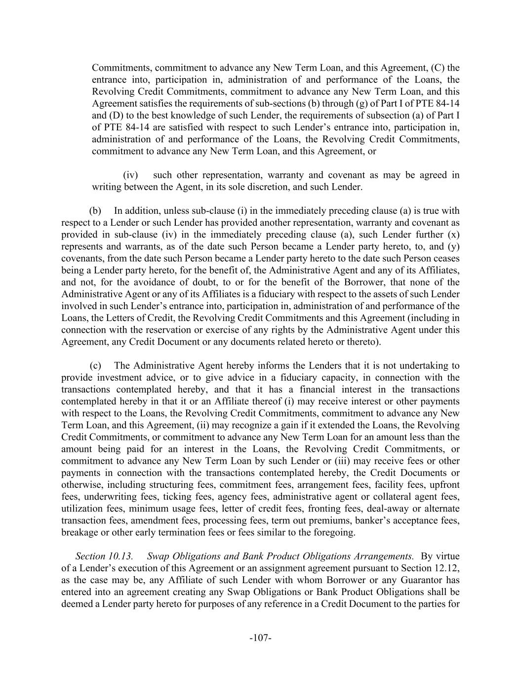 -107- Commitments, commitment to advance any New Term Loan, and this Agreement, (C) the entrance into, participation in, administration of and performance of the Loans, the Revolving Credit Commitments, commitment to advance any New Term Loan, and this Agreement satisfies the requirements of sub-sections (b) through (g) of Part I of PTE 84-14 and (D) to the best knowledge of such Lender, the requirements of subsection (a) of Part I of PTE 84-14 are satisfied with respect to such Lender’s entrance into, participation in, administration of and performance of the Loans, the Revolving Credit Commitments, commitment to advance any New Term Loan, and this Agreement, or (iv) such other representation, warranty and covenant as may be agreed in writing between the Agent, in its sole discretion, and such Lender. (b) In addition, unless sub-clause (i) in the immediately preceding clause (a) is true with respect to a Lender or such Lender has provided another representation, warranty and covenant as provided in sub-clause (iv) in the immediately preceding clause (a), such Lender further (x) represents and warrants, as of the date such Person became a Lender party hereto, to, and (y) covenants, from the date such Person became a Lender party hereto to the date such Person ceases being a Lender party hereto, for the benefit of, the Administrative Agent and any of its Affiliates, and not, for the avoidance of doubt, to or for the benefit of the Borrower, that none of the Administrative Agent or any of its Affiliates is a fiduciary with respect to the assets of such Lender involved in such Lender’s entrance into, participation in, administration of and performance of the Loans, the Letters of Credit, the Revolving Credit Commitments and this Agreement (including in connection with the reservation or exercise of any rights by the Administrative Agent under this Agreement, any Credit Document or any documents related hereto or thereto). (c) The Administrative Agent hereby informs the Lenders that it is not undertaking to provide investment advice, or to give advice in a fiduciary capacity, in connection with the transactions contemplated hereby, and that it has a financial interest in the transactions contemplated hereby in that it or an Affiliate thereof (i) may receive interest or other payments with respect to the Loans, the Revolving Credit Commitments, commitment to advance any New Term Loan, and this Agreement, (ii) may recognize a gain if it extended the Loans, the Revolving Credit Commitments, or commitment to advance any New Term Loan for an amount less than the amount being paid for an interest in the Loans, the Revolving Credit Commitments, or commitment to advance any New Term Loan by such Lender or (iii) may receive fees or other payments in connection with the transactions contemplated hereby, the Credit Documents or otherwise, including structuring fees, commitment fees, arrangement fees, facility fees, upfront fees, underwriting fees, ticking fees, agency fees, administrative agent or collateral agent fees, utilization fees, minimum usage fees, letter of credit fees, fronting fees, deal-away or alternate transaction fees, amendment fees, processing fees, term out premiums, banker’s acceptance fees, breakage or other early termination fees or fees similar to the foregoing. Section 10.13. Swap Obligations and Bank Product Obligations Arrangements. By virtue of a Lender’s execution of this Agreement or an assignment agreement pursuant to Section 12.12, as the case may be, any Affiliate of such Lender with whom Borrower or any Guarantor has entered into an agreement creating any Swap Obligations or Bank Product Obligations shall be deemed a Lender party hereto for purposes of any reference in a Credit Document to the parties for