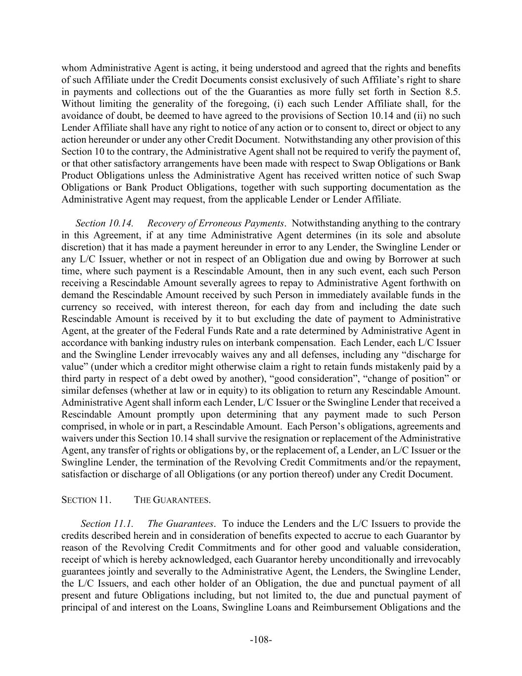 -108- whom Administrative Agent is acting, it being understood and agreed that the rights and benefits of such Affiliate under the Credit Documents consist exclusively of such Affiliate’s right to share in payments and collections out of the the Guaranties as more fully set forth in Section 8.5. Without limiting the generality of the foregoing, (i) each such Lender Affiliate shall, for the avoidance of doubt, be deemed to have agreed to the provisions of Section 10.14 and (ii) no such Lender Affiliate shall have any right to notice of any action or to consent to, direct or object to any action hereunder or under any other Credit Document. Notwithstanding any other provision of this Section 10 to the contrary, the Administrative Agent shall not be required to verify the payment of, or that other satisfactory arrangements have been made with respect to Swap Obligations or Bank Product Obligations unless the Administrative Agent has received written notice of such Swap Obligations or Bank Product Obligations, together with such supporting documentation as the Administrative Agent may request, from the applicable Lender or Lender Affiliate. Section 10.14. Recovery of Erroneous Payments. Notwithstanding anything to the contrary in this Agreement, if at any time Administrative Agent determines (in its sole and absolute discretion) that it has made a payment hereunder in error to any Lender, the Swingline Lender or any L/C Issuer, whether or not in respect of an Obligation due and owing by Borrower at such time, where such payment is a Rescindable Amount, then in any such event, each such Person receiving a Rescindable Amount severally agrees to repay to Administrative Agent forthwith on demand the Rescindable Amount received by such Person in immediately available funds in the currency so received, with interest thereon, for each day from and including the date such Rescindable Amount is received by it to but excluding the date of payment to Administrative Agent, at the greater of the Federal Funds Rate and a rate determined by Administrative Agent in accordance with banking industry rules on interbank compensation. Each Lender, each L/C Issuer and the Swingline Lender irrevocably waives any and all defenses, including any “discharge for value” (under which a creditor might otherwise claim a right to retain funds mistakenly paid by a third party in respect of a debt owed by another), “good consideration”, “change of position” or similar defenses (whether at law or in equity) to its obligation to return any Rescindable Amount. Administrative Agent shall inform each Lender, L/C Issuer or the Swingline Lender that received a Rescindable Amount promptly upon determining that any payment made to such Person comprised, in whole or in part, a Rescindable Amount. Each Person’s obligations, agreements and waivers under this Section 10.14 shall survive the resignation or replacement of the Administrative Agent, any transfer of rights or obligations by, or the replacement of, a Lender, an L/C Issuer or the Swingline Lender, the termination of the Revolving Credit Commitments and/or the repayment, satisfaction or discharge of all Obligations (or any portion thereof) under any Credit Document. SECTION 11. THE GUARANTEES. Section 11.1. The Guarantees. To induce the Lenders and the L/C Issuers to provide the credits described herein and in consideration of benefits expected to accrue to each Guarantor by reason of the Revolving Credit Commitments and for other good and valuable consideration, receipt of which is hereby acknowledged, each Guarantor hereby unconditionally and irrevocably guarantees jointly and severally to the Administrative Agent, the Lenders, the Swingline Lender, the L/C Issuers, and each other holder of an Obligation, the due and punctual payment of all present and future Obligations including, but not limited to, the due and punctual payment of principal of and interest on the Loans, Swingline Loans and Reimbursement Obligations and the