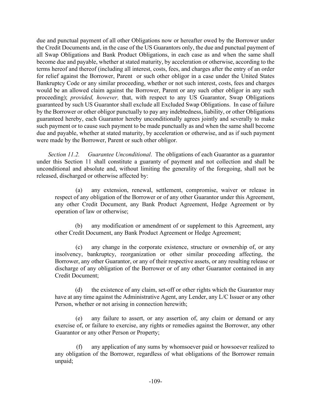 -109- due and punctual payment of all other Obligations now or hereafter owed by the Borrower under the Credit Documents and, in the case of the US Guarantors only, the due and punctual payment of all Swap Obligations and Bank Product Obligations, in each case as and when the same shall become due and payable, whether at stated maturity, by acceleration or otherwise, according to the terms hereof and thereof (including all interest, costs, fees, and charges after the entry of an order for relief against the Borrower, Parent or such other obligor in a case under the United States Bankruptcy Code or any similar proceeding, whether or not such interest, costs, fees and charges would be an allowed claim against the Borrower, Parent or any such other obligor in any such proceeding); provided, however, that, with respect to any US Guarantor, Swap Obligations guaranteed by such US Guarantor shall exclude all Excluded Swap Obligations. In case of failure by the Borrower or other obligor punctually to pay any indebtedness, liability, or other Obligations guaranteed hereby, each Guarantor hereby unconditionally agrees jointly and severally to make such payment or to cause such payment to be made punctually as and when the same shall become due and payable, whether at stated maturity, by acceleration or otherwise, and as if such payment were made by the Borrower, Parent or such other obligor. Section 11.2. Guarantee Unconditional. The obligations of each Guarantor as a guarantor under this Section 11 shall constitute a guaranty of payment and not collection and shall be unconditional and absolute and, without limiting the generality of the foregoing, shall not be released, discharged or otherwise affected by: (a) any extension, renewal, settlement, compromise, waiver or release in respect of any obligation of the Borrower or of any other Guarantor under this Agreement, any other Credit Document, any Bank Product Agreement, Hedge Agreement or by operation of law or otherwise; (b) any modification or amendment of or supplement to this Agreement, any other Credit Document, any Bank Product Agreement or Hedge Agreement; (c) any change in the corporate existence, structure or ownership of, or any insolvency, bankruptcy, reorganization or other similar proceeding affecting, the Borrower, any other Guarantor, or any of their respective assets, or any resulting release or discharge of any obligation of the Borrower or of any other Guarantor contained in any Credit Document; (d) the existence of any claim, set-off or other rights which the Guarantor may have at any time against the Administrative Agent, any Lender, any L/C Issuer or any other Person, whether or not arising in connection herewith; (e) any failure to assert, or any assertion of, any claim or demand or any exercise of, or failure to exercise, any rights or remedies against the Borrower, any other Guarantor or any other Person or Property; (f) any application of any sums by whomsoever paid or howsoever realized to any obligation of the Borrower, regardless of what obligations of the Borrower remain unpaid;