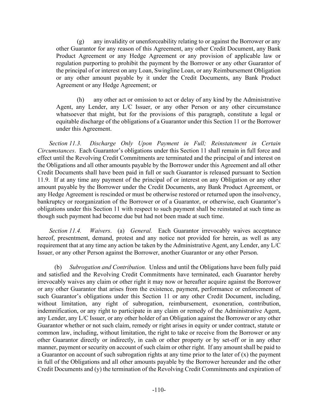 -110- (g) any invalidity or unenforceability relating to or against the Borrower or any other Guarantor for any reason of this Agreement, any other Credit Document, any Bank Product Agreement or any Hedge Agreement or any provision of applicable law or regulation purporting to prohibit the payment by the Borrower or any other Guarantor of the principal of or interest on any Loan, Swingline Loan, or any Reimbursement Obligation or any other amount payable by it under the Credit Documents, any Bank Product Agreement or any Hedge Agreement; or (h) any other act or omission to act or delay of any kind by the Administrative Agent, any Lender, any L/C Issuer, or any other Person or any other circumstance whatsoever that might, but for the provisions of this paragraph, constitute a legal or equitable discharge of the obligations of a Guarantor under this Section 11 or the Borrower under this Agreement. Section 11.3. Discharge Only Upon Payment in Full; Reinstatement in Certain Circumstances. Each Guarantor’s obligations under this Section 11 shall remain in full force and effect until the Revolving Credit Commitments are terminated and the principal of and interest on the Obligations and all other amounts payable by the Borrower under this Agreement and all other Credit Documents shall have been paid in full or such Guarantor is released pursuant to Section 11.9. If at any time any payment of the principal of or interest on any Obligation or any other amount payable by the Borrower under the Credit Documents, any Bank Product Agreement, or any Hedge Agreement is rescinded or must be otherwise restored or returned upon the insolvency, bankruptcy or reorganization of the Borrower or of a Guarantor, or otherwise, each Guarantor’s obligations under this Section 11 with respect to such payment shall be reinstated at such time as though such payment had become due but had not been made at such time. Section 11.4. Waivers. (a) General. Each Guarantor irrevocably waives acceptance hereof, presentment, demand, protest and any notice not provided for herein, as well as any requirement that at any time any action be taken by the Administrative Agent, any Lender, any L/C Issuer, or any other Person against the Borrower, another Guarantor or any other Person. (b) Subrogation and Contribution. Unless and until the Obligations have been fully paid and satisfied and the Revolving Credit Commitments have terminated, each Guarantor hereby irrevocably waives any claim or other right it may now or hereafter acquire against the Borrower or any other Guarantor that arises from the existence, payment, performance or enforcement of such Guarantor’s obligations under this Section 11 or any other Credit Document, including, without limitation, any right of subrogation, reimbursement, exoneration, contribution, indemnification, or any right to participate in any claim or remedy of the Administrative Agent, any Lender, any L/C Issuer, or any other holder of an Obligation against the Borrower or any other Guarantor whether or not such claim, remedy or right arises in equity or under contract, statute or common law, including, without limitation, the right to take or receive from the Borrower or any other Guarantor directly or indirectly, in cash or other property or by set-off or in any other manner, payment or security on account of such claim or other right. If any amount shall be paid to a Guarantor on account of such subrogation rights at any time prior to the later of (x) the payment in full of the Obligations and all other amounts payable by the Borrower hereunder and the other Credit Documents and (y) the termination of the Revolving Credit Commitments and expiration of