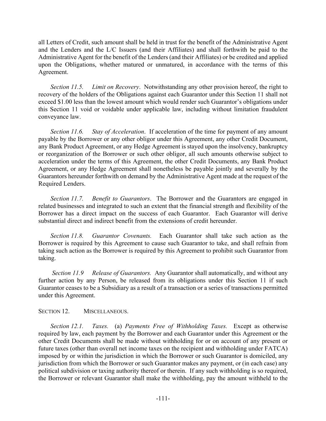 -111- all Letters of Credit, such amount shall be held in trust for the benefit of the Administrative Agent and the Lenders and the L/C Issuers (and their Affiliates) and shall forthwith be paid to the Administrative Agent for the benefit of the Lenders (and their Affiliates) or be credited and applied upon the Obligations, whether matured or unmatured, in accordance with the terms of this Agreement. Section 11.5. Limit on Recovery. Notwithstanding any other provision hereof, the right to recovery of the holders of the Obligations against each Guarantor under this Section 11 shall not exceed $1.00 less than the lowest amount which would render such Guarantor’s obligations under this Section 11 void or voidable under applicable law, including without limitation fraudulent conveyance law. Section 11.6. Stay of Acceleration. If acceleration of the time for payment of any amount payable by the Borrower or any other obligor under this Agreement, any other Credit Document, any Bank Product Agreement, or any Hedge Agreement is stayed upon the insolvency, bankruptcy or reorganization of the Borrower or such other obligor, all such amounts otherwise subject to acceleration under the terms of this Agreement, the other Credit Documents, any Bank Product Agreement, or any Hedge Agreement shall nonetheless be payable jointly and severally by the Guarantors hereunder forthwith on demand by the Administrative Agent made at the request of the Required Lenders. Section 11.7. Benefit to Guarantors. The Borrower and the Guarantors are engaged in related businesses and integrated to such an extent that the financial strength and flexibility of the Borrower has a direct impact on the success of each Guarantor. Each Guarantor will derive substantial direct and indirect benefit from the extensions of credit hereunder. Section 11.8. Guarantor Covenants. Each Guarantor shall take such action as the Borrower is required by this Agreement to cause such Guarantor to take, and shall refrain from taking such action as the Borrower is required by this Agreement to prohibit such Guarantor from taking. Section 11.9 Release of Guarantors. Any Guarantor shall automatically, and without any further action by any Person, be released from its obligations under this Section 11 if such Guarantor ceases to be a Subsidiary as a result of a transaction or a series of transactions permitted under this Agreement. SECTION 12. MISCELLANEOUS. Section 12.1. Taxes. (a) Payments Free of Withholding Taxes. Except as otherwise required by law, each payment by the Borrower and each Guarantor under this Agreement or the other Credit Documents shall be made without withholding for or on account of any present or future taxes (other than overall net income taxes on the recipient and withholding under FATCA) imposed by or within the jurisdiction in which the Borrower or such Guarantor is domiciled, any jurisdiction from which the Borrower or such Guarantor makes any payment, or (in each case) any political subdivision or taxing authority thereof or therein. If any such withholding is so required, the Borrower or relevant Guarantor shall make the withholding, pay the amount withheld to the