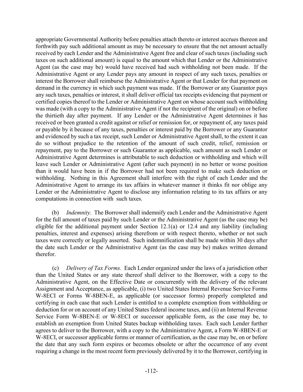 -112- appropriate Governmental Authority before penalties attach thereto or interest accrues thereon and forthwith pay such additional amount as may be necessary to ensure that the net amount actually received by each Lender and the Administrative Agent free and clear of such taxes (including such taxes on such additional amount) is equal to the amount which that Lender or the Administrative Agent (as the case may be) would have received had such withholding not been made. If the Administrative Agent or any Lender pays any amount in respect of any such taxes, penalties or interest the Borrower shall reimburse the Administrative Agent or that Lender for that payment on demand in the currency in which such payment was made. If the Borrower or any Guarantor pays any such taxes, penalties or interest, it shall deliver official tax receipts evidencing that payment or certified copies thereof to the Lender or Administrative Agent on whose account such withholding was made (with a copy to the Administrative Agent if not the recipient of the original) on or before the thirtieth day after payment. If any Lender or the Administrative Agent determines it has received or been granted a credit against or relief or remission for, or repayment of, any taxes paid or payable by it because of any taxes, penalties or interest paid by the Borrower or any Guarantor and evidenced by such a tax receipt, such Lender or Administrative Agent shall, to the extent it can do so without prejudice to the retention of the amount of such credit, relief, remission or repayment, pay to the Borrower or such Guarantor as applicable, such amount as such Lender or Administrative Agent determines is attributable to such deduction or withholding and which will leave such Lender or Administrative Agent (after such payment) in no better or worse position than it would have been in if the Borrower had not been required to make such deduction or withholding. Nothing in this Agreement shall interfere with the right of each Lender and the Administrative Agent to arrange its tax affairs in whatever manner it thinks fit nor oblige any Lender or the Administrative Agent to disclose any information relating to its tax affairs or any computations in connection with such taxes. (b) Indemnity. The Borrower shall indemnify each Lender and the Administrative Agent for the full amount of taxes paid by such Lender or the Administrative Agent (as the case may be) eligible for the additional payment under Section 12.1(a) or 12.4 and any liability (including penalties, interest and expenses) arising therefrom or with respect thereto, whether or not such taxes were correctly or legally asserted. Such indemnification shall be made within 30 days after the date such Lender or the Administrative Agent (as the case may be) makes written demand therefor. (c) Delivery of Tax Forms. Each Lender organized under the laws of a jurisdiction other than the United States or any state thereof shall deliver to the Borrower, with a copy to the Administrative Agent, on the Effective Date or concurrently with the delivery of the relevant Assignment and Acceptance, as applicable, (i) two United States Internal Revenue Service Forms W-8ECI or Forms W-8BEN-E, as applicable (or successor forms) properly completed and certifying in each case that such Lender is entitled to a complete exemption from withholding or deduction for or on account of any United States federal income taxes, and (ii) an Internal Revenue Service Form W-8BEN-E or W-8ECI or successor applicable form, as the case may be, to establish an exemption from United States backup withholding taxes. Each such Lender further agrees to deliver to the Borrower, with a copy to the Administrative Agent, a Form W-8BEN-E or W-8ECI, or successor applicable forms or manner of certification, as the case may be, on or before the date that any such form expires or becomes obsolete or after the occurrence of any event requiring a change in the most recent form previously delivered by it to the Borrower, certifying in