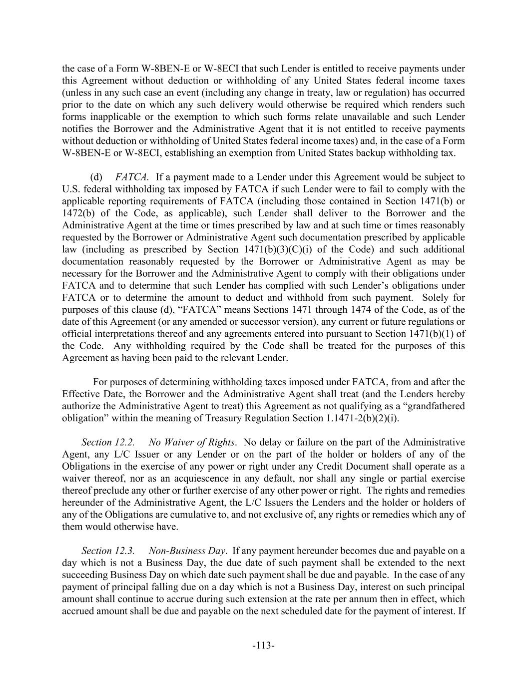-113- the case of a Form W-8BEN-E or W-8ECI that such Lender is entitled to receive payments under this Agreement without deduction or withholding of any United States federal income taxes (unless in any such case an event (including any change in treaty, law or regulation) has occurred prior to the date on which any such delivery would otherwise be required which renders such forms inapplicable or the exemption to which such forms relate unavailable and such Lender notifies the Borrower and the Administrative Agent that it is not entitled to receive payments without deduction or withholding of United States federal income taxes) and, in the case of a Form W-8BEN-E or W-8ECI, establishing an exemption from United States backup withholding tax. (d) FATCA. If a payment made to a Lender under this Agreement would be subject to U.S. federal withholding tax imposed by FATCA if such Lender were to fail to comply with the applicable reporting requirements of FATCA (including those contained in Section 1471(b) or 1472(b) of the Code, as applicable), such Lender shall deliver to the Borrower and the Administrative Agent at the time or times prescribed by law and at such time or times reasonably requested by the Borrower or Administrative Agent such documentation prescribed by applicable law (including as prescribed by Section 1471(b)(3)(C)(i) of the Code) and such additional documentation reasonably requested by the Borrower or Administrative Agent as may be necessary for the Borrower and the Administrative Agent to comply with their obligations under FATCA and to determine that such Lender has complied with such Lender’s obligations under FATCA or to determine the amount to deduct and withhold from such payment. Solely for purposes of this clause (d), “FATCA” means Sections 1471 through 1474 of the Code, as of the date of this Agreement (or any amended or successor version), any current or future regulations or official interpretations thereof and any agreements entered into pursuant to Section 1471(b)(1) of the Code. Any withholding required by the Code shall be treated for the purposes of this Agreement as having been paid to the relevant Lender. For purposes of determining withholding taxes imposed under FATCA, from and after the Effective Date, the Borrower and the Administrative Agent shall treat (and the Lenders hereby authorize the Administrative Agent to treat) this Agreement as not qualifying as a “grandfathered obligation” within the meaning of Treasury Regulation Section 1.1471-2(b)(2)(i). Section 12.2. No Waiver of Rights. No delay or failure on the part of the Administrative Agent, any L/C Issuer or any Lender or on the part of the holder or holders of any of the Obligations in the exercise of any power or right under any Credit Document shall operate as a waiver thereof, nor as an acquiescence in any default, nor shall any single or partial exercise thereof preclude any other or further exercise of any other power or right. The rights and remedies hereunder of the Administrative Agent, the L/C Issuers the Lenders and the holder or holders of any of the Obligations are cumulative to, and not exclusive of, any rights or remedies which any of them would otherwise have. Section 12.3. Non-Business Day. If any payment hereunder becomes due and payable on a day which is not a Business Day, the due date of such payment shall be extended to the next succeeding Business Day on which date such payment shall be due and payable. In the case of any payment of principal falling due on a day which is not a Business Day, interest on such principal amount shall continue to accrue during such extension at the rate per annum then in effect, which accrued amount shall be due and payable on the next scheduled date for the payment of interest. If