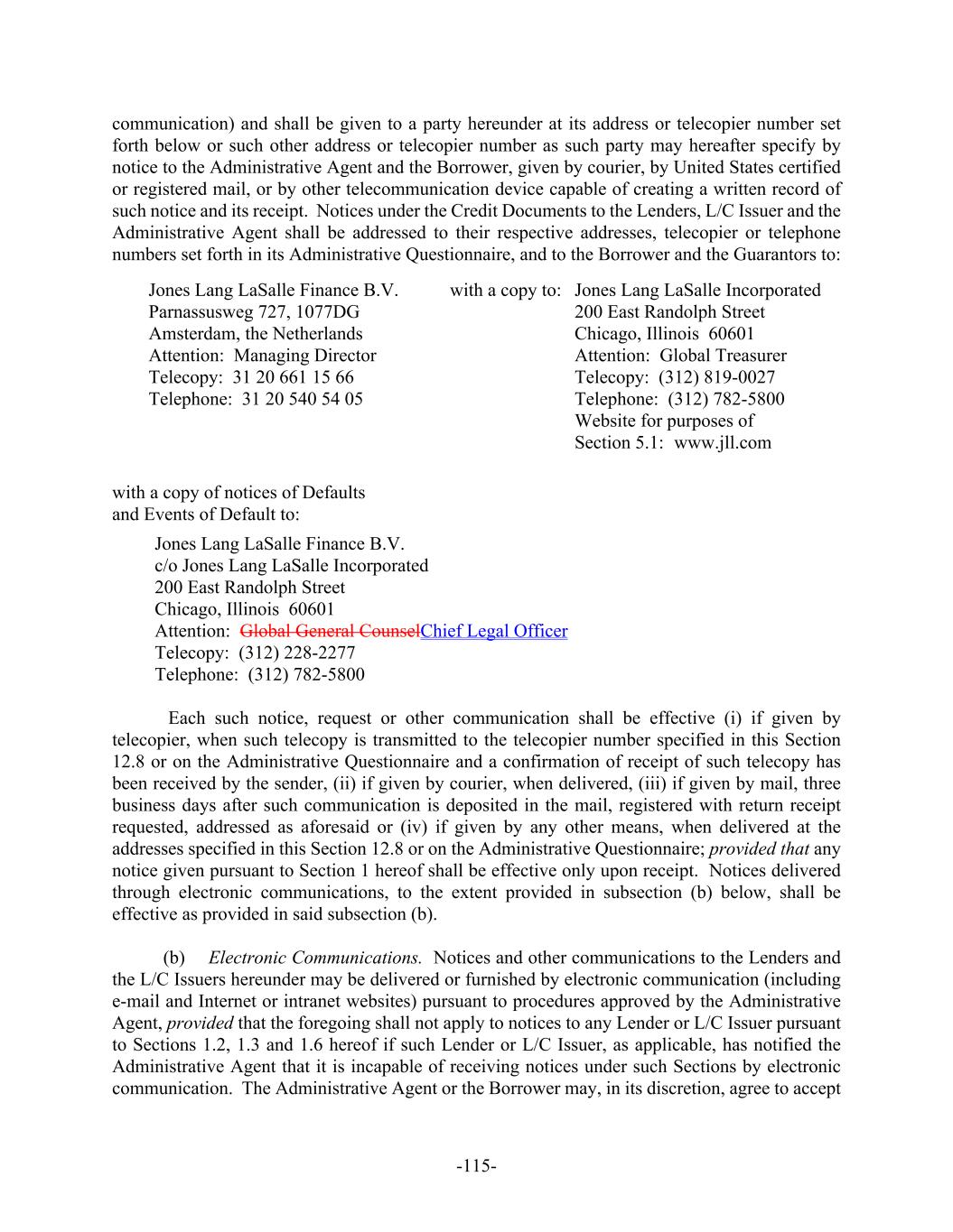 -115- communication) and shall be given to a party hereunder at its address or telecopier number set forth below or such other address or telecopier number as such party may hereafter specify by notice to the Administrative Agent and the Borrower, given by courier, by United States certified or registered mail, or by other telecommunication device capable of creating a written record of such notice and its receipt. Notices under the Credit Documents to the Lenders, L/C Issuer and the Administrative Agent shall be addressed to their respective addresses, telecopier or telephone numbers set forth in its Administrative Questionnaire, and to the Borrower and the Guarantors to: Jones Lang LaSalle Finance B.V. Parnassusweg 727, 1077DG Amsterdam, the Netherlands Attention: Managing Director Telecopy: 31 20 661 15 66 Telephone: 31 20 540 54 05 with a copy to: Jones Lang LaSalle Incorporated 200 East Randolph Street Chicago, Illinois 60601 Attention: Global Treasurer Telecopy: (312) 819-0027 Telephone: (312) 782-5800 Website for purposes of Section 5.1: www.jll.com with a copy of notices of Defaults and Events of Default to: Jones Lang LaSalle Finance B.V. c/o Jones Lang LaSalle Incorporated 200 East Randolph Street Chicago, Illinois 60601 Attention: Global General CounselChief Legal Officer Telecopy: (312) 228-2277 Telephone: (312) 782-5800 Each such notice, request or other communication shall be effective (i) if given by telecopier, when such telecopy is transmitted to the telecopier number specified in this Section 12.8 or on the Administrative Questionnaire and a confirmation of receipt of such telecopy has been received by the sender, (ii) if given by courier, when delivered, (iii) if given by mail, three business days after such communication is deposited in the mail, registered with return receipt requested, addressed as aforesaid or (iv) if given by any other means, when delivered at the addresses specified in this Section 12.8 or on the Administrative Questionnaire; provided that any notice given pursuant to Section 1 hereof shall be effective only upon receipt. Notices delivered through electronic communications, to the extent provided in subsection (b) below, shall be effective as provided in said subsection (b). (b) Electronic Communications. Notices and other communications to the Lenders and the L/C Issuers hereunder may be delivered or furnished by electronic communication (including e-mail and Internet or intranet websites) pursuant to procedures approved by the Administrative Agent, provided that the foregoing shall not apply to notices to any Lender or L/C Issuer pursuant to Sections 1.2, 1.3 and 1.6 hereof if such Lender or L/C Issuer, as applicable, has notified the Administrative Agent that it is incapable of receiving notices under such Sections by electronic communication. The Administrative Agent or the Borrower may, in its discretion, agree to accept