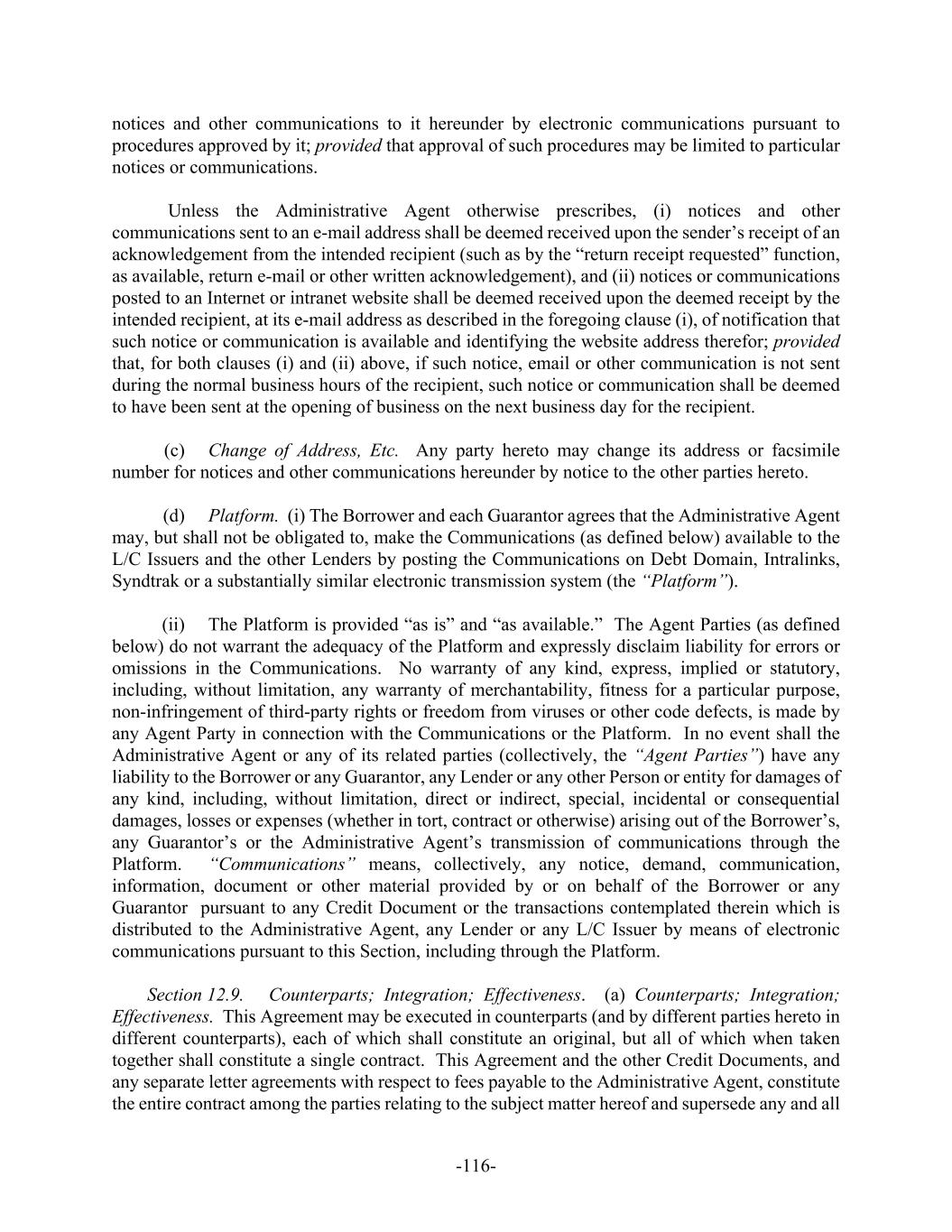 -116- notices and other communications to it hereunder by electronic communications pursuant to procedures approved by it; provided that approval of such procedures may be limited to particular notices or communications. Unless the Administrative Agent otherwise prescribes, (i) notices and other communications sent to an e-mail address shall be deemed received upon the sender’s receipt of an acknowledgement from the intended recipient (such as by the “return receipt requested” function, as available, return e-mail or other written acknowledgement), and (ii) notices or communications posted to an Internet or intranet website shall be deemed received upon the deemed receipt by the intended recipient, at its e-mail address as described in the foregoing clause (i), of notification that such notice or communication is available and identifying the website address therefor; provided that, for both clauses (i) and (ii) above, if such notice, email or other communication is not sent during the normal business hours of the recipient, such notice or communication shall be deemed to have been sent at the opening of business on the next business day for the recipient. (c) Change of Address, Etc. Any party hereto may change its address or facsimile number for notices and other communications hereunder by notice to the other parties hereto. (d) Platform. (i) The Borrower and each Guarantor agrees that the Administrative Agent may, but shall not be obligated to, make the Communications (as defined below) available to the L/C Issuers and the other Lenders by posting the Communications on Debt Domain, Intralinks, Syndtrak or a substantially similar electronic transmission system (the “Platform”). (ii) The Platform is provided “as is” and “as available.” The Agent Parties (as defined below) do not warrant the adequacy of the Platform and expressly disclaim liability for errors or omissions in the Communications. No warranty of any kind, express, implied or statutory, including, without limitation, any warranty of merchantability, fitness for a particular purpose, non-infringement of third-party rights or freedom from viruses or other code defects, is made by any Agent Party in connection with the Communications or the Platform. In no event shall the Administrative Agent or any of its related parties (collectively, the “Agent Parties”) have any liability to the Borrower or any Guarantor, any Lender or any other Person or entity for damages of any kind, including, without limitation, direct or indirect, special, incidental or consequential damages, losses or expenses (whether in tort, contract or otherwise) arising out of the Borrower’s, any Guarantor’s or the Administrative Agent’s transmission of communications through the Platform. “Communications” means, collectively, any notice, demand, communication, information, document or other material provided by or on behalf of the Borrower or any Guarantor pursuant to any Credit Document or the transactions contemplated therein which is distributed to the Administrative Agent, any Lender or any L/C Issuer by means of electronic communications pursuant to this Section, including through the Platform. Section 12.9. Counterparts; Integration; Effectiveness. (a) Counterparts; Integration; Effectiveness. This Agreement may be executed in counterparts (and by different parties hereto in different counterparts), each of which shall constitute an original, but all of which when taken together shall constitute a single contract. This Agreement and the other Credit Documents, and any separate letter agreements with respect to fees payable to the Administrative Agent, constitute the entire contract among the parties relating to the subject matter hereof and supersede any and all