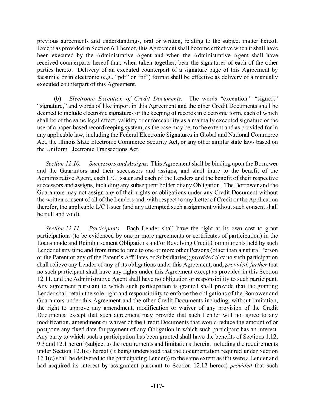 -117- previous agreements and understandings, oral or written, relating to the subject matter hereof. Except as provided in Section 6.1 hereof, this Agreement shall become effective when it shall have been executed by the Administrative Agent and when the Administrative Agent shall have received counterparts hereof that, when taken together, bear the signatures of each of the other parties hereto. Delivery of an executed counterpart of a signature page of this Agreement by facsimile or in electronic (e.g., “pdf” or “tif”) format shall be effective as delivery of a manually executed counterpart of this Agreement. (b) Electronic Execution of Credit Documents. The words “execution,” “signed,” “signature,” and words of like import in this Agreement and the other Credit Documents shall be deemed to include electronic signatures or the keeping of records in electronic form, each of which shall be of the same legal effect, validity or enforceability as a manually executed signature or the use of a paper-based recordkeeping system, as the case may be, to the extent and as provided for in any applicable law, including the Federal Electronic Signatures in Global and National Commerce Act, the Illinois State Electronic Commerce Security Act, or any other similar state laws based on the Uniform Electronic Transactions Act. Section 12.10. Successors and Assigns. This Agreement shall be binding upon the Borrower and the Guarantors and their successors and assigns, and shall inure to the benefit of the Administrative Agent, each L/C Issuer and each of the Lenders and the benefit of their respective successors and assigns, including any subsequent holder of any Obligation. The Borrower and the Guarantors may not assign any of their rights or obligations under any Credit Document without the written consent of all of the Lenders and, with respect to any Letter of Credit or the Application therefor, the applicable L/C Issuer (and any attempted such assignment without such consent shall be null and void). Section 12.11. Participants. Each Lender shall have the right at its own cost to grant participations (to be evidenced by one or more agreements or certificates of participation) in the Loans made and Reimbursement Obligations and/or Revolving Credit Commitments held by such Lender at any time and from time to time to one or more other Persons (other than a natural Person or the Parent or any of the Parent’s Affiliates or Subsidiaries); provided that no such participation shall relieve any Lender of any of its obligations under this Agreement, and, provided, further that no such participant shall have any rights under this Agreement except as provided in this Section 12.11, and the Administrative Agent shall have no obligation or responsibility to such participant. Any agreement pursuant to which such participation is granted shall provide that the granting Lender shall retain the sole right and responsibility to enforce the obligations of the Borrower and Guarantors under this Agreement and the other Credit Documents including, without limitation, the right to approve any amendment, modification or waiver of any provision of the Credit Documents, except that such agreement may provide that such Lender will not agree to any modification, amendment or waiver of the Credit Documents that would reduce the amount of or postpone any fixed date for payment of any Obligation in which such participant has an interest. Any party to which such a participation has been granted shall have the benefits of Sections 1.12, 9.3 and 12.1 hereof (subject to the requirements and limitations therein, including the requirements under Section 12.1(c) hereof (it being understood that the documentation required under Section 12.1(c) shall be delivered to the participating Lender)) to the same extent as if it were a Lender and had acquired its interest by assignment pursuant to Section 12.12 hereof; provided that such
