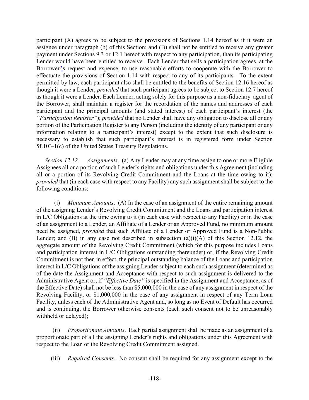 -118- participant (A) agrees to be subject to the provisions of Sections 1.14 hereof as if it were an assignee under paragraph (b) of this Section; and (B) shall not be entitled to receive any greater payment under Sections 9.3 or 12.1 hereof with respect to any participation, than its participating Lender would have been entitled to receive. Each Lender that sells a participation agrees, at the Borrower'’s request and expense, to use reasonable efforts to cooperate with the Borrower to effectuate the provisions of Section 1.14 with respect to any of its participants. To the extent permitted by law, each participant also shall be entitled to the benefits of Section 12.16 hereof as though it were a Lender; provided that such participant agrees to be subject to Section 12.7 hereof as though it were a Lender. Each Lender, acting solely for this purpose as a non-fiduciary agent of the Borrower, shall maintain a register for the recordation of the names and addresses of each participant and the principal amounts (and stated interest) of each participant’s interest (the “Participation Register”); provided that no Lender shall have any obligation to disclose all or any portion of the Participation Register to any Person (including the identity of any participant or any information relating to a participant’s interest) except to the extent that such disclosure is necessary to establish that such participant’s interest is in registered form under Section 5f.103-1(c) of the United States Treasury Regulations. Section 12.12. Assignments. (a) Any Lender may at any time assign to one or more Eligible Assignees all or a portion of such Lender’s rights and obligations under this Agreement (including all or a portion of its Revolving Credit Commitment and the Loans at the time owing to it); provided that (in each case with respect to any Facility) any such assignment shall be subject to the following conditions: (i) Minimum Amounts. (A) In the case of an assignment of the entire remaining amount of the assigning Lender’s Revolving Credit Commitment and the Loans and participation interest in L/C Obligations at the time owing to it (in each case with respect to any Facility) or in the case of an assignment to a Lender, an Affiliate of a Lender or an Approved Fund, no minimum amount need be assigned, provided that such Affiliate of a Lender or Approved Fund is a Non-Public Lender; and (B) in any case not described in subsection (a)(i)(A) of this Section 12.12, the aggregate amount of the Revolving Credit Commitment (which for this purpose includes Loans and participation interest in L/C Obligations outstanding thereunder) or, if the Revolving Credit Commitment is not then in effect, the principal outstanding balance of the Loans and participation interest in L/C Obligations of the assigning Lender subject to each such assignment (determined as of the date the Assignment and Acceptance with respect to such assignment is delivered to the Administrative Agent or, if “Effective Date” is specified in the Assignment and Acceptance, as of the Effective Date) shall not be less than $5,000,000 in the case of any assignment in respect of the Revolving Facility, or $1,000,000 in the case of any assignment in respect of any Term Loan Facility, unless each of the Administrative Agent and, so long as no Event of Default has occurred and is continuing, the Borrower otherwise consents (each such consent not to be unreasonably withheld or delayed); (ii) Proportionate Amounts. Each partial assignment shall be made as an assignment of a proportionate part of all the assigning Lender’s rights and obligations under this Agreement with respect to the Loan or the Revolving Credit Commitment assigned. (iii) Required Consents. No consent shall be required for any assignment except to the