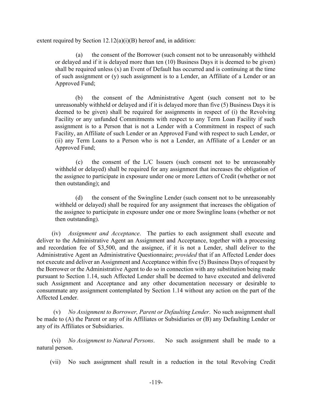 -119- extent required by Section 12.12(a)(i)(B) hereof and, in addition: (a) the consent of the Borrower (such consent not to be unreasonably withheld or delayed and if it is delayed more than ten (10) Business Days it is deemed to be given) shall be required unless (x) an Event of Default has occurred and is continuing at the time of such assignment or (y) such assignment is to a Lender, an Affiliate of a Lender or an Approved Fund; (b) the consent of the Administrative Agent (such consent not to be unreasonably withheld or delayed and if it is delayed more than five (5) Business Days it is deemed to be given) shall be required for assignments in respect of (i) the Revolving Facility or any unfunded Commitments with respect to any Term Loan Facility if such assignment is to a Person that is not a Lender with a Commitment in respect of such Facility, an Affiliate of such Lender or an Approved Fund with respect to such Lender, or (ii) any Term Loans to a Person who is not a Lender, an Affiliate of a Lender or an Approved Fund; (c) the consent of the L/C Issuers (such consent not to be unreasonably withheld or delayed) shall be required for any assignment that increases the obligation of the assignee to participate in exposure under one or more Letters of Credit (whether or not then outstanding); and (d) the consent of the Swingline Lender (such consent not to be unreasonably withheld or delayed) shall be required for any assignment that increases the obligation of the assignee to participate in exposure under one or more Swingline loans (whether or not then outstanding). (iv) Assignment and Acceptance. The parties to each assignment shall execute and deliver to the Administrative Agent an Assignment and Acceptance, together with a processing and recordation fee of $3,500, and the assignee, if it is not a Lender, shall deliver to the Administrative Agent an Administrative Questionnaire; provided that if an Affected Lender does not execute and deliver an Assignment and Acceptance within five (5) Business Days of request by the Borrower or the Administrative Agent to do so in connection with any substitution being made pursuant to Section 1.14, such Affected Lender shall be deemed to have executed and delivered such Assignment and Acceptance and any other documentation necessary or desirable to consummate any assignment contemplated by Section 1.14 without any action on the part of the Affected Lender. (v) No Assignment to Borrower, Parent or Defaulting Lender. No such assignment shall be made to (A) the Parent or any of its Affiliates or Subsidiaries or (B) any Defaulting Lender or any of its Affiliates or Subsidiaries. (vi) No Assignment to Natural Persons. No such assignment shall be made to a natural person. (vii) No such assignment shall result in a reduction in the total Revolving Credit