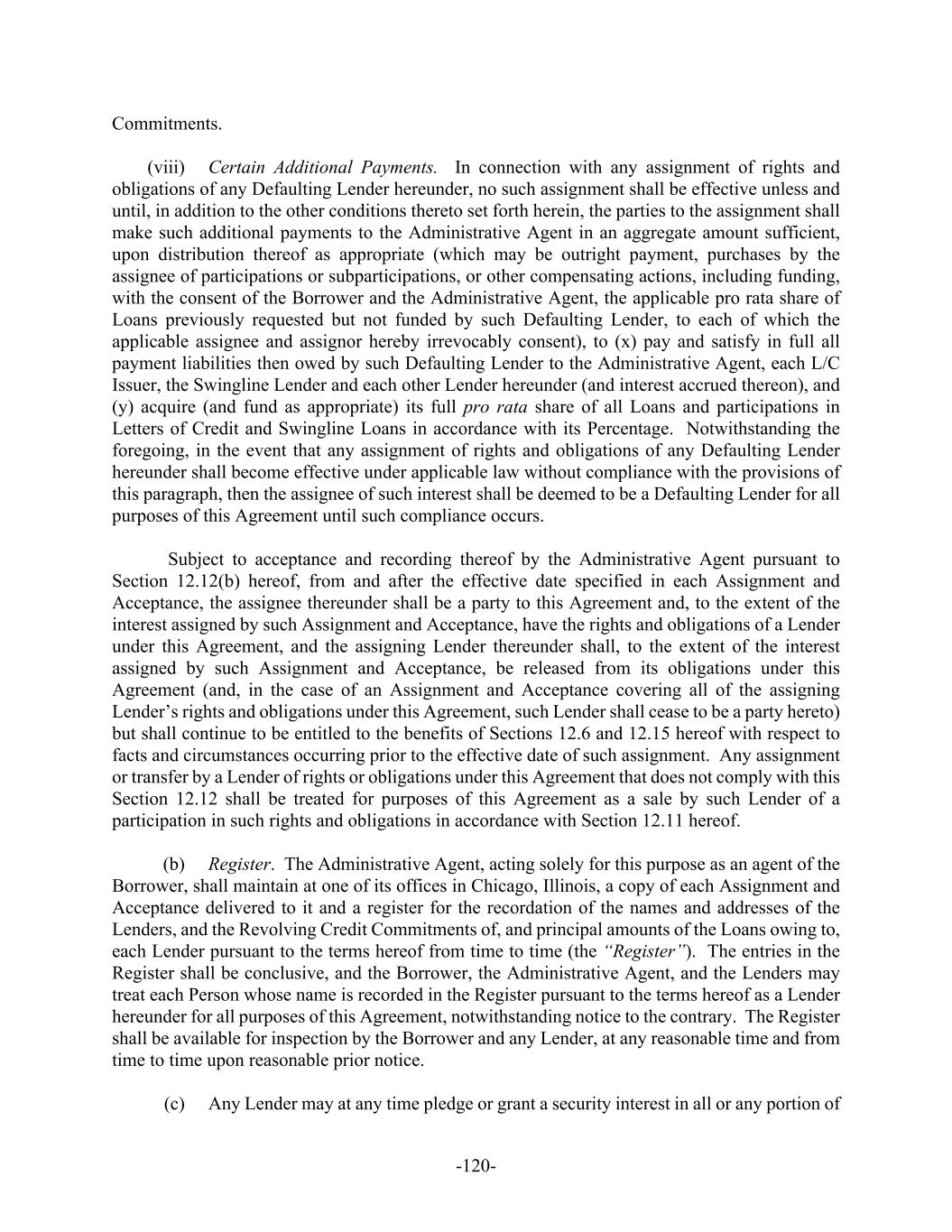 -120- Commitments. (viii) Certain Additional Payments. In connection with any assignment of rights and obligations of any Defaulting Lender hereunder, no such assignment shall be effective unless and until, in addition to the other conditions thereto set forth herein, the parties to the assignment shall make such additional payments to the Administrative Agent in an aggregate amount sufficient, upon distribution thereof as appropriate (which may be outright payment, purchases by the assignee of participations or subparticipations, or other compensating actions, including funding, with the consent of the Borrower and the Administrative Agent, the applicable pro rata share of Loans previously requested but not funded by such Defaulting Lender, to each of which the applicable assignee and assignor hereby irrevocably consent), to (x) pay and satisfy in full all payment liabilities then owed by such Defaulting Lender to the Administrative Agent, each L/C Issuer, the Swingline Lender and each other Lender hereunder (and interest accrued thereon), and (y) acquire (and fund as appropriate) its full pro rata share of all Loans and participations in Letters of Credit and Swingline Loans in accordance with its Percentage. Notwithstanding the foregoing, in the event that any assignment of rights and obligations of any Defaulting Lender hereunder shall become effective under applicable law without compliance with the provisions of this paragraph, then the assignee of such interest shall be deemed to be a Defaulting Lender for all purposes of this Agreement until such compliance occurs. Subject to acceptance and recording thereof by the Administrative Agent pursuant to Section 12.12(b) hereof, from and after the effective date specified in each Assignment and Acceptance, the assignee thereunder shall be a party to this Agreement and, to the extent of the interest assigned by such Assignment and Acceptance, have the rights and obligations of a Lender under this Agreement, and the assigning Lender thereunder shall, to the extent of the interest assigned by such Assignment and Acceptance, be released from its obligations under this Agreement (and, in the case of an Assignment and Acceptance covering all of the assigning Lender’s rights and obligations under this Agreement, such Lender shall cease to be a party hereto) but shall continue to be entitled to the benefits of Sections 12.6 and 12.15 hereof with respect to facts and circumstances occurring prior to the effective date of such assignment. Any assignment or transfer by a Lender of rights or obligations under this Agreement that does not comply with this Section 12.12 shall be treated for purposes of this Agreement as a sale by such Lender of a participation in such rights and obligations in accordance with Section 12.11 hereof. (b) Register. The Administrative Agent, acting solely for this purpose as an agent of the Borrower, shall maintain at one of its offices in Chicago, Illinois, a copy of each Assignment and Acceptance delivered to it and a register for the recordation of the names and addresses of the Lenders, and the Revolving Credit Commitments of, and principal amounts of the Loans owing to, each Lender pursuant to the terms hereof from time to time (the “Register”). The entries in the Register shall be conclusive, and the Borrower, the Administrative Agent, and the Lenders may treat each Person whose name is recorded in the Register pursuant to the terms hereof as a Lender hereunder for all purposes of this Agreement, notwithstanding notice to the contrary. The Register shall be available for inspection by the Borrower and any Lender, at any reasonable time and from time to time upon reasonable prior notice. (c) Any Lender may at any time pledge or grant a security interest in all or any portion of