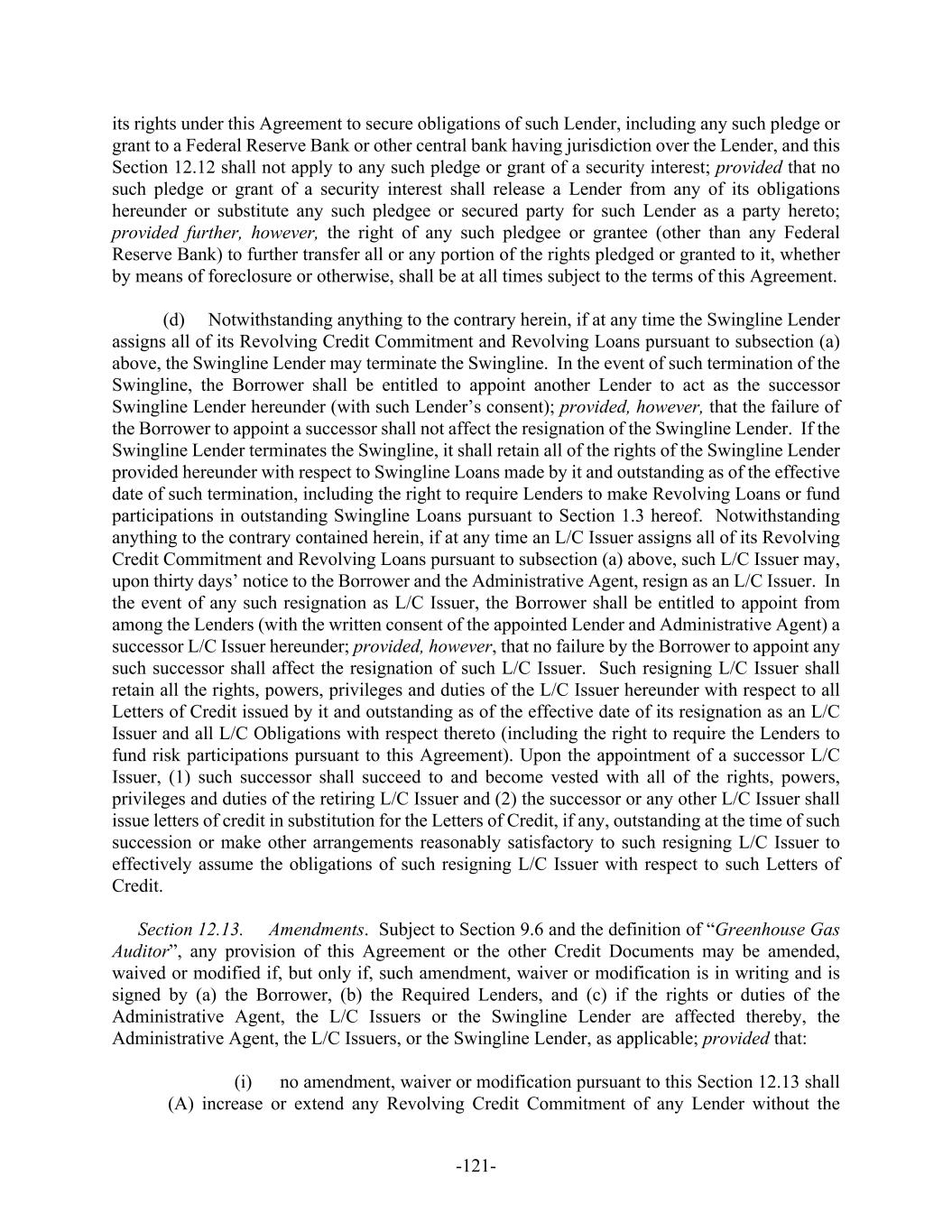 -121- its rights under this Agreement to secure obligations of such Lender, including any such pledge or grant to a Federal Reserve Bank or other central bank having jurisdiction over the Lender, and this Section 12.12 shall not apply to any such pledge or grant of a security interest; provided that no such pledge or grant of a security interest shall release a Lender from any of its obligations hereunder or substitute any such pledgee or secured party for such Lender as a party hereto; provided further, however, the right of any such pledgee or grantee (other than any Federal Reserve Bank) to further transfer all or any portion of the rights pledged or granted to it, whether by means of foreclosure or otherwise, shall be at all times subject to the terms of this Agreement. (d) Notwithstanding anything to the contrary herein, if at any time the Swingline Lender assigns all of its Revolving Credit Commitment and Revolving Loans pursuant to subsection (a) above, the Swingline Lender may terminate the Swingline. In the event of such termination of the Swingline, the Borrower shall be entitled to appoint another Lender to act as the successor Swingline Lender hereunder (with such Lender’s consent); provided, however, that the failure of the Borrower to appoint a successor shall not affect the resignation of the Swingline Lender. If the Swingline Lender terminates the Swingline, it shall retain all of the rights of the Swingline Lender provided hereunder with respect to Swingline Loans made by it and outstanding as of the effective date of such termination, including the right to require Lenders to make Revolving Loans or fund participations in outstanding Swingline Loans pursuant to Section 1.3 hereof. Notwithstanding anything to the contrary contained herein, if at any time an L/C Issuer assigns all of its Revolving Credit Commitment and Revolving Loans pursuant to subsection (a) above, such L/C Issuer may, upon thirty days’ notice to the Borrower and the Administrative Agent, resign as an L/C Issuer. In the event of any such resignation as L/C Issuer, the Borrower shall be entitled to appoint from among the Lenders (with the written consent of the appointed Lender and Administrative Agent) a successor L/C Issuer hereunder; provided, however, that no failure by the Borrower to appoint any such successor shall affect the resignation of such L/C Issuer. Such resigning L/C Issuer shall retain all the rights, powers, privileges and duties of the L/C Issuer hereunder with respect to all Letters of Credit issued by it and outstanding as of the effective date of its resignation as an L/C Issuer and all L/C Obligations with respect thereto (including the right to require the Lenders to fund risk participations pursuant to this Agreement). Upon the appointment of a successor L/C Issuer, (1) such successor shall succeed to and become vested with all of the rights, powers, privileges and duties of the retiring L/C Issuer and (2) the successor or any other L/C Issuer shall issue letters of credit in substitution for the Letters of Credit, if any, outstanding at the time of such succession or make other arrangements reasonably satisfactory to such resigning L/C Issuer to effectively assume the obligations of such resigning L/C Issuer with respect to such Letters of Credit. Section 12.13. Amendments. Subject to Section 9.6 and the definition of “Greenhouse Gas Auditor”, any provision of this Agreement or the other Credit Documents may be amended, waived or modified if, but only if, such amendment, waiver or modification is in writing and is signed by (a) the Borrower, (b) the Required Lenders, and (c) if the rights or duties of the Administrative Agent, the L/C Issuers or the Swingline Lender are affected thereby, the Administrative Agent, the L/C Issuers, or the Swingline Lender, as applicable; provided that: (i) no amendment, waiver or modification pursuant to this Section 12.13 shall (A) increase or extend any Revolving Credit Commitment of any Lender without the