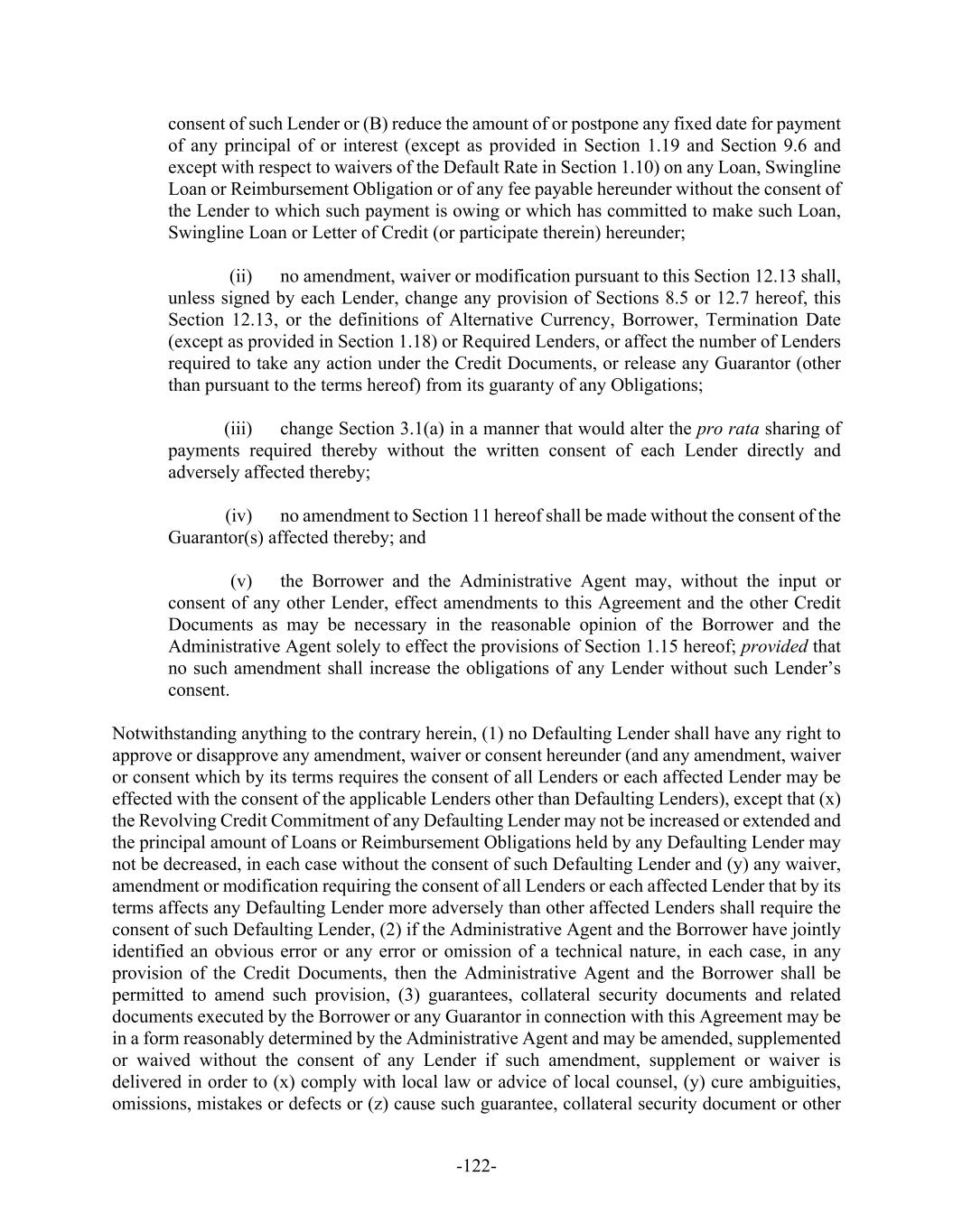 -122- consent of such Lender or (B) reduce the amount of or postpone any fixed date for payment of any principal of or interest (except as provided in Section 1.19 and Section 9.6 and except with respect to waivers of the Default Rate in Section 1.10) on any Loan, Swingline Loan or Reimbursement Obligation or of any fee payable hereunder without the consent of the Lender to which such payment is owing or which has committed to make such Loan, Swingline Loan or Letter of Credit (or participate therein) hereunder; (ii) no amendment, waiver or modification pursuant to this Section 12.13 shall, unless signed by each Lender, change any provision of Sections 8.5 or 12.7 hereof, this Section 12.13, or the definitions of Alternative Currency, Borrower, Termination Date (except as provided in Section 1.18) or Required Lenders, or affect the number of Lenders required to take any action under the Credit Documents, or release any Guarantor (other than pursuant to the terms hereof) from its guaranty of any Obligations; (iii) change Section 3.1(a) in a manner that would alter the pro rata sharing of payments required thereby without the written consent of each Lender directly and adversely affected thereby; (iv) no amendment to Section 11 hereof shall be made without the consent of the Guarantor(s) affected thereby; and (v) the Borrower and the Administrative Agent may, without the input or consent of any other Lender, effect amendments to this Agreement and the other Credit Documents as may be necessary in the reasonable opinion of the Borrower and the Administrative Agent solely to effect the provisions of Section 1.15 hereof; provided that no such amendment shall increase the obligations of any Lender without such Lender’s consent. Notwithstanding anything to the contrary herein, (1) no Defaulting Lender shall have any right to approve or disapprove any amendment, waiver or consent hereunder (and any amendment, waiver or consent which by its terms requires the consent of all Lenders or each affected Lender may be effected with the consent of the applicable Lenders other than Defaulting Lenders), except that (x) the Revolving Credit Commitment of any Defaulting Lender may not be increased or extended and the principal amount of Loans or Reimbursement Obligations held by any Defaulting Lender may not be decreased, in each case without the consent of such Defaulting Lender and (y) any waiver, amendment or modification requiring the consent of all Lenders or each affected Lender that by its terms affects any Defaulting Lender more adversely than other affected Lenders shall require the consent of such Defaulting Lender, (2) if the Administrative Agent and the Borrower have jointly identified an obvious error or any error or omission of a technical nature, in each case, in any provision of the Credit Documents, then the Administrative Agent and the Borrower shall be permitted to amend such provision, (3) guarantees, collateral security documents and related documents executed by the Borrower or any Guarantor in connection with this Agreement may be in a form reasonably determined by the Administrative Agent and may be amended, supplemented or waived without the consent of any Lender if such amendment, supplement or waiver is delivered in order to (x) comply with local law or advice of local counsel, (y) cure ambiguities, omissions, mistakes or defects or (z) cause such guarantee, collateral security document or other